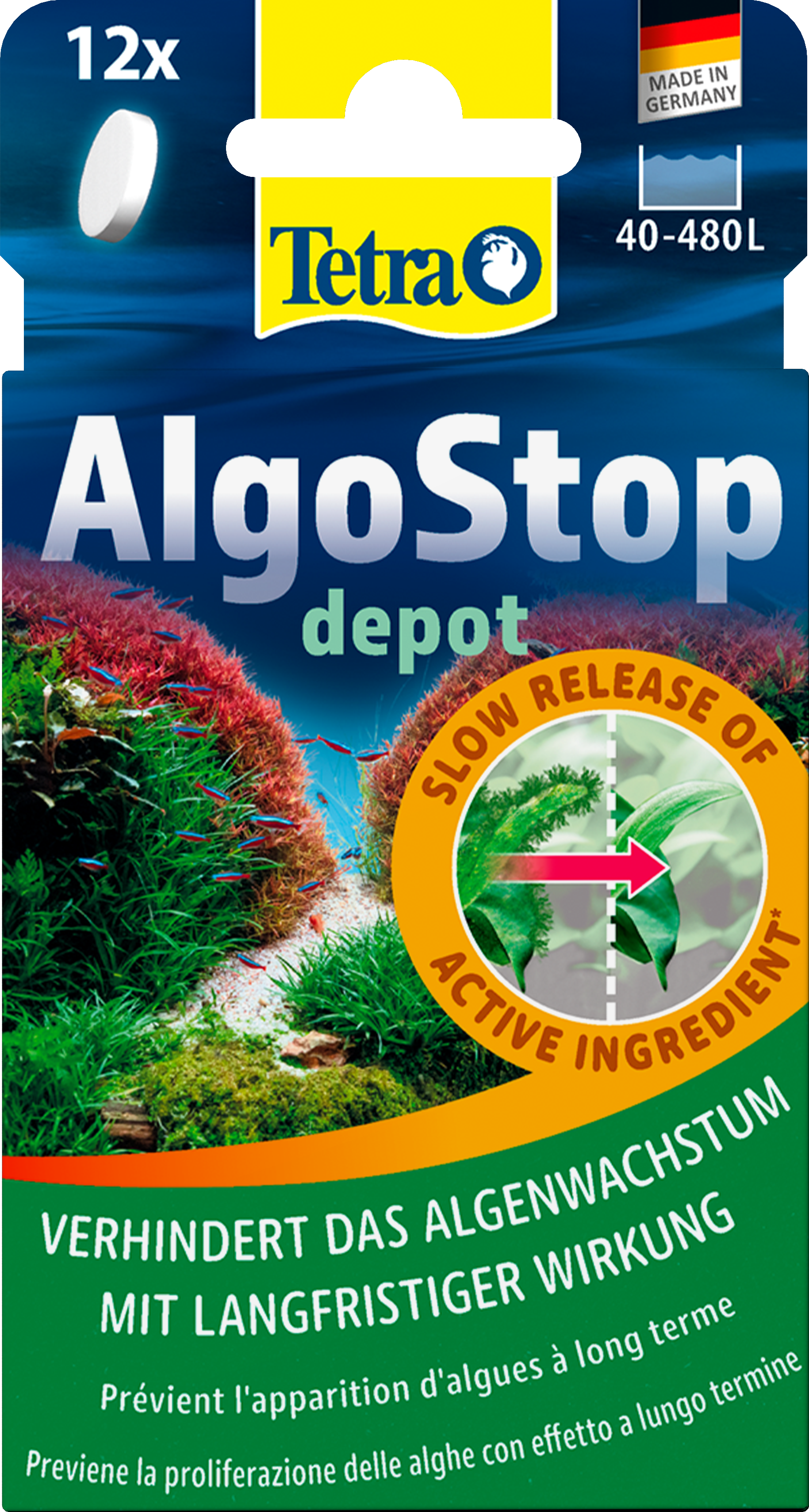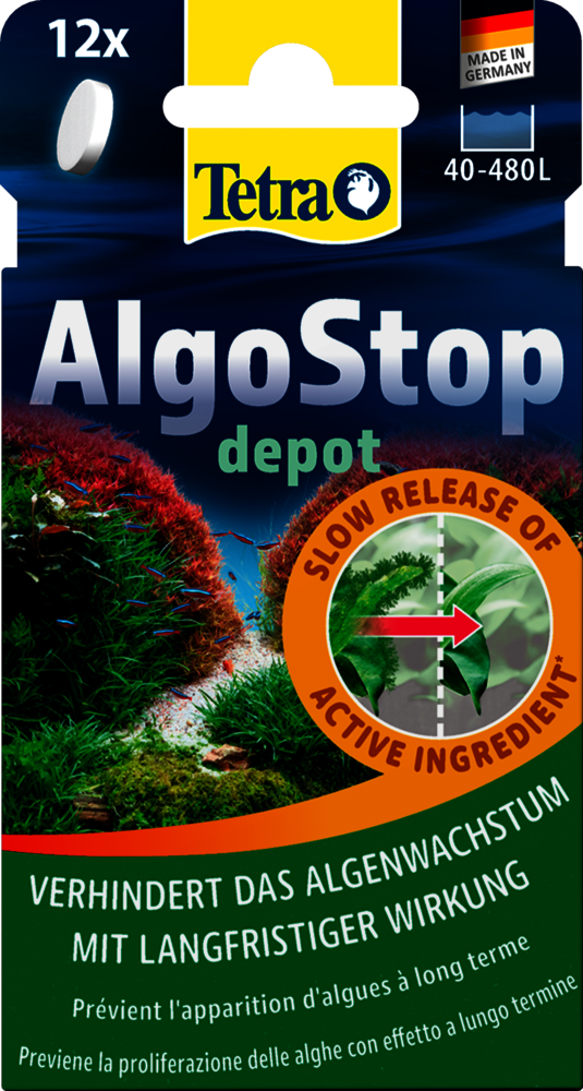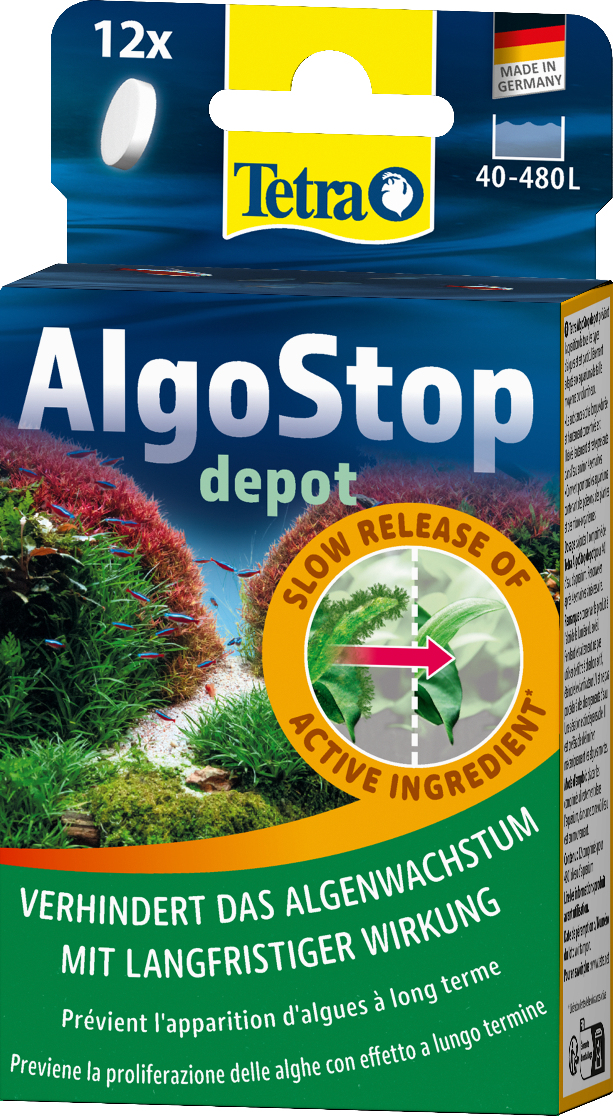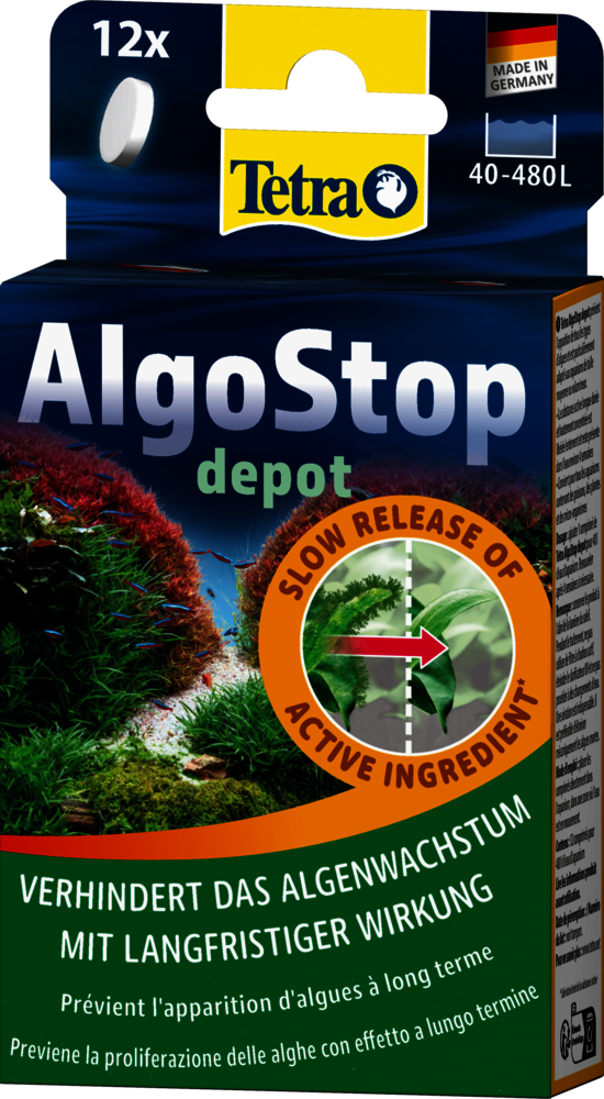Tetra AlgoStop depot* offre une prévention fiable et durable contre les algues présentes dans les aquariums d’eau douce de 40 L ou plus, en libérant lentement une dose élevée de principe actif pendant environ quatre semaines. Sans colorer ni troubler l’eau, le produit attaque le métabolisme des algues pour empêcher la croissance de toutes les espèces. Tetra AlgoStop depot* reste sans danger pour les poissons, les plantes et les micro-organismes bénéfiques, à condition de suivre le mode d’emploi. Conservez le produit à l’abri de la lumière directe du soleil et, pendant le traitement, éteignez les clarificateurs UV, évitez la filtration au charbon actif et abstenez-vous de changer l’eau. Maintenez une bonne aération (par exemple avec une pompe à air Tetra APS) et éliminez manuellement les algues mortes afin de préserver la qualité de l’eau. Pour appliquer le produit, ajoutez simplement un comprimé de Tetra AlgoStop depot* par volume de 40 L d’eau d’aquarium directement dans une zone où l’eau circule bien, et répétez l’opération au bout de quatre semaines si nécessaire. Après le traitement, vous pouvez prévenir de futures invasions en réduisant la teneur en phosphate et en nitrate à l’aide de produits tels que Tetra EasyBalance, ou traiter les invasions sévères avec des solutions rapides comme Tetra AlguMin* ou Tetra Algizit*.