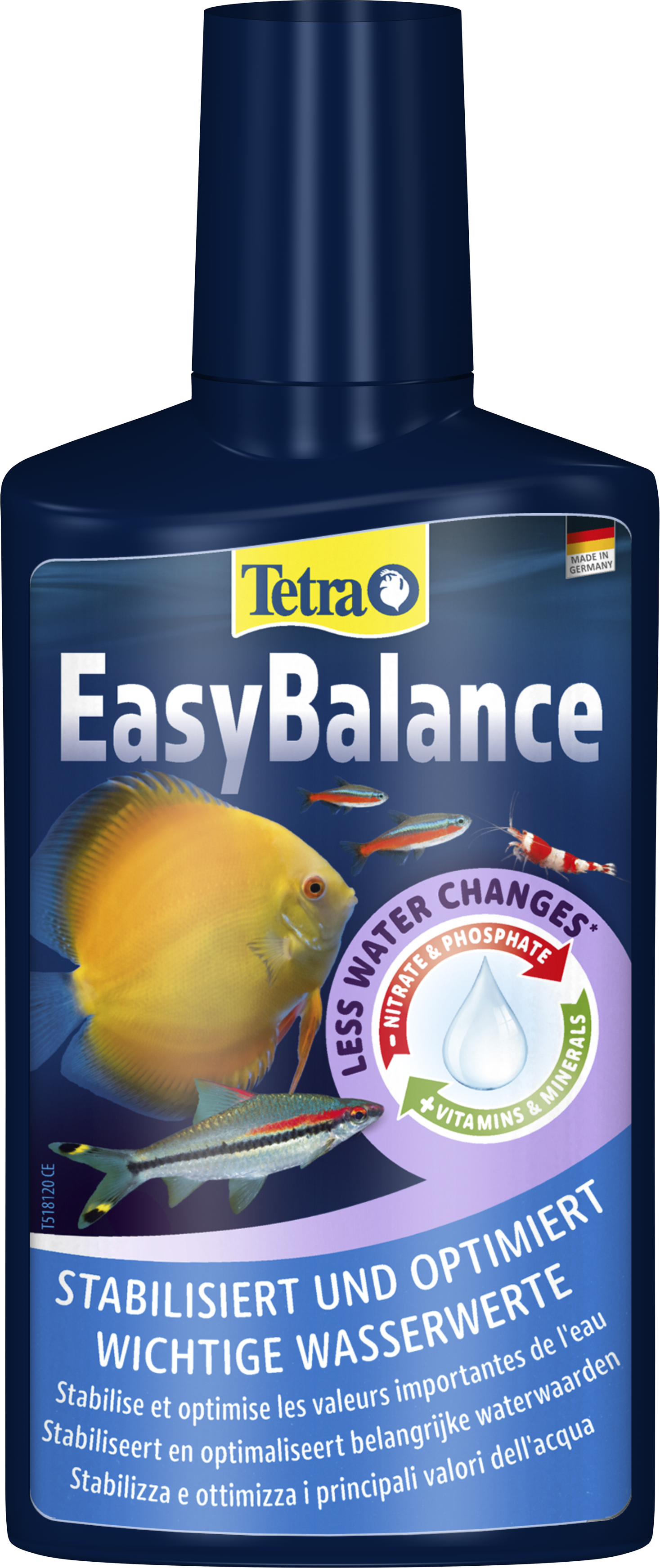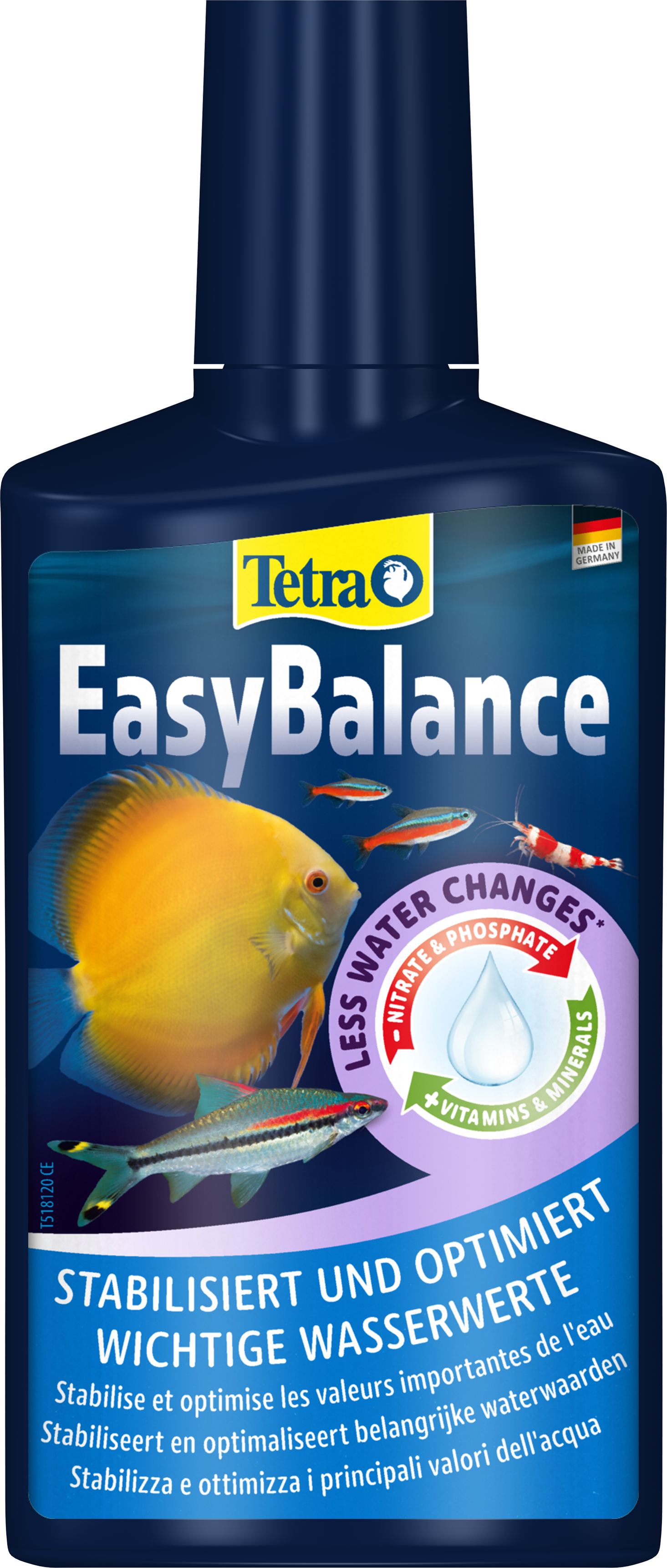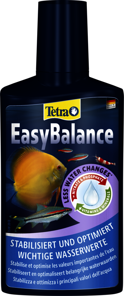 Tetra EasyBalance est une solution unique pour l'entretien de l'eau qui maintient l'équilibre et la santé de votre aquarium avec un effort minimal. Elle peut être utilisée par les débutants comme par les aquariophiles confirmés. En stabilisant de manière efficace les caractéristiques importantes de l'eau comme la dureté carbonatée (KH) et le pH, Tetra EasyBalance facilite l'entretien de votre aquarium. Les aquariums d'eau à faible dureté, notamment ceux qui abritent des espèces sensibles comme les discus, bénéficient particulièrement de l'effet stabilisateur du KH, car il garantit des conditions de vie stables et sûres au fil du temps. La réduction de substances telles que les nitrates et les phosphates empêche non seulement la prolifération des algues, mais protège également les poissons et les plantes du stress, ce qui leur permet de s'épanouir dans un environnement stable et naturel. L'utilisation hebdomadaire de Tetra EasyBalance permet d'espacer les changements d'eau partiels. Vous gagnez ainsi du temps et réduisez la consommation d'eau, ce qui contribue à une aquariophilie plus respectueuse de l'environnement. De plus, Tetra EasyBalance enrichit l'eau de l'aquarium en vitamines, en oligo-éléments et en minéraux essentiels, substances dont les poissons, les invertébrés et les plantes ont besoin pour vivre en bonne santé. Pour de meilleurs résultats, agitez Tetra EasyBalance avant l'utilisation, et ajoutez le produit une fois par semaine (dosage : 2,5 ml pour 10 l d'eau d'aquarium). Un apport suffisant en oxygène est indispensable, par exemple en utilisant les pompes à air Tetra APS. Dans le liquide, des granules pâles peuvent être visibles ; ils coulent au fond de l'aquarium et sont totalement inoffensifs pour les poissons et les invertébrés, même s'ils sont ingérés. Notez que Tetra EasyBalance n'est pas un conditionneur d'eau du robinet. Il doit toujours être utilisé en association avec Tetra AquaSafe chaque fois que de l'eau du robinet est ajoutée. Vérifiez régulièrement les caractéristiques de l'eau dans votre aquarium avec le Tetra Test 7in1.