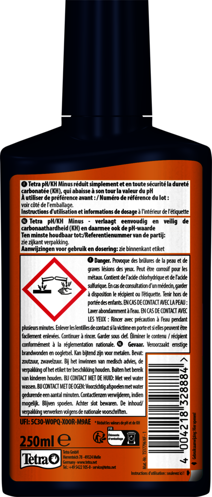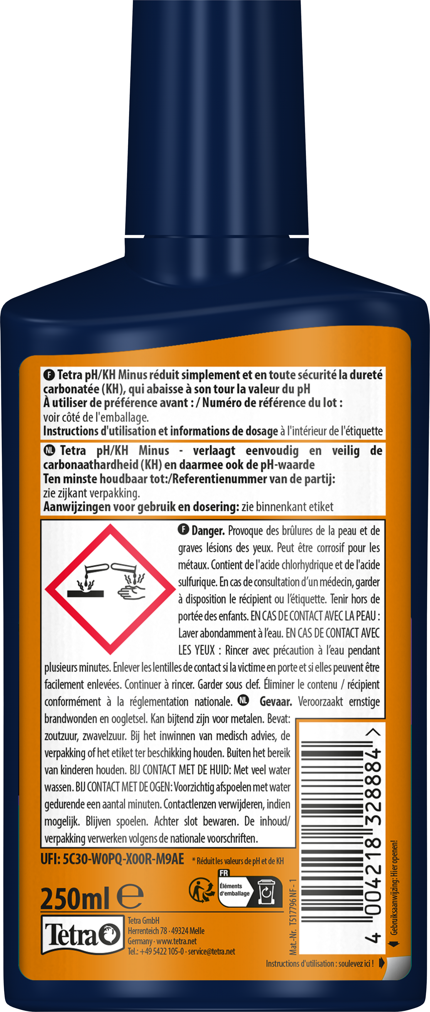 Tetra pH/KH Minus est une solution fiable pour réduire en toute sécurité la dureté carbonatée (KH) dans votre aquarium. Lorsque le KH diminue, la valeur du pH diminue aussi automatiquement, créant ainsi des paramètres de l'eau optimaux pour certaines espèces de poissons. De nombreux poissons d'ornement d'eau douce prospèrent dans des environnements où le KH est de 4 °dH et le pH est inférieur à 7,5, ce qui rend ce produit essentiel pour maintenir des conditions de vie adéquates. Pour utiliser Tetra pH/KH Minus, ajoutez jusqu'à 25 ml pour 100 litres d'eau d'aquarium, en utilisant le bouchon doseur pour une mesure précise. Répétez l'opération tous les 2 à 3 jours jusqu'à ce que le niveau de KH souhaité soit atteint, chaque dose abaissant le KH d'environ 2 °dH. Pendant le traitement, assurez une bonne aération en utilisant la gamme Tetra APS et évitez d'ajouter du CO2. Utilisez par exemple Tetra Test 7in1 pour déterminer les paramètres de l'eau de votre aquarium. Il est important de tester régulièrement les paramètres de l'eau pour maintenir les niveaux de KH entre 2 et 4 °dH afin d'éviter des chutes importantes du pH. Pour une gestion à long terme du KH et du pH, ajoutez 5 ml par 100 litres tous les 2 à 3 jours, ce qui réduira progressivement le KH d'environ 0,4 °dH par dose. Une utilisation régulière permettra d'obtenir des conditions d'eau stables pour vos poissons. Veuillez manipuler Tetra pH/KH Minus avec précaution, car il peut provoquer de graves brûlures de la peau et des lésions oculaires. Tenez-le hors de portée des enfants et, si un avis médical est nécessaire, ayez à disposition le contenant ou l'étiquette du produit. En cas de contact avec la peau ou les yeux, rincez abondamment à l'eau. Tetra pH/KH Minus est un moyen efficace de gérer la qualité de l'eau de votre aquarium, garantissant un environnement approprié à vos organismes aquatiques.