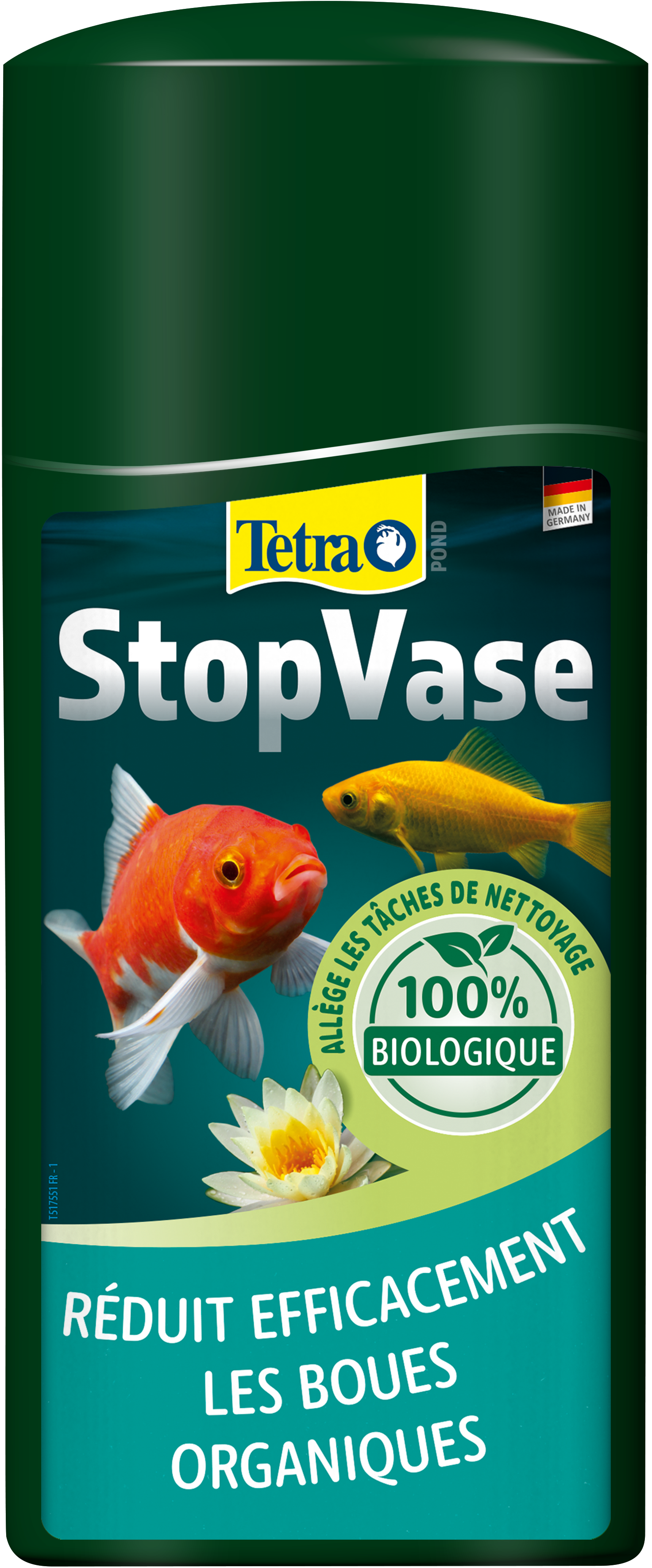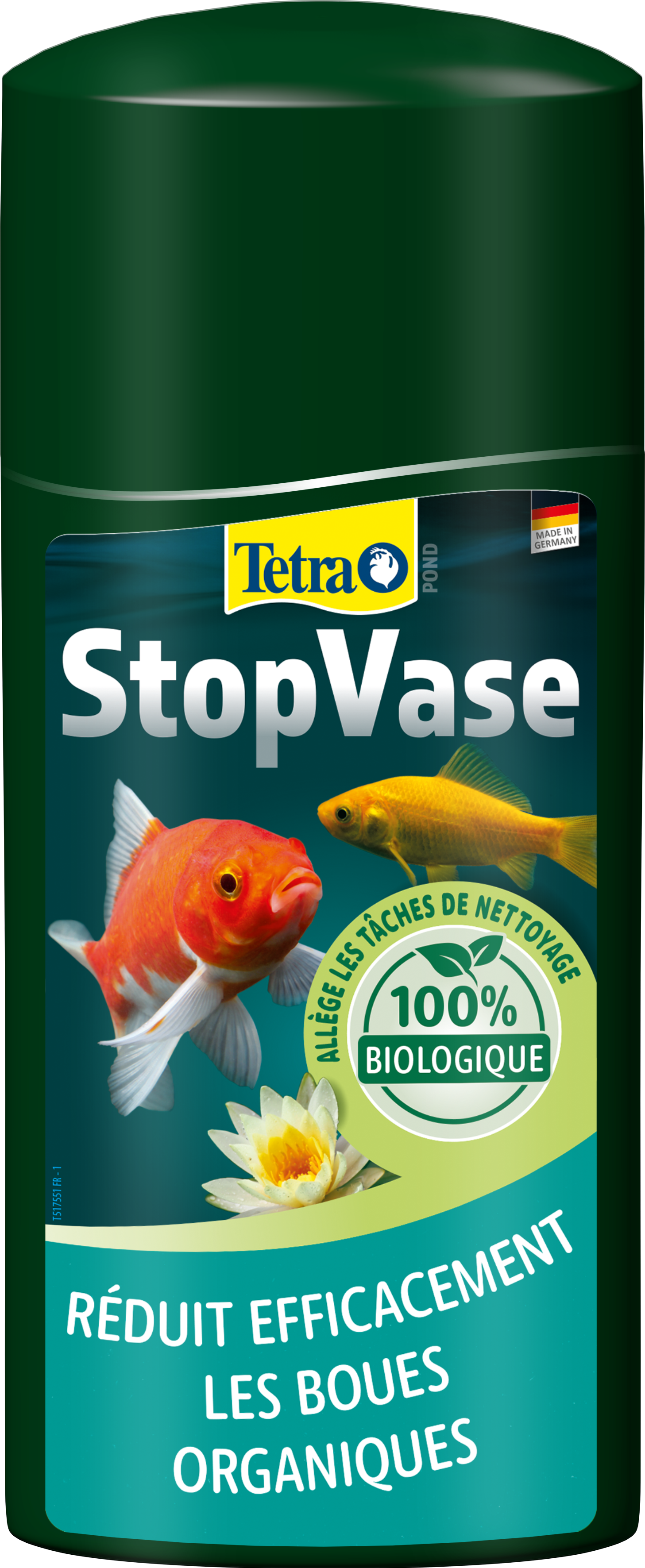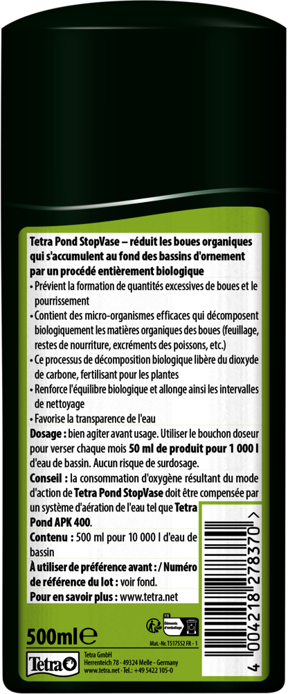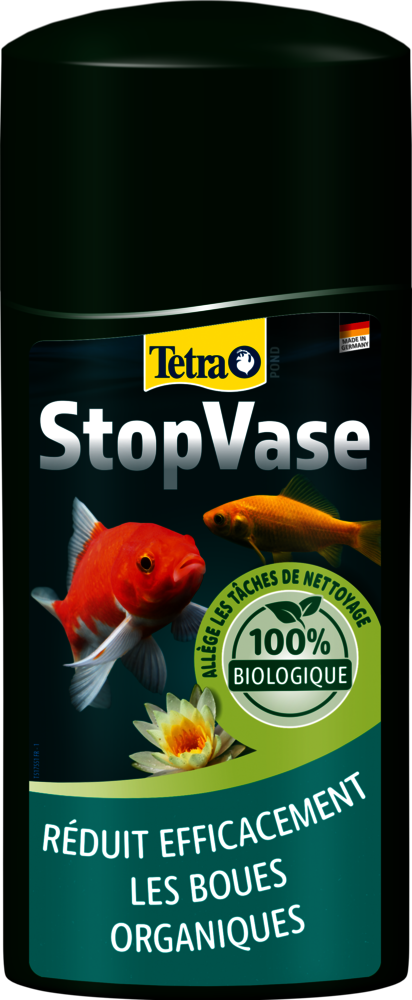 Tetra Pond StopVase est l'outil idéal pour prévenir la formation excessive de boues et les processus de décomposition de votre bassin de jardin. Le liquide d'entretien de l'eau contient des micro-organismes efficaces qui décomposent biologiquement les substances organiques des boues, notamment le feuillage, les aliments non consommés ou les matières fécales des poissons. Ce processus de décomposition biologique libère du dioxyde de carbone qui agit comme un engrais naturel pour les plantes. Grâce à ce mode de fonctionnement, Tetra Pond StopVase renforce l'équilibre biologique de votre bassin d'ornement et augmente la profondeur de visibilité de l'eau du bassin. En outre, il vous facilite le travail en prolongeant les intervalles de nettoyage de votre bassin. Pour obtenir un résultat optimal, agitez bien le produit avant de l'utiliser et suivez les instructions fournies. Le bouchon doseur fourni vous permettra de doser facilement Tetra Pond StopVase. Utilisez le bouchon doseur et ajoutez 50 ml pour 1 000 l d'eau de bassin et renouvelez ce dosage tous les mois. En cas de surdosage accidentel, pas d'inquiétude : cela n'aura pas d'impact négatif sur votre bassin d'ornement. Tetra recommande de compenser la consommation d'oxygène causée par le mode d'action de Tetra Pond StopVase par un système d'aération de l'eau tel que Tetra Pond APK 400.