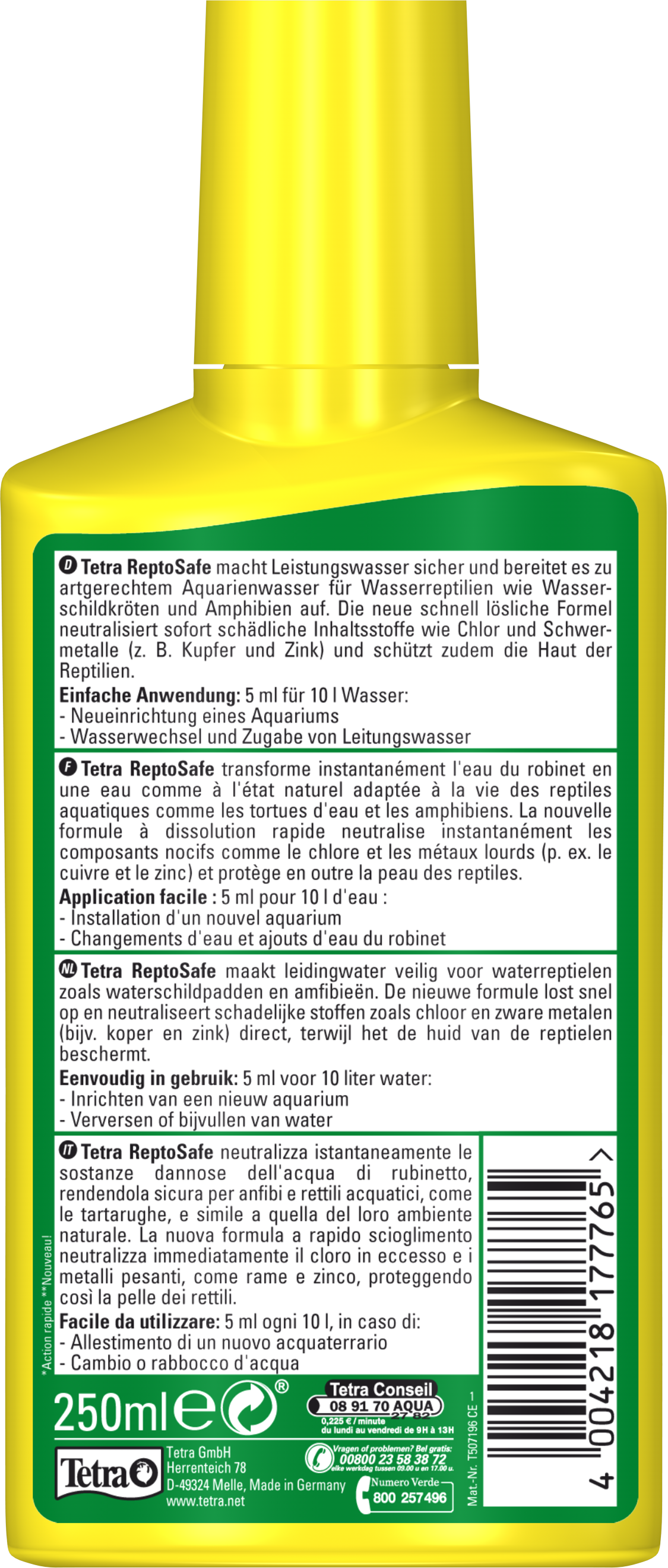 Tetra ReptoSafe adapte l'eau du robinet aux différentes espèces de reptiles aquatiques en reproduisant l'eau qu'ils trouvent dans leur environnement naturel. Il neutralise immédiatement les substances nocives tels que le chlore, les chloramines et les métaux lourds (par exemple, le cuivre et le zinc) présentes dans l'eau du robinet. De plus, les vitamines et substances vitales qu'il contient protègent la peau des reptiles tout en favorisant leur santé. Tetra ReptoSafe assure des changements d'eau sans stress et une vie saine dans l'aquaterrarium. Grâce à sa formule à dissolution rapide et à son dosage simple, il est facile à utiliser pour le démarrage d'un nouvel aquaterrarium ou les changements d'eau et lors de l'ajout d'eau du robinet.