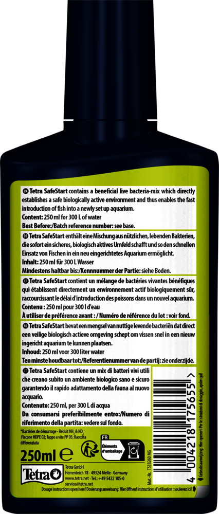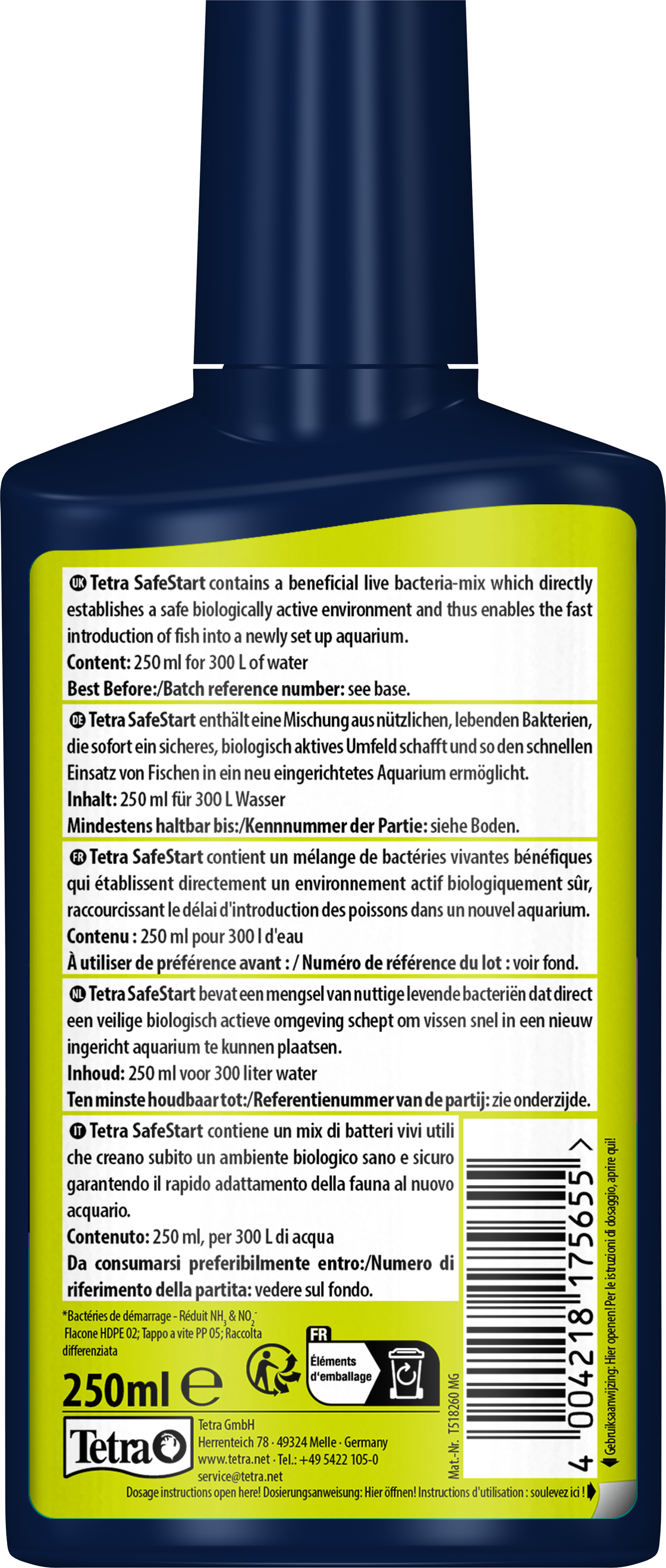 Tetra SafeStart vous permet d'introduire des poissons tropicaux dans un nouvel aquarium sans la longue phase de rodage habituelle. Son mélange unique de bactéries vivantes crée un environnement sûr et biologiquement actif qui agit comme un « starter ». En établissant rapidement l'équilibre biologique, Tetra SafeStart évite les pics de nitrites, qui se produisent souvent dans les aquariums récemment mis en eau et qui peuvent entraîner des pertes s'ils ne sont pas décomposés à temps. Les bactéries présentes dans Tetra SafeStart réduisent naturellement les niveaux nocifs d'ammoniac et de nitrites, ce qui permet de protéger rapidement les poissons contre le stress et les maladies. Tetra SafeStart n'est pas seulement recommandé pour la mise en eau d'un nouvel aquarium, mais aussi dans les situations où l'équilibre bactérien est potentiellement perturbé, par exemple après un traitement médicamenteux, après un changement d'eau ou lorsque les cultures bactériennes présentes dans le filtre ont été perdues. Dans tous ces cas, Tetra SafeStart aide à rétablir un environnement biologique sûr de manière rapide et fiable. Agitez le flacon avant toute utilisation. Ajoutez 5 ml de Tetra SafeStart pour 6 l d'eau d'aquarium. La température minimale recommandée pour le traitement est de 20 °C. Un nombre restreint de poissons peut ensuite être introduit, et l'alimentation doit être limitée pendant les deux premières semaines, par exemple avec TetraMin. Ajoutez toujours Tetra AquaSafe pour neutraliser les substances nocives telles que le chlore, le cuivre et d'autres substances souvent présentes dans l'eau du robinet. Pour des résultats optimaux, Tetra SafeStart doit être conservé à température ambiante, idéalement autour de 8 °C. Évitez d'exposer le produit à des températures supérieures à 30 °C ou inférieures à 2 °C afin de préserver l'efficacité des bactéries.