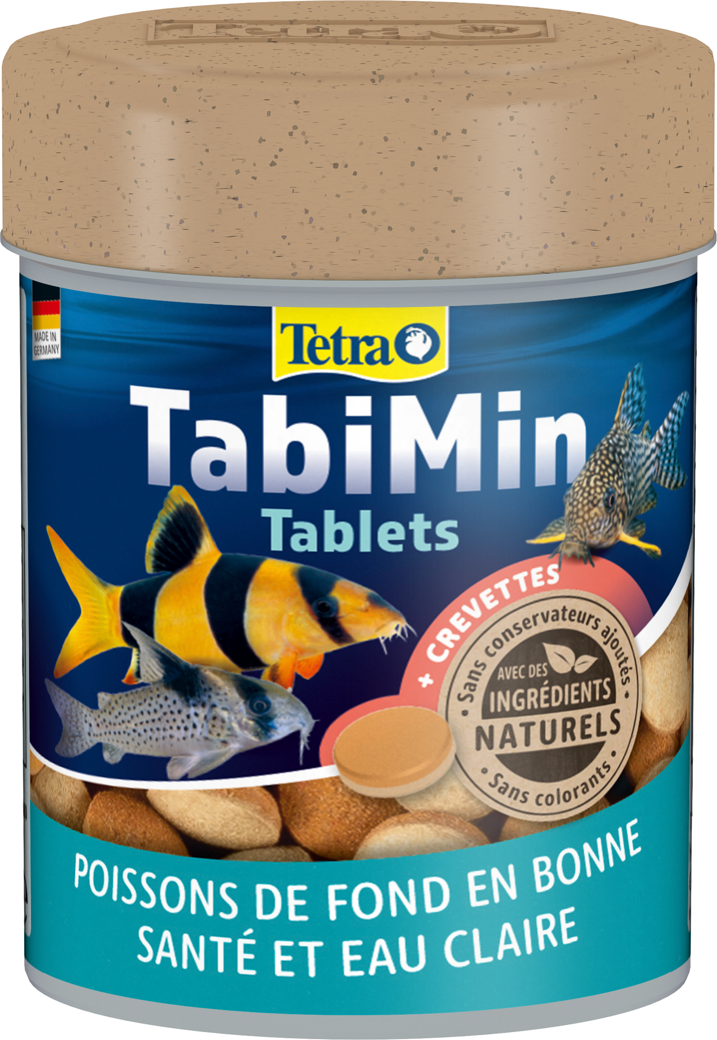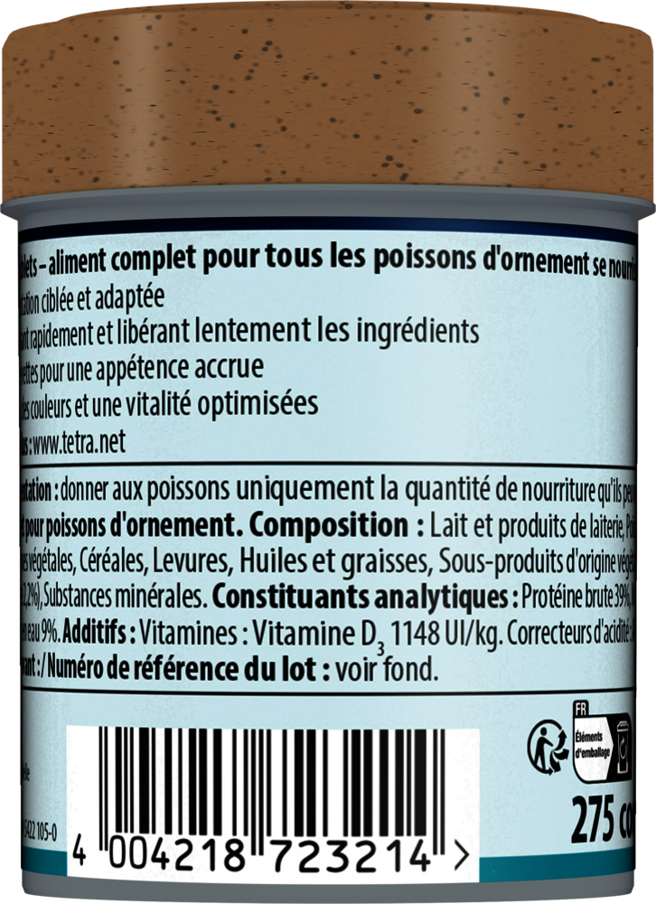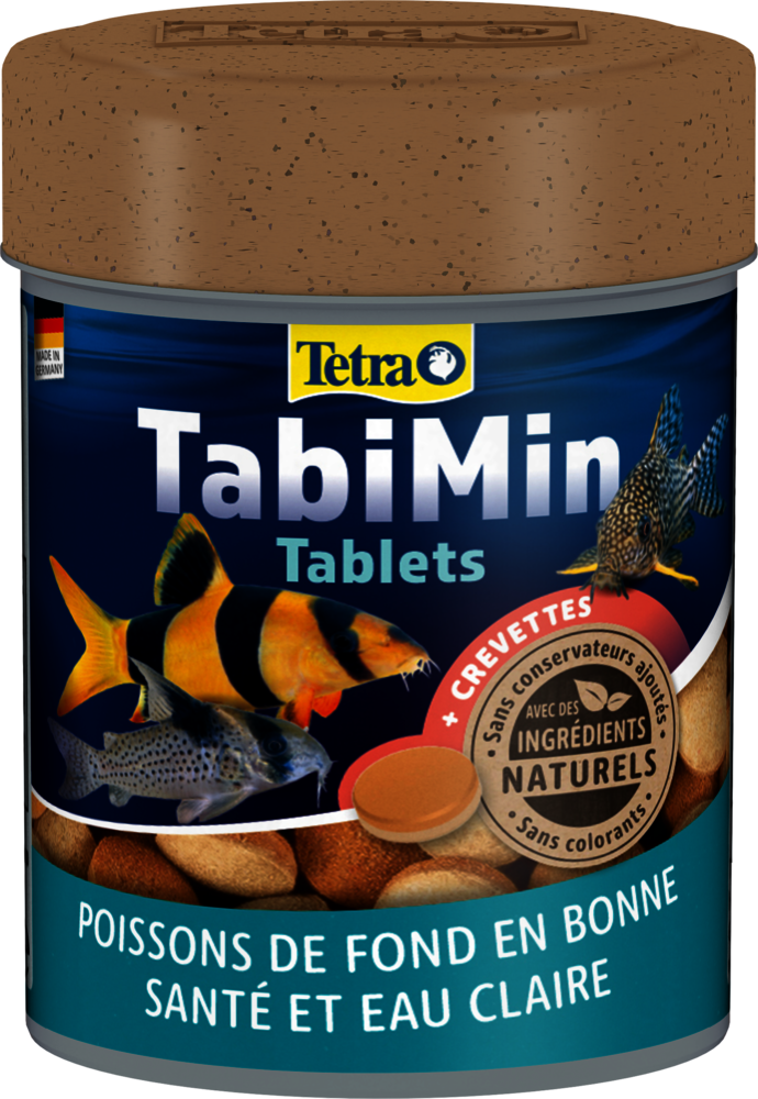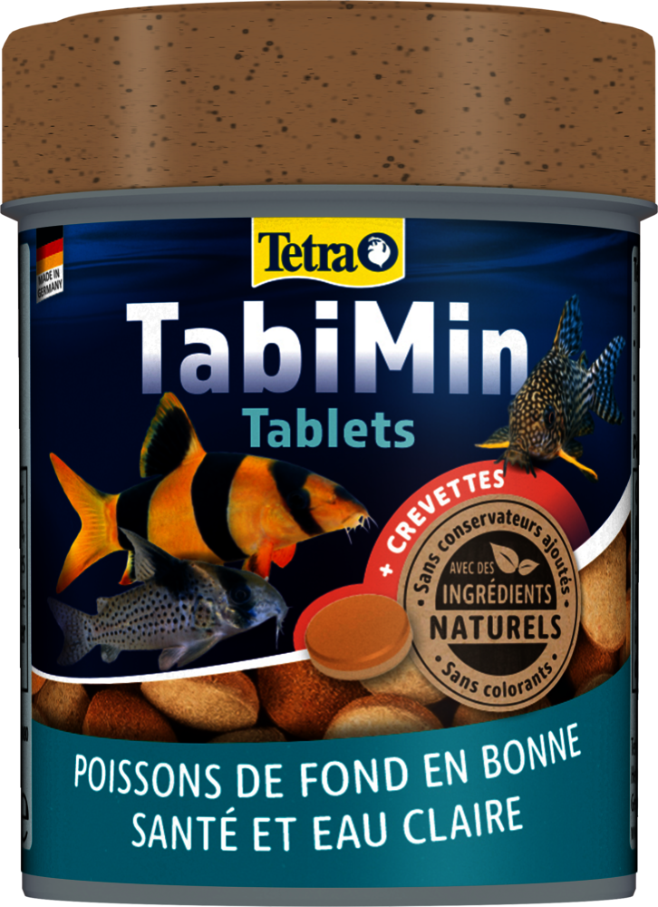 La nourriture équilibrée en tablettes Tetra TabiMin offre à vos poissons de fond farouches une alimentation optimale et variée. Les tablettes coulent rapidement et peuvent être placées à des endroits stratégiques pour permettre aux poissons farouches de se nourrir sans être dérangés. Grâce à la forme des tablettes, la nourriture se libère lentement dans l'eau. Les multi-tablettes Tetra TabiMin sont bicolores. La face orange contient des caroténoïdes qui renforcent l'éclat des couleurs. La face jaune/beige contient de l'huile de poisson de grande qualité, source d'acides gras oméga-3, ainsi que des minéraux et des oligo-éléments essentiels. L'ajout de crevettes rend cet aliment encore plus appétissant pour vos poissons. La recette exclusive de Tetra TabiMin, sans colorants ni conservateurs ajoutés, favorise non seulement une bonne santé, mais améliore également la vitalité de vos poissons. Grâce à sa composition facile à ingérer, Tetra TabiMin est très digeste et contribue ainsi à préserver la propreté de l'eau et à stabiliser sa qualité.
