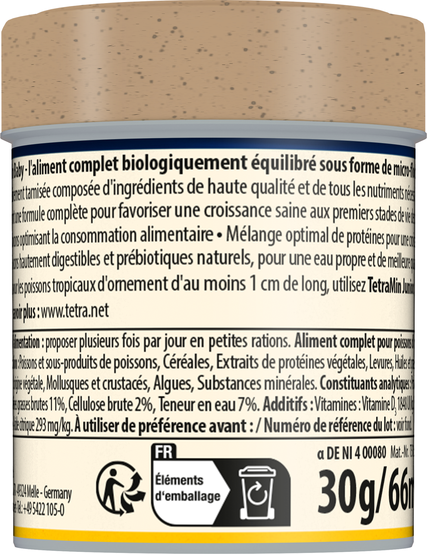 TetraMin Baby est un micro-aliment biologiquement équilibré composé de flocons très finement tamisés. Cette recette complète est idéale pour l'alimentation quotidienne des alevins de poissons d'ornement (jusqu'à 1 cm de long). Ce mélange soigneusement sélectionné contient des nutriments fonctionnels de haute qualité ainsi que des vitamines, des minéraux et des oligo-éléments essentiels. Cette recette renferme des prébiotiques qui améliorent les fonctions corporelles des poissons et l'assimilation des aliments. Ces flocons favorisent une croissance saine des poissons, en particulier aux premiers stades de leur vie, ainsi qu'une résilience accrue. Cette recette unique, à base d'ingrédients naturels de haute qualité, sans colorants ni conservateurs ajoutés, renforce le système immunitaire et améliore la qualité de l'eau. Avec TetraMin Baby, vos poissons d'ornement prospéreront et l'eau de votre aquarium restera propre et claire.