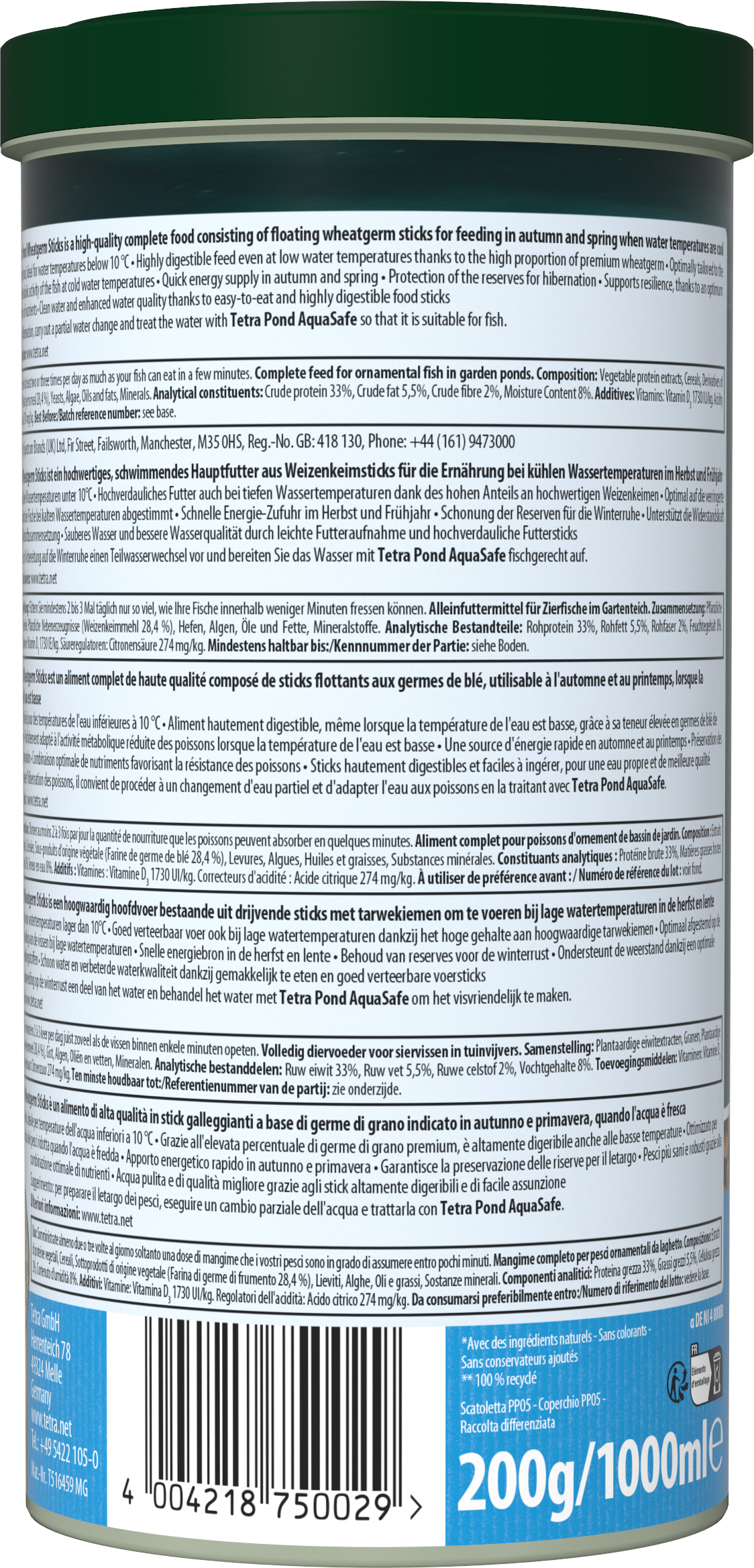 A Tetra Pond Wheatgerm Sticks búzacsíra rúd teljes értékű eledel, amely ideális a tavi halak etetésére a hűvösebb hónapokban, amikor a víz hőmérséklete 10 °C alá süllyed. A nagy arányú prémium búzacsírát tartalmazó, jól emészthető táprudacskák gyors energiát biztosítanak, és optimálisan igazodnak a halak csökkent anyagcsere-aktivitásához alacsonyabb hőmérsékleten.