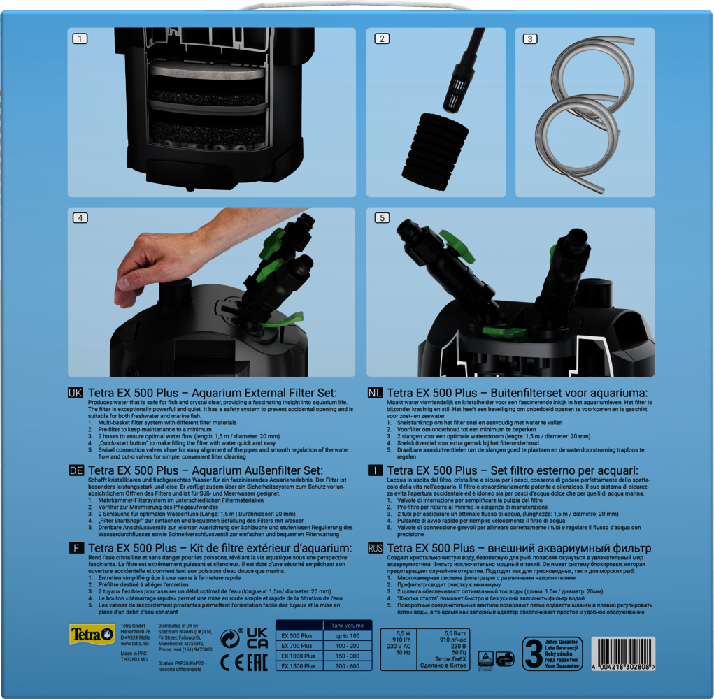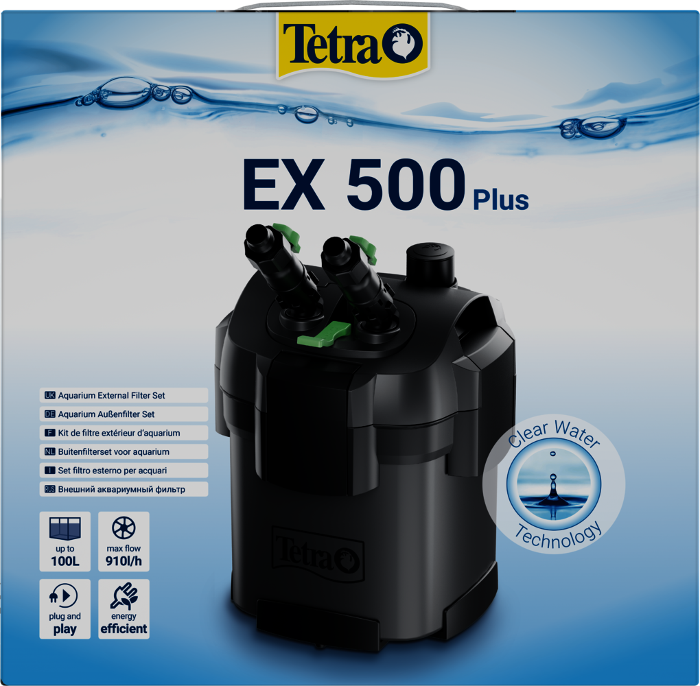 De Tetra EX 500 Plus complete buitenfilterset zorgt voor een uitstekende waterkwaliteit voor vissen in aquaria met een inhoud tot 100 liter. Het uit meerdere korven opgebouwde systeem en verschillende filtermaterialen reinigen het aquariumwater op betrouwbare en efficiënte wijze door overtollige voedingsstoffen af te breken.