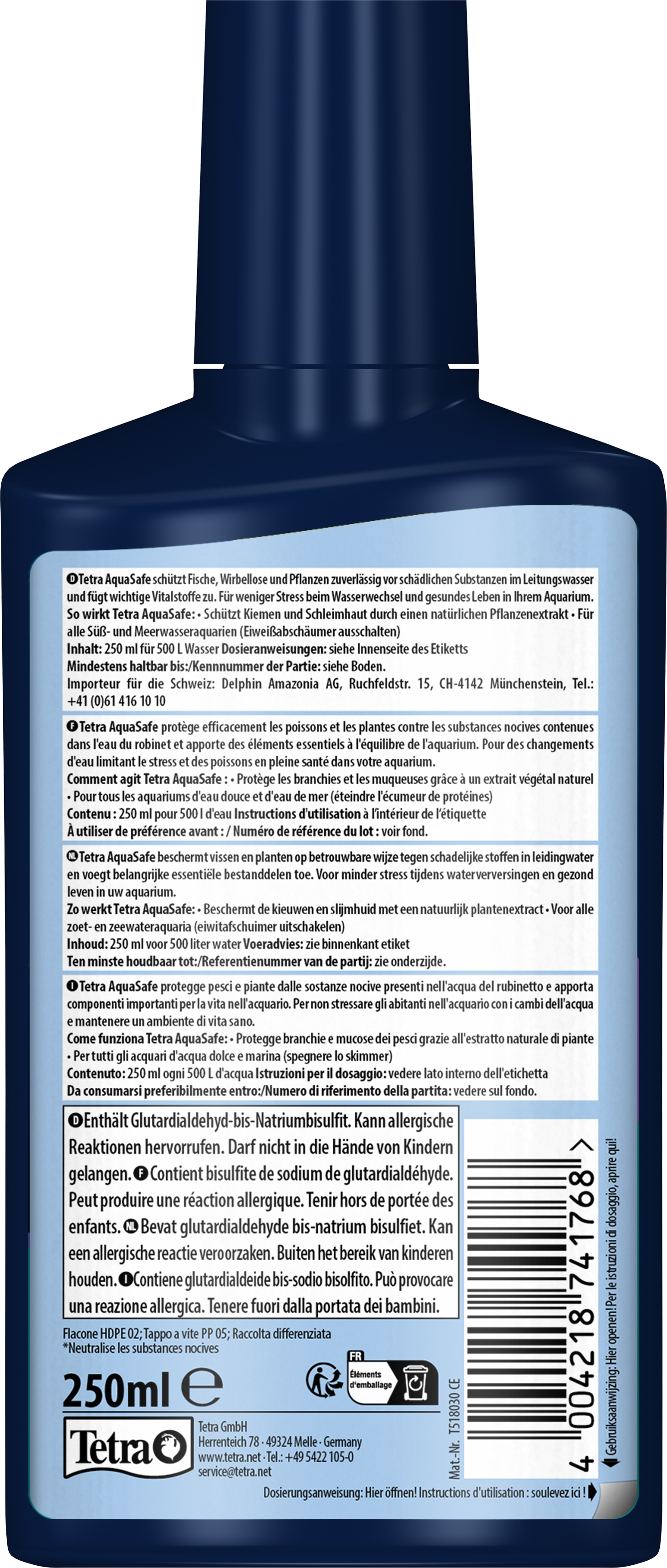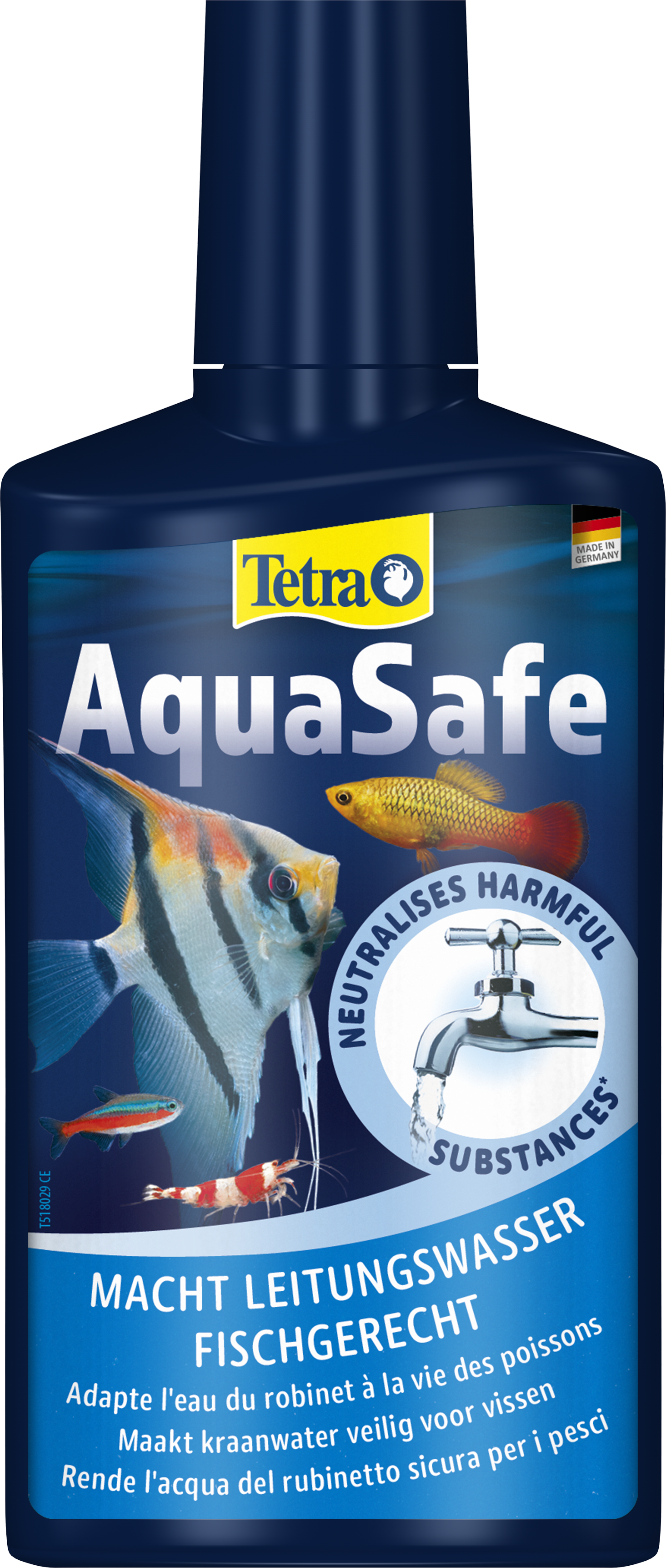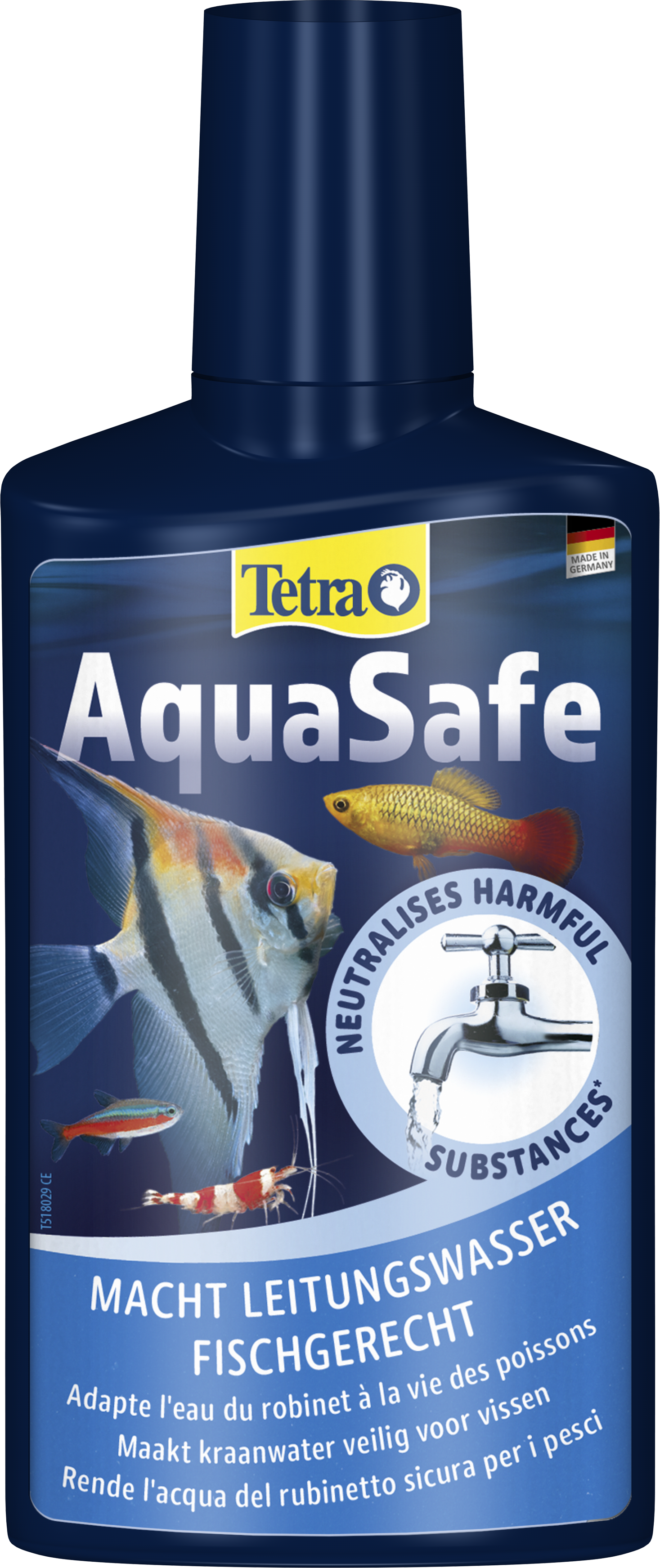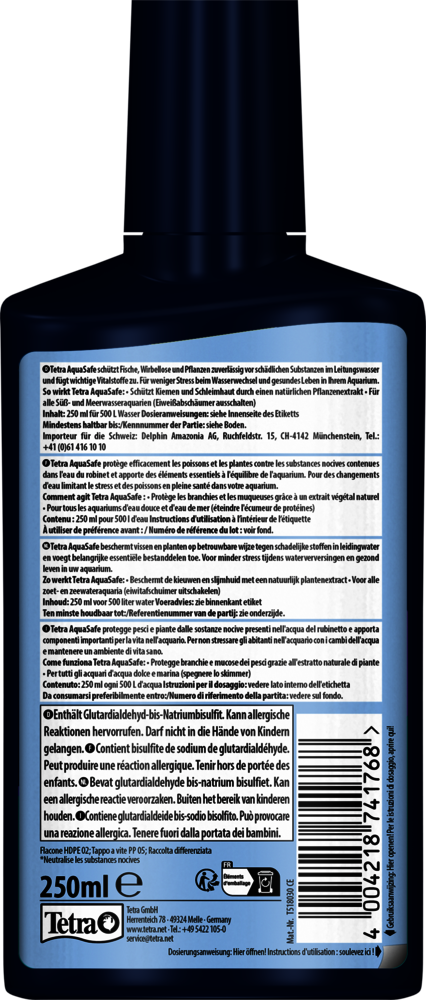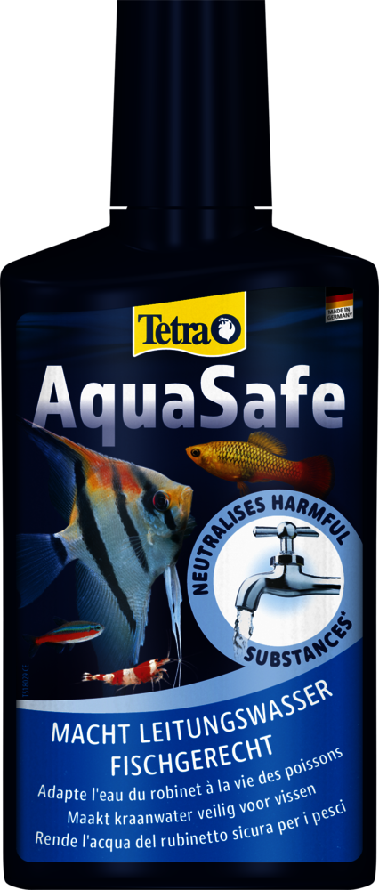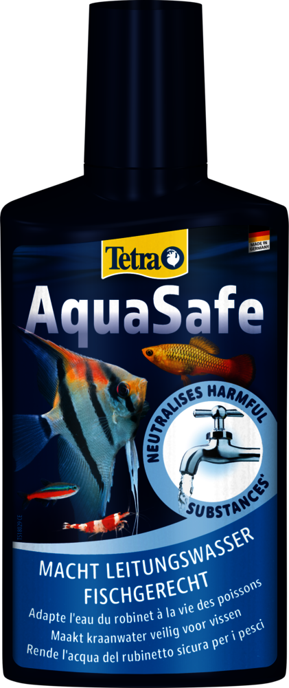 Tetra AquaSafe maakt leidingwater veilig voor vissen en beschermt vissen en planten op betrouwbare wijze tegen schadelijke stoffen in het water. De geoptimaliseerde vitamine B-mix vermindert stress bij vissen tijdens waterverversingen nu nog beter en legt zo de basis voor gezond leven in een aquarium.