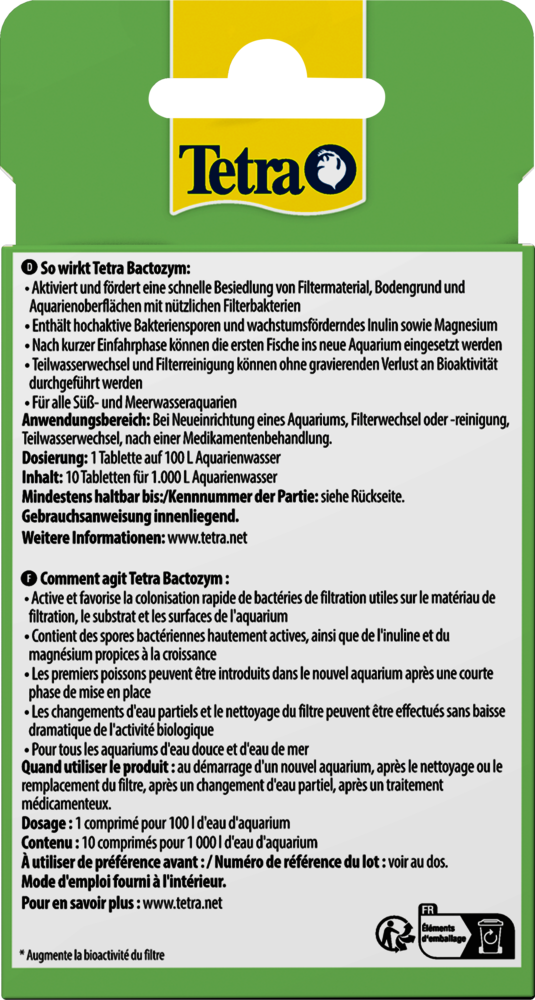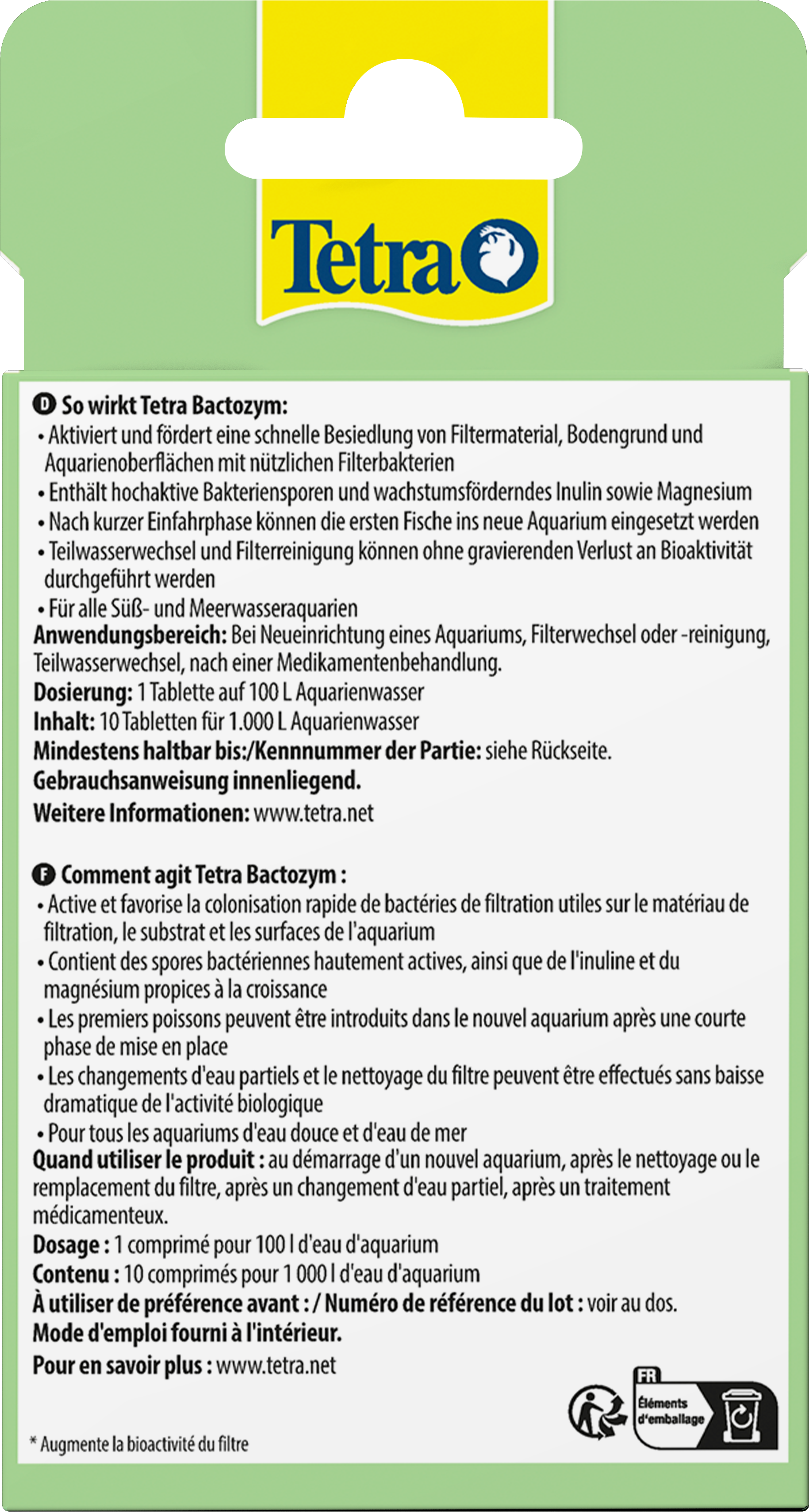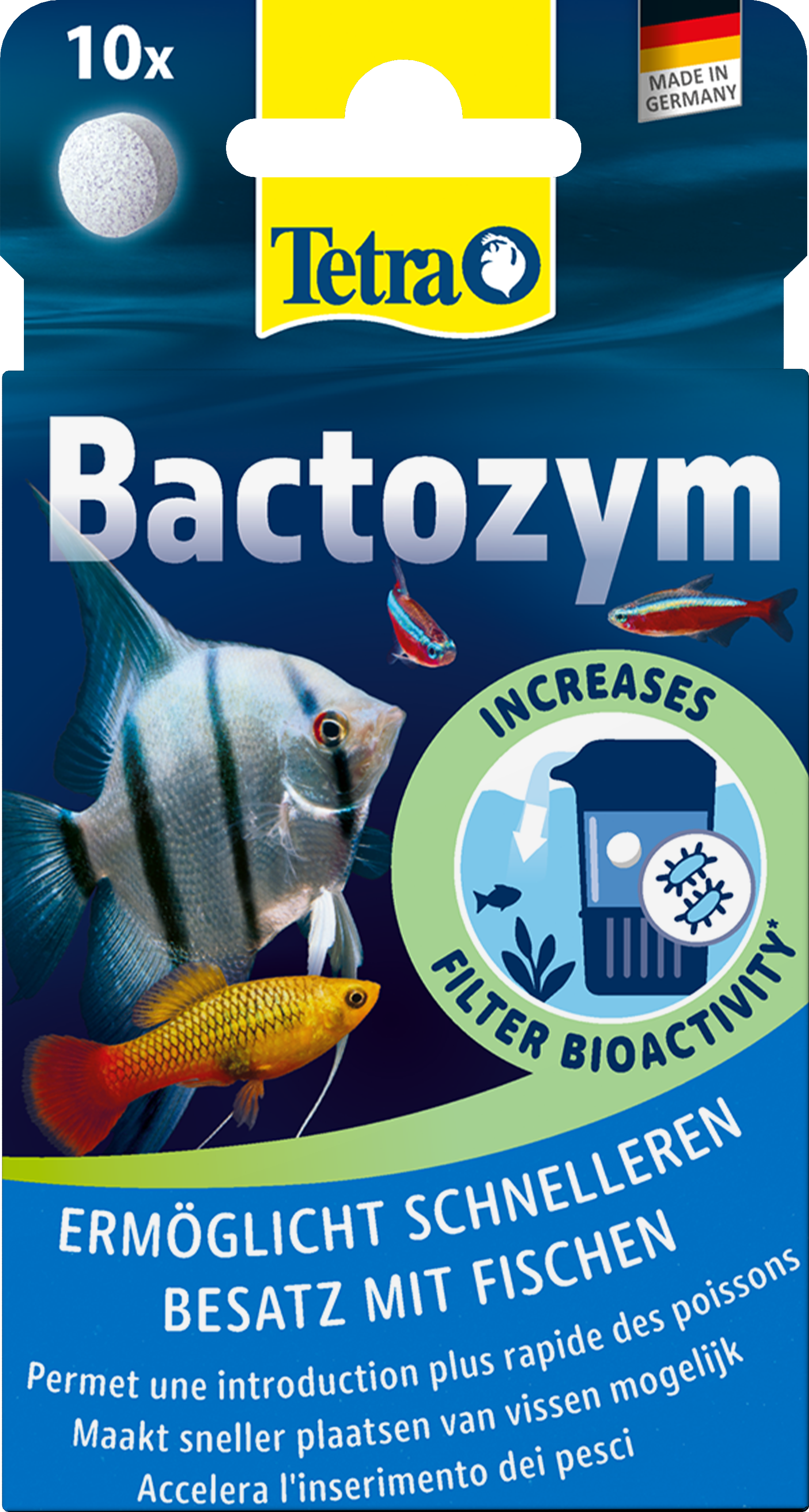Tetra Bactozym is een snelle en betrouwbare oplossing in tabletformaat om biologische activiteit in uw aquarium tot stand te brengen en te behouden en de inloopfase te versnellen. De geoptimaliseerde mix van bacteriesporen zorgt ervoor dat nuttige bacteriën snel voornamelijk het filtermedium in uw aquarium koloniseren, om de afbraak van schadelijke stoffen te ondersteunen. Met Tetra Bactozym kunt u de eerste vissen al 24 uur na het inrichten van een nieuw aquarium introduceren. Geschikt voor zowel zoet- als zeewateraquaria.