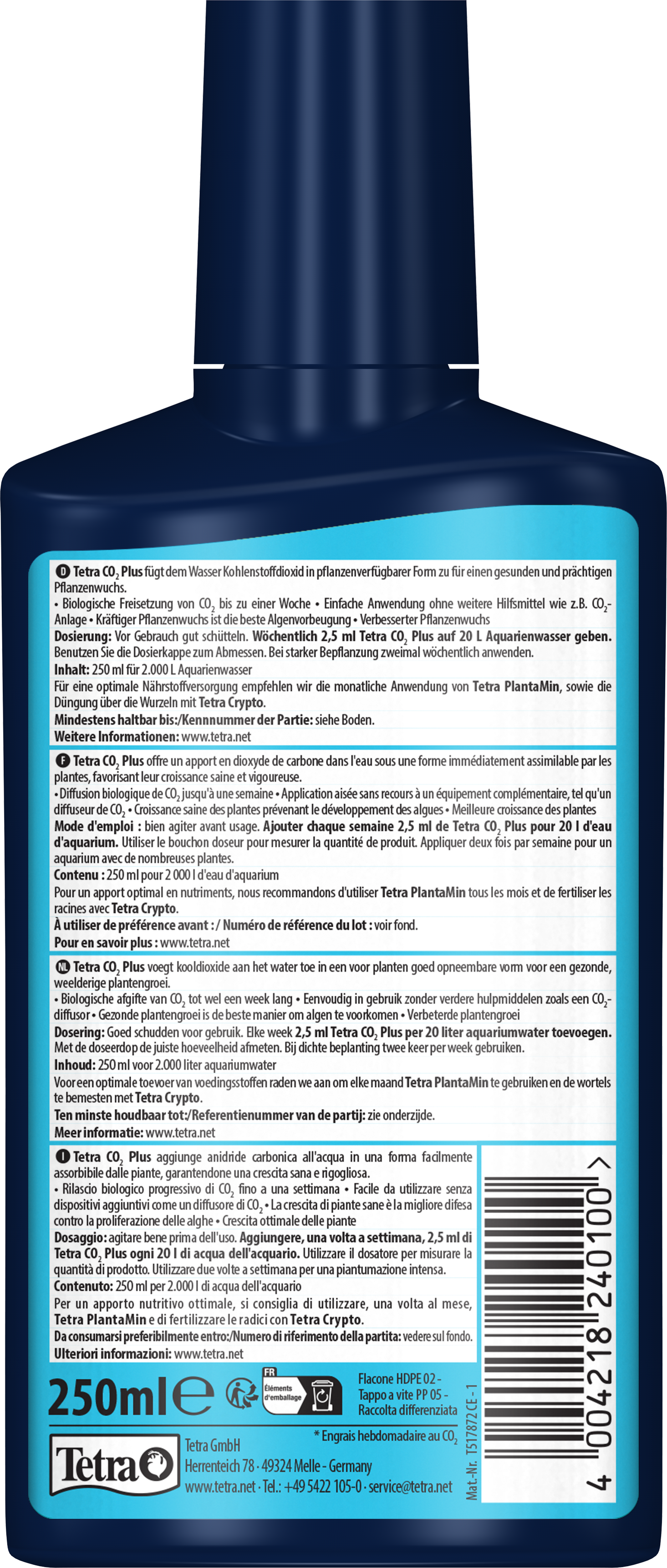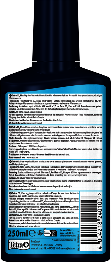 Tetra CO2 Plus zorgt voor een geleidelijke, biologische afgifte van CO2 gedurende maximaal zeven dagen, waardoor uw planten de continue boost krijgen die ze nodig hebben voor een robuuste, gezonde groei - zonder extra apparatuur zoals een diffuser. De planten in uw aquarium zijn de vitale groene "krachtcentrales" van uw onderwaterwereld. Sterkere, sneller groeiende planten concurreren op natuurlijke wijze met algen om voedingsstoffen en licht, waardoor slechte bloei wordt voorkomen en het water wordt verrijkt met essentiële zuurstof voor al zijn bewoners. Zorg voor een CO2 -concentratie van 5–15 mg/L om optimale omstandigheden te creëren. Goed schudden voor gebruik en eenmaal per week 2,5 ml Tetra CO2 Plus per 20 L aquariumwater toevoegen. Gebruik de handige doseerdop voor een nauwkeurige meting. Voor een perfect uitgebalanceerde toevoer van voedingsstoffen raadt Tetra aan om eenmaal per maand Tetra PlantaMin toe te voegen en de wortels te voeden met Tetra Crypto. Het resultaat? Een weelderig, levendig aqualandschap waarin uw vissen gedijen; en u geniet van een helderder, schoner aquarium met minimale inspanning.