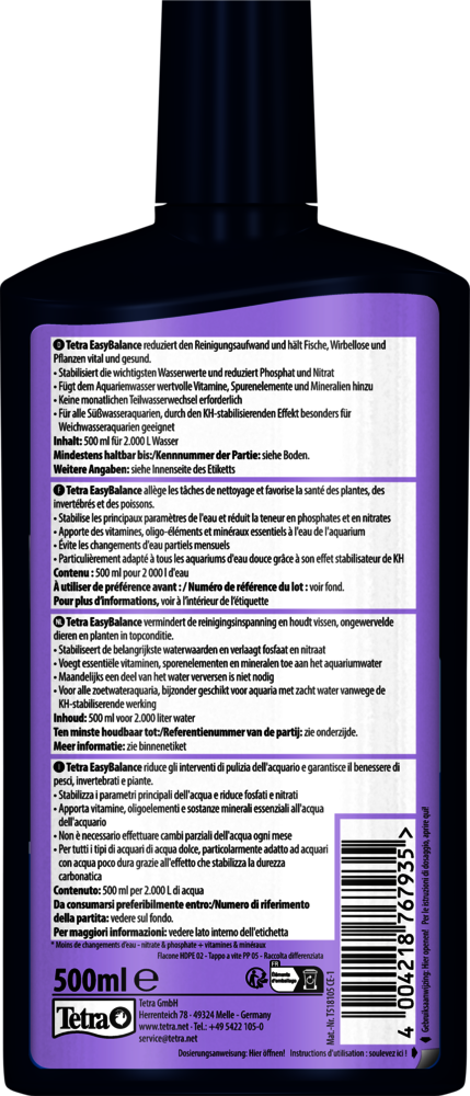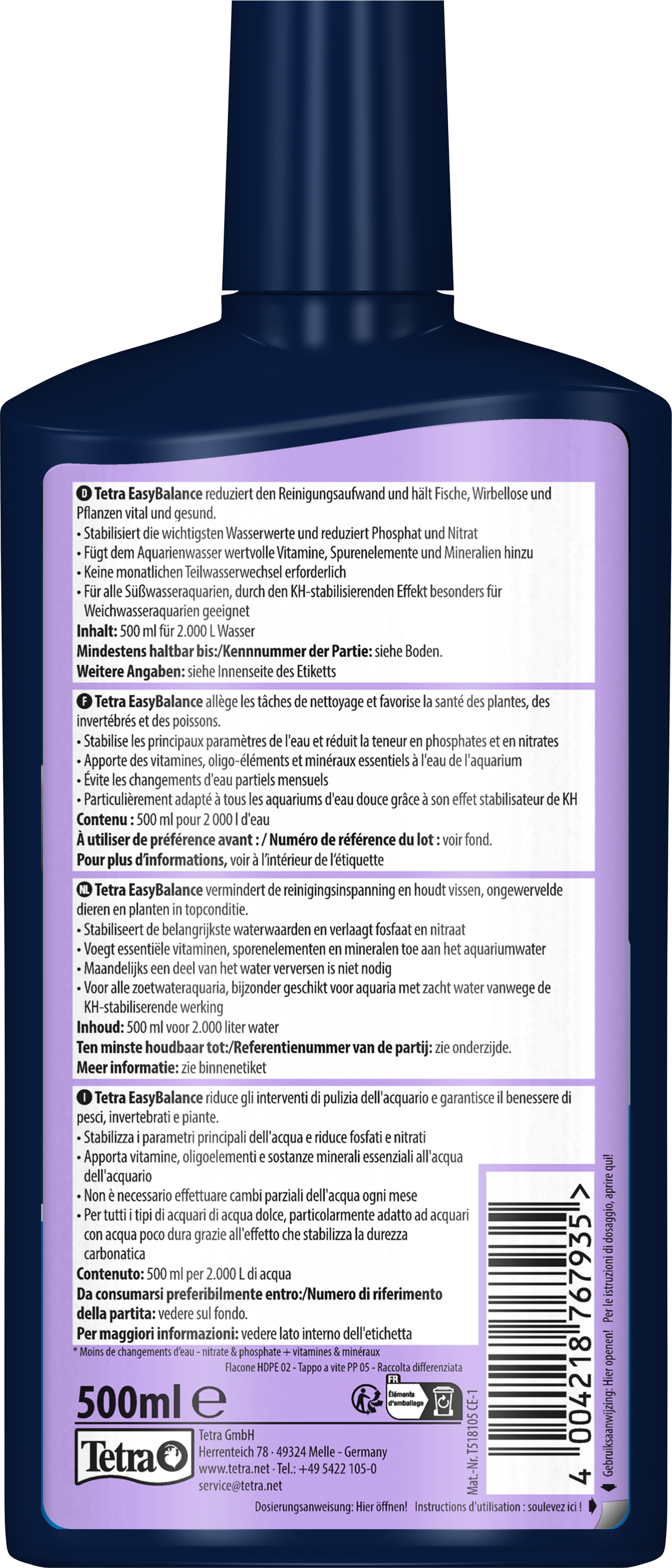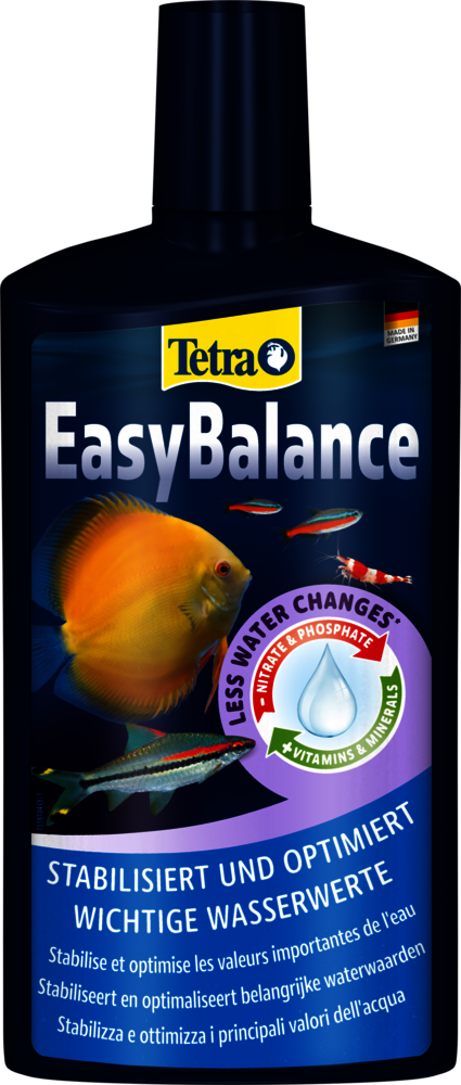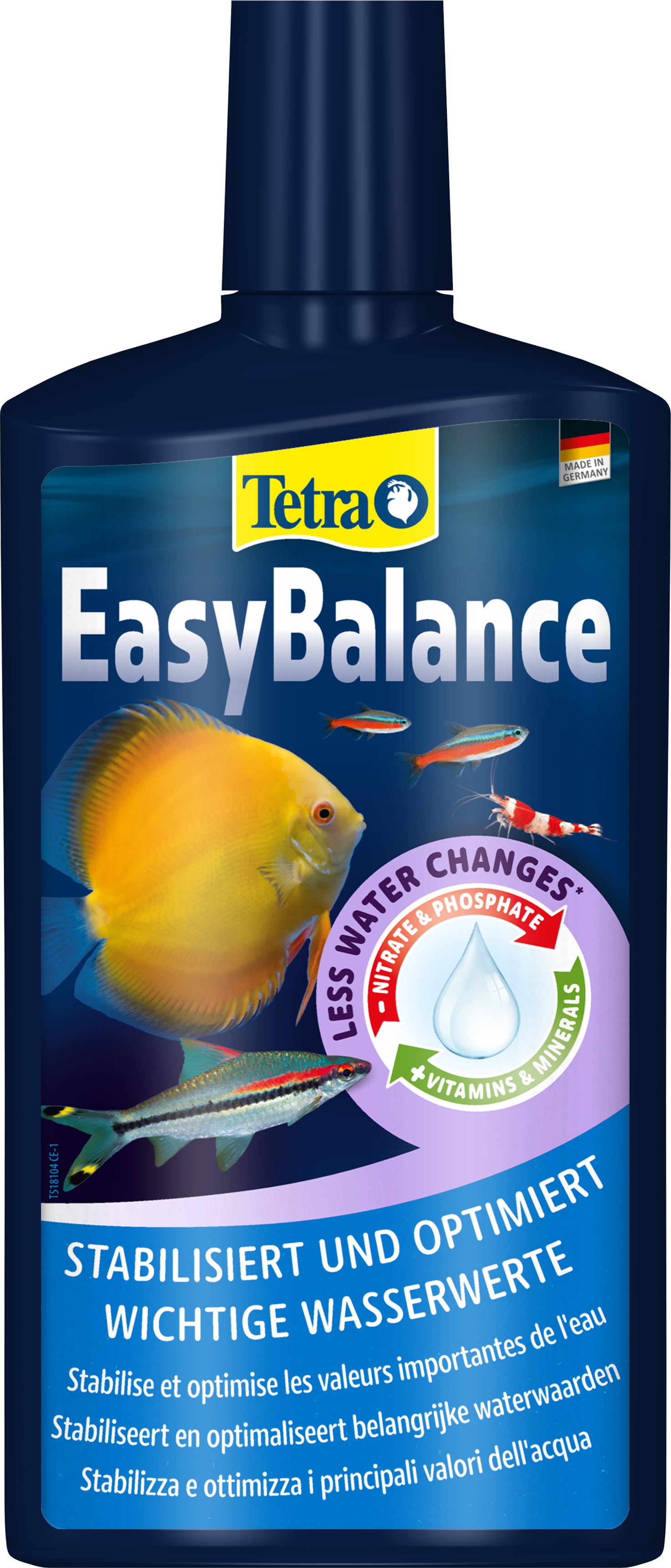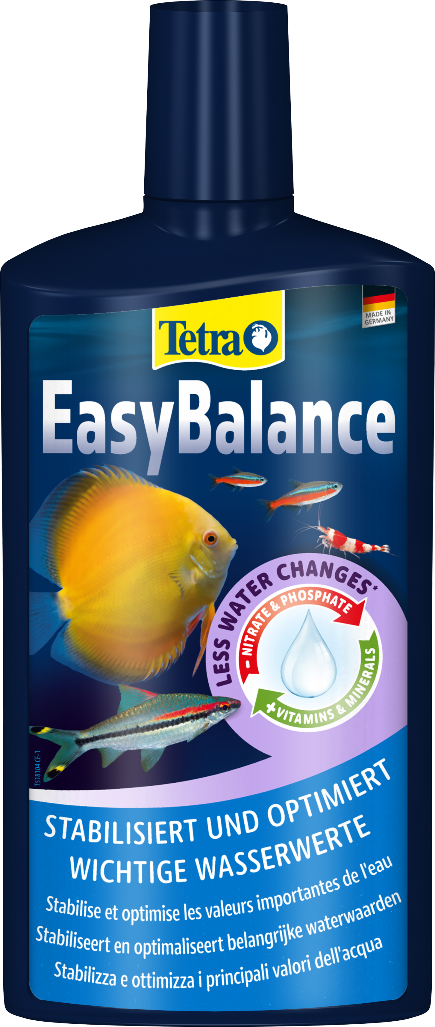 Tetra EasyBalance is een unieke waterverzorgingsvloeistof die uw aquarium met minimale inspanning in balans houdt. Het stabiliseert de pH en carbonaathardheid (KH) terwijl het nitraat en fosfaat op een biologische manier vermindert om de reinigingsintervallen te verlengen. Tegelijkertijd verrijkt het product het aquariumwater met essentiële vitamines, sporenelementen en mineralen die vissen en planten nodig hebben voor een gezond leven.