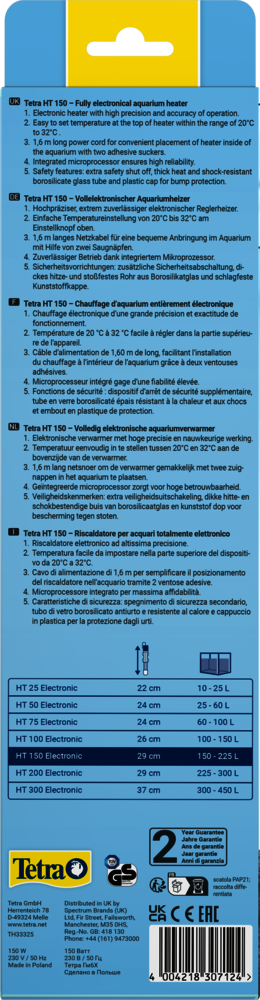Tetra HT Heater Electronic is een volledig elektronische aquariumverwarmer met hoge precisie. Deze betrouwbare verwarmer voor aquaria van alle formaten houdt de watertemperatuur altijd binnen een bereik van 20°C tot 32°C.
