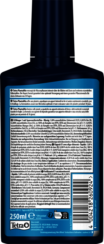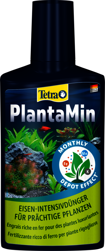 Tetra PlantaMin voorziet waterplanten van een intensieve toevoer van ijzer en andere essentiële voedingsstoffen via de bladeren. De depot-formule zorgt voor een optimale toevoer en gezonde plantengroei gedurende een periode van maximaal 30 dagen.