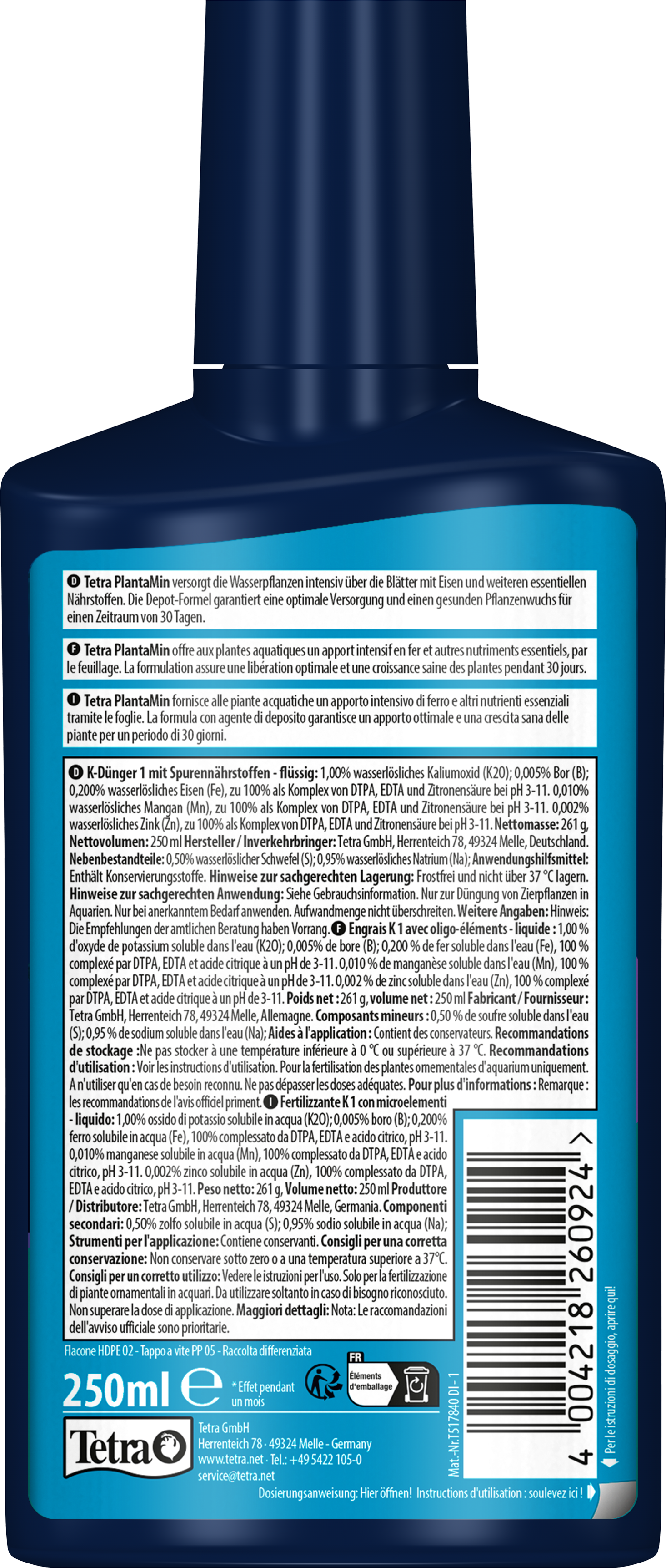 Tetra PlantaMin voorziet waterplanten van een uitgebalanceerde maandelijkse aanvoer van essentiële voedingsstoffen zoals ijzer, kalium, mangaan en vitale sporenelementen, wat zorgt voor een gezonde, levendige groei en helpt op natuurlijke wijze algen te voorkomen. De speciale depot-formule garandeert een consistente afgifte van voedingsstoffen gedurende 30 dagen, ondersteunt de vorming van chlorofyl en verbetert de bladkleuring, terwijl het betrouwbaar vergeling of doorschijnende bladeren voorkomt. De voedingsstoffen worden optimaal opgenomen door de bladeren en leveren wat planten nodig hebben, precies waar ze het nodig hebben. Voor een optimaal resultaat goed schudden voor gebruik en eenmaal per maand 5 ml Tetra PlantaMin per 20 L aquariumwater toevoegen. Voor een nog gerichtere toevoer van micronutriënten raden we aan om het elke week te combineren met Tetra PlantaPro. Met Tetra PlantaMin groeien uw aquariumplanten sterk, weelderig en vol kleur, waardoor een prachtige, evenwichtige onderwaterwereld ontstaat.