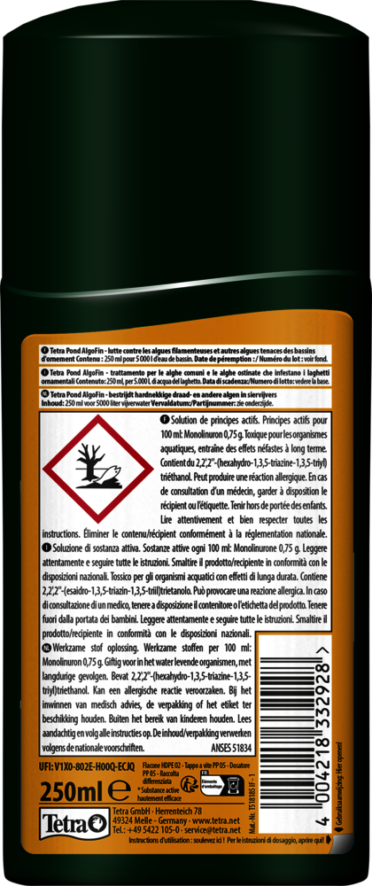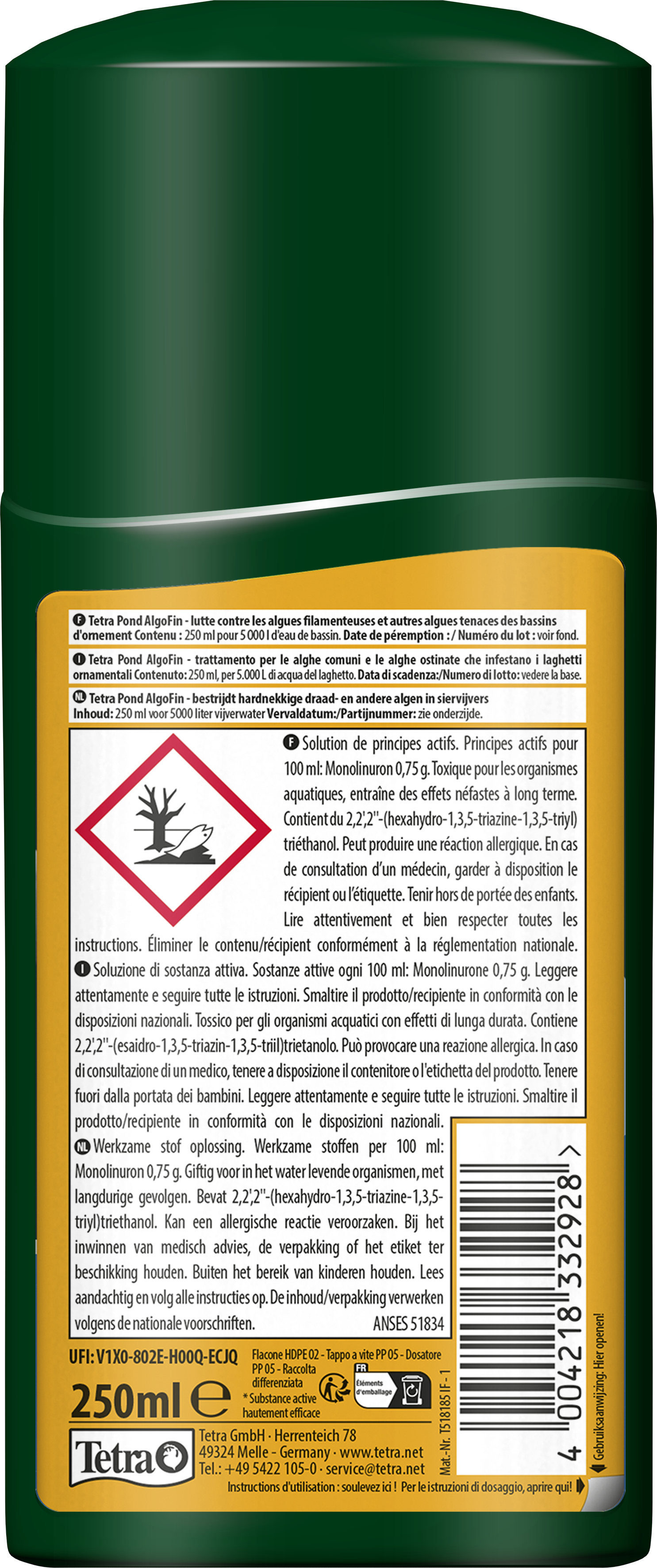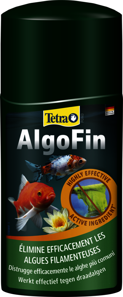 Tetra Pond AlgoFin* bestrijdt effectief de meest voorkomende algensoorten, zoals draad-, zweef- en slijmalgen in siervijvers. Het specifieke actieve ingrediënt wordt selectief door de algen opgenomen en remt hun vermogen tot fotosynthese. Op deze manier worden de algen in een periode van twee tot drie weken vernietigd. Tetra Pond AlgoFin* voorkomt tegelijkertijd verdere algengroei. Dit product is geschikt voor siervijvers met vissen, planten en micro-organismen. Voor een optimaal resultaat moet u Tetra Pond AlgoFin* goed schudden voor gebruik en de gedetailleerde instructies opvolgen. Dankzij de bijgeleverde doseerdop kan Tetra Pond AlgoFin* zeer nauwkeurig gedoseerd worden. Gebruik de doseerdop en voeg 50 ml per 1.000 L vijverwater toe en verdeel de vloeistof gelijkmatig in het water, bijvoorbeeld met een stok. Verwijder zoveel mogelijk algen voor en na de behandeling, bijvoorbeeld met het Tetra Algae Net, omdat dode algen de waterkwaliteit aantasten. Zorg voor voldoende zuurstoftoevoer en filter niet met UV-algenverdelvers of actieve kool gedurende minstens zeven dagen na toevoeging van het product. Ververs tijdens de behandeling vier weken lang het water niet. Om zware algengroei tegen te gaan, kunt u de behandeling na deze vier weken herhalen met de helft van de aangegeven hoeveelheid. Tetra adviseert Tetra Pond Test 7in1 om de belangrijkste waterwaarden regelmatig te controleren en het gebruik van Tetra Pond PhosphateMinus om algengroei vanaf het begin te voorkomen.