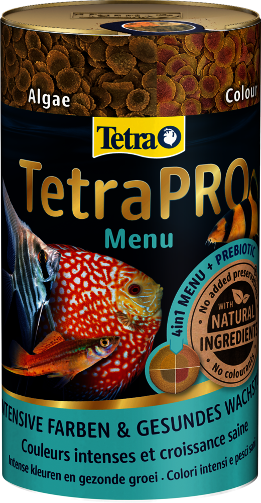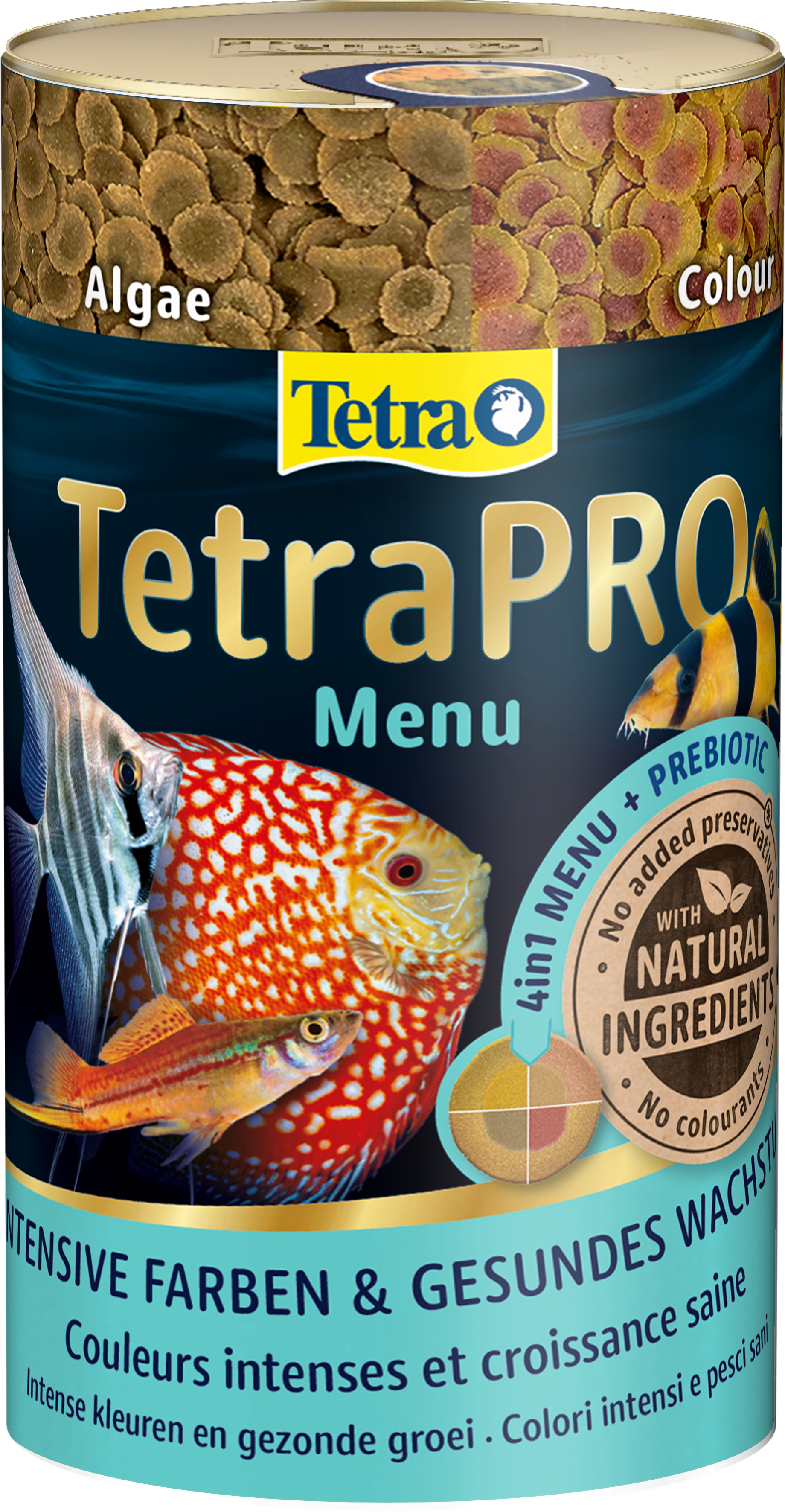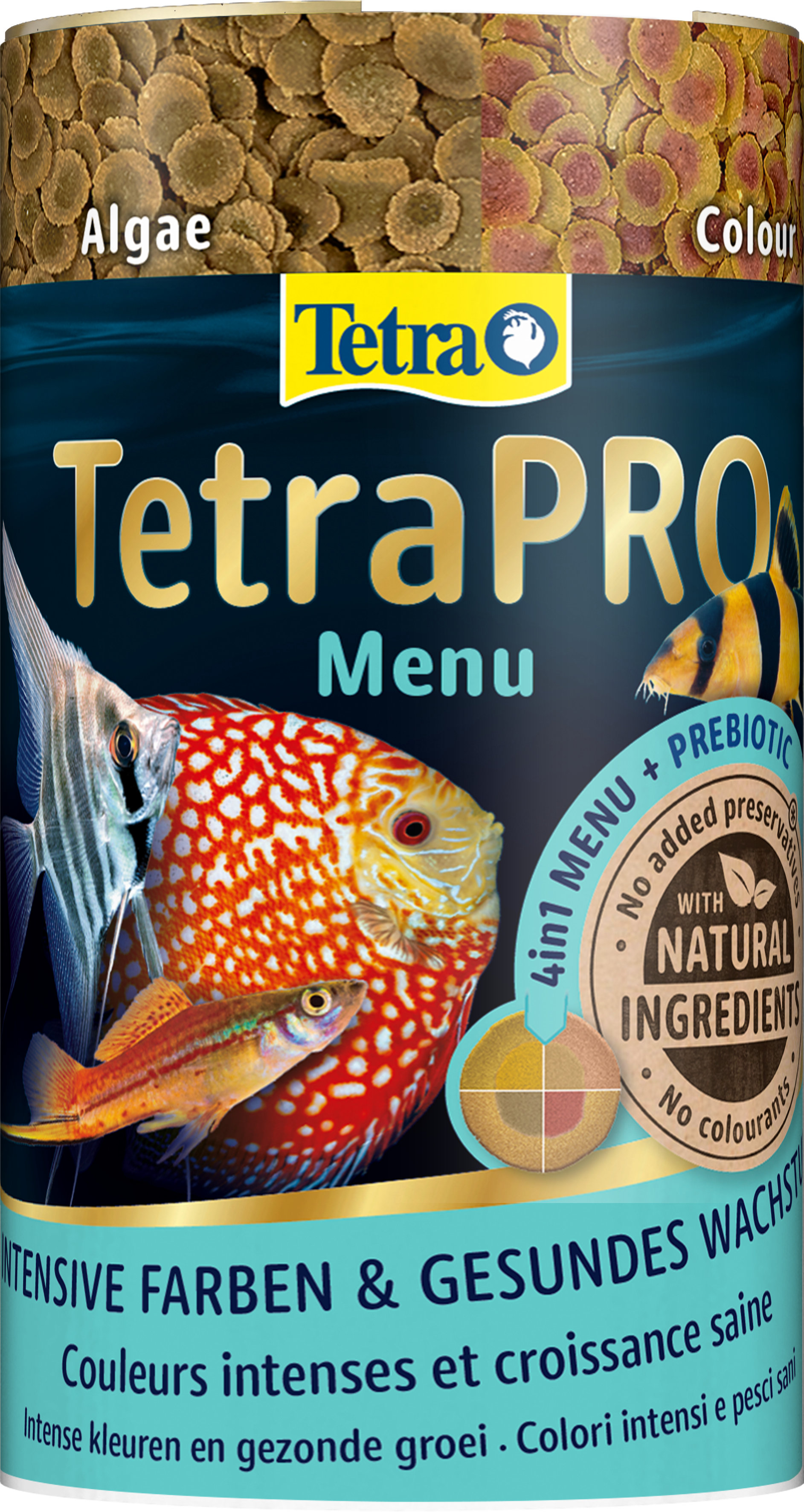 TetraPRO Menu biedt een assortiment van vier verschillende, met zorg vervaardigde en zeer voedzame premium complete voeders. U kunt kiezen uit multi-crisps die het immuunsysteem ondersteunen of een gezonde groei bevorderen, multi-crisps die de natuurlijke kleurenpracht versterken of de vitaliteit van uw siervissen verbeteren.