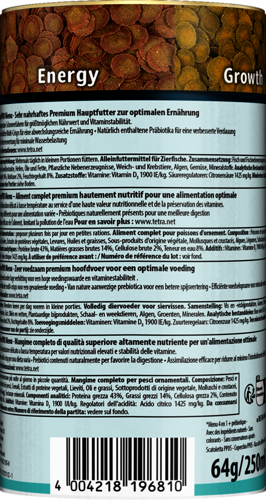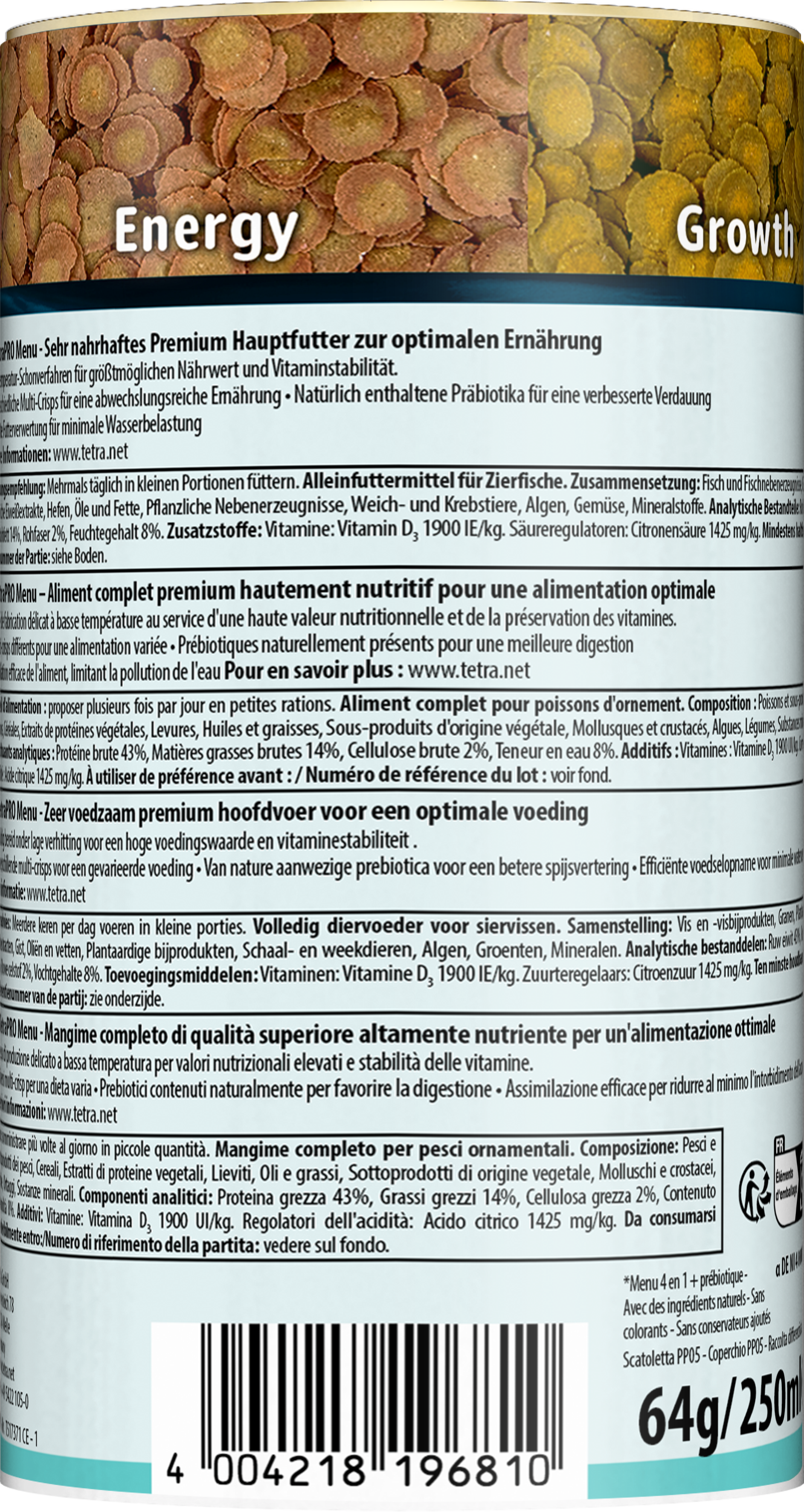 Het assortiment van TetraPRO heeft een nieuwe standaard gezet in visvoeding. Het premium hoofdvoer is zorgvuldig bereid onder lage verhitting. Deze speciale methode geeft elk van de vier verschillende crisps in TetraPRO Menu een zeer hoge voedingswaarde voor uw siervissen - een waar feest voor al uw siervissen. De multicrisps absorberen ook minder water dan normaal vlokkenvoer. Dit verhoogt de voedingswaarde bij elke hap. Alle TetraPRO voeders bieden een geoptimaliseerde eiwit-vetverhouding. Dit zorgt ervoor dat de vissen de eiwitten specifiek kunnen gebruiken om spieren op te bouwen door voldoende essentiële vetzuren te leveren voor energie. TetraPRO Menu combineert alle voordelen van de verschillende multicrisps. Aan u de keuze: Het assortiment van TetraPRO heeft een nieuwe standaard gezet in visvoeding. Het premium hoofdvoer is zorgvuldig bereid onder lage verhitting. Deze speciale methode geeft elk van de vier verschillende crisps in TetraPRO Menu een zeer hoge voedingswaarde voor uw siervissen. TetraPRO Menu combineert alle voordelen van de verschillende multi-crisps. Aan u de keuze: terwijl het extra energieconcentraat in de Energy Multi-Crisps de vitaliteit verhoogt, brengen de Colour Multi-Crisps de natuurlijke kleurenpracht van uw siervissen naar boven. De Algae Multi-Crisps geven ze alles wat ze nodig hebben om het immuunsysteem te ondersteunen en de Growth Multi-Crisps ondersteunen een gezonde groei. verkruimelen ook veel minder dan conventionele vlokken, waardoor er veel minder poeder in het voedselblik vormt. Bovendien ondersteunen de van nature aanwezige prebiotica specifiek de groei en de stofwisseling van gezondheidsbevorderende bacteriën in het darmkanaal van vissen. Dankzij hun smakelijkheid en hoge verteerbaarheid houden de multi-crisps het water in het aquarium schoon. TetraPRO Menu is samengesteld met hoogwaardige ingrediënten en zonder kleurstoffen of toegevoegde conserveringsmiddelen.