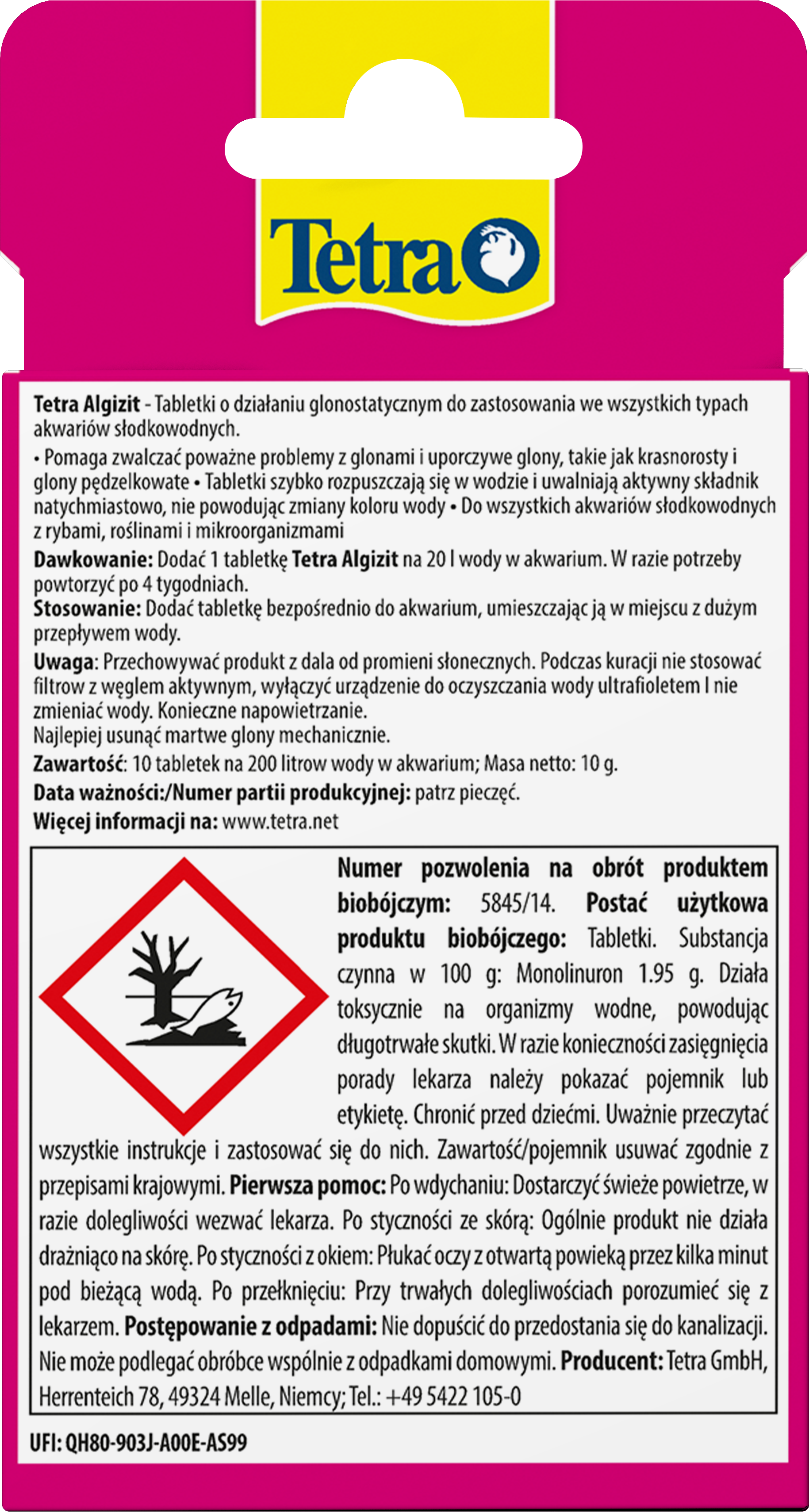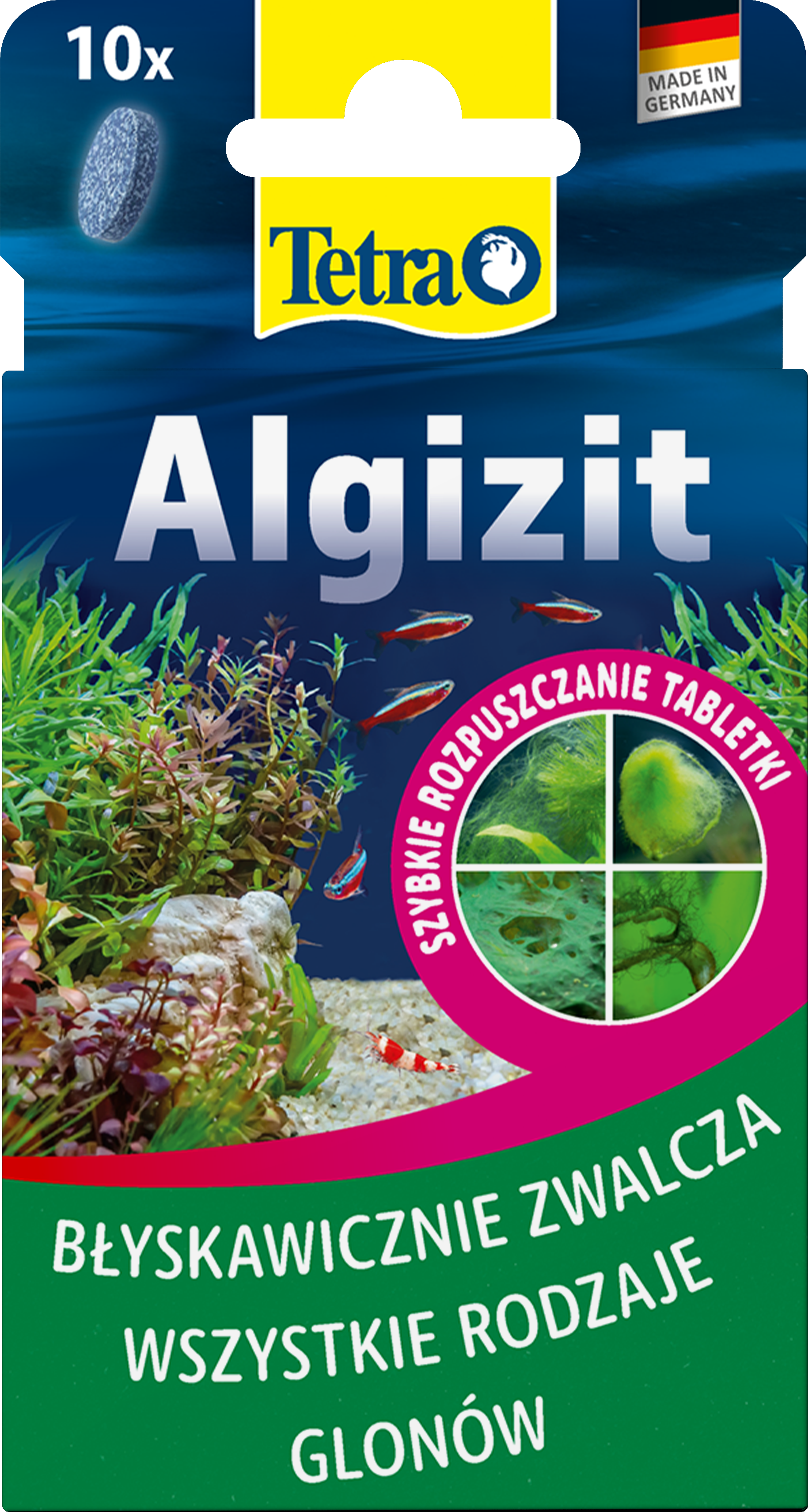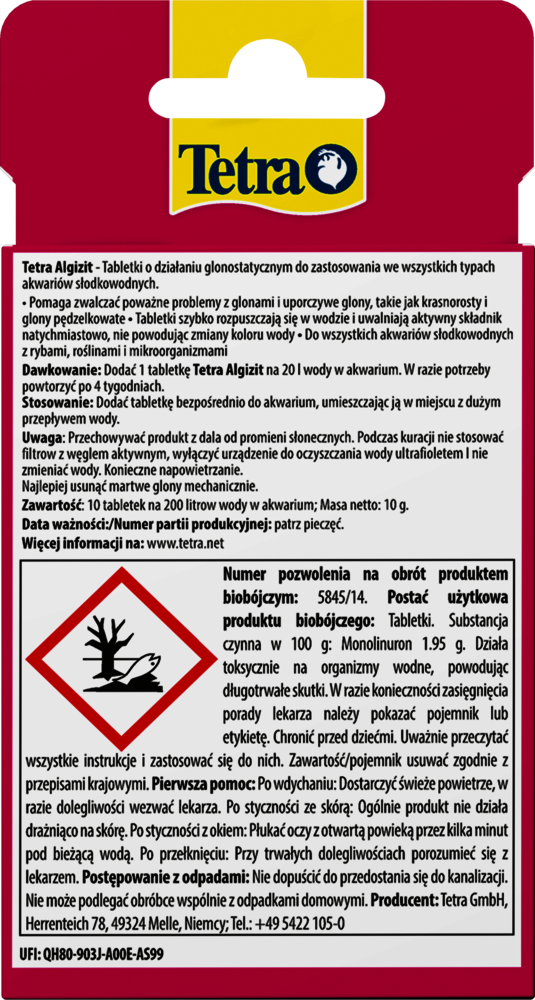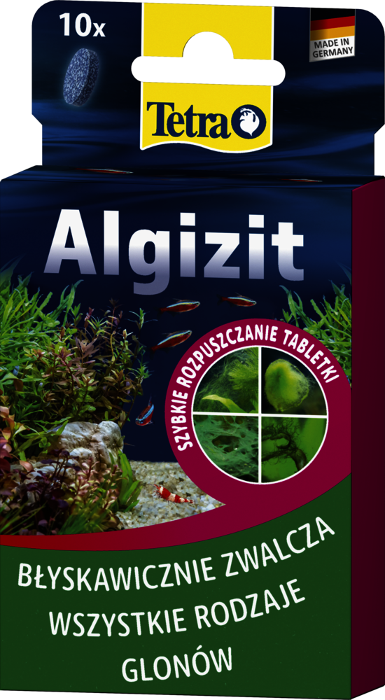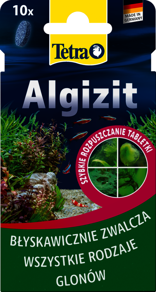 Tetra Algizit* zapewnia szybką poprawę nawet w najbardziej uporczywych ogniskach glonów w akwariach słodkowodnych, zwalczając zielone, brązowe i czerwone glony, a także trudne odmiany pędzelkowatych i krasnorostów. Szybko rozpuszczające się tabletki uwalniają wysoce aktywny składnik natychmiast po kontakcie z wodą, zakłócając metabolizm glonów, a jednocześnie pozostają łagodne dla ryb, roślin i pożytecznych mikroorganizmów, o ile są stosowane zgodnie z zaleceniami. Tetra Algizit* nie powoduje mętnienia ani barwienia wody. Wystarczy dodać jedną tabletkę na 20 l wody w akwarium i umieścić ją w miejscu o dobrym przepływie wody, aby zapewnić optymalne rozprowadzenie. W razie potrzeby powtórz po dwóch tygodniach i utrzymuj napowietrzanie (na przykład za pomocą pompy powietrza Tetra APS), zatrzymując na czas kuracji filtrowanie węglem aktywnym, oczyszczanie promieniami UV i podmiany wody. Usuń martwe glony mechanicznie, aby zachować jakość wody, a następnie kontroluj poziom składników odżywczych – zmniejszając zawartość fosforanów i azotanów za pomocą preparatu Tetra EasyBalance – aby zapobiec pojawieniu się glonów w przyszłości. W celu zapewnienia stałej profilaktyki w małych akwariach warto rozważyć stosowanie preparatu Tetra Algetten*, a w przypadku większych akwariów – Tetra AlgoStop depot*. Zawsze przechowuj produkt z dala od bezpośredniego światła słonecznego.