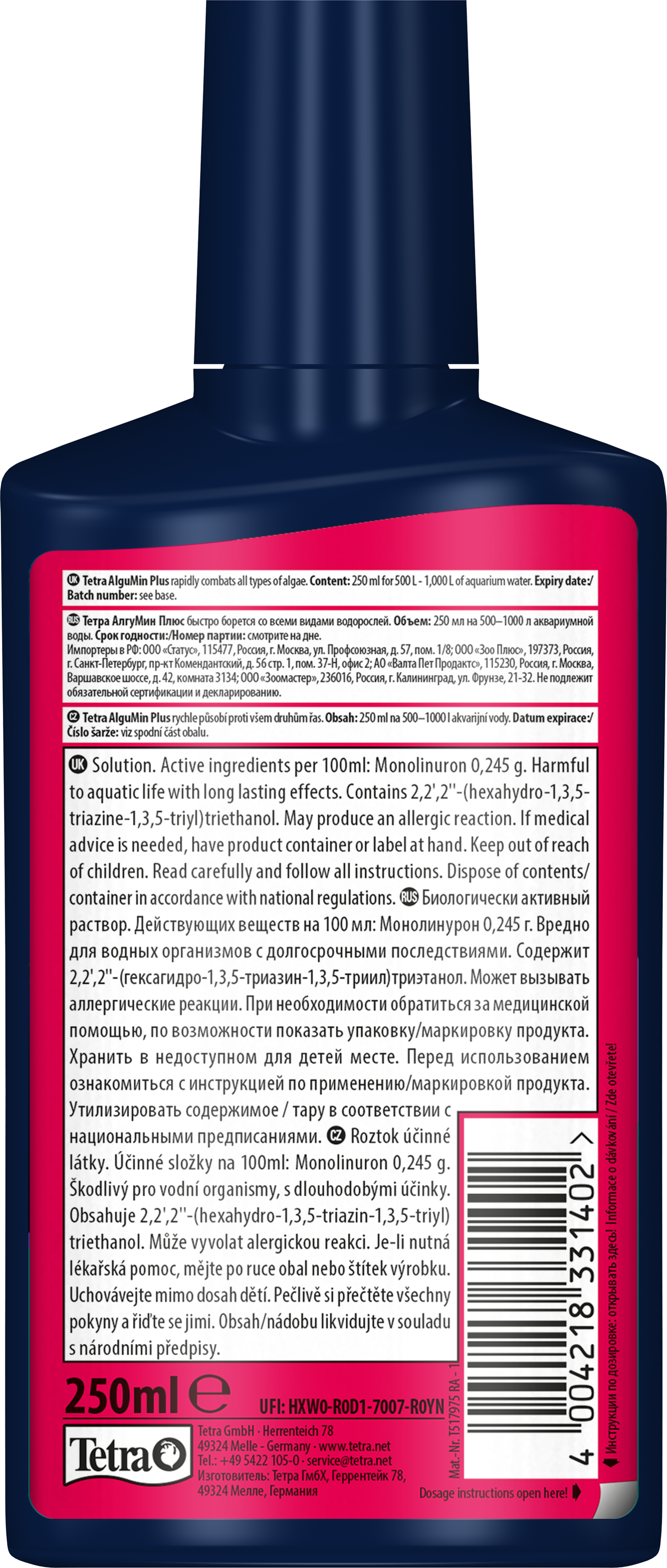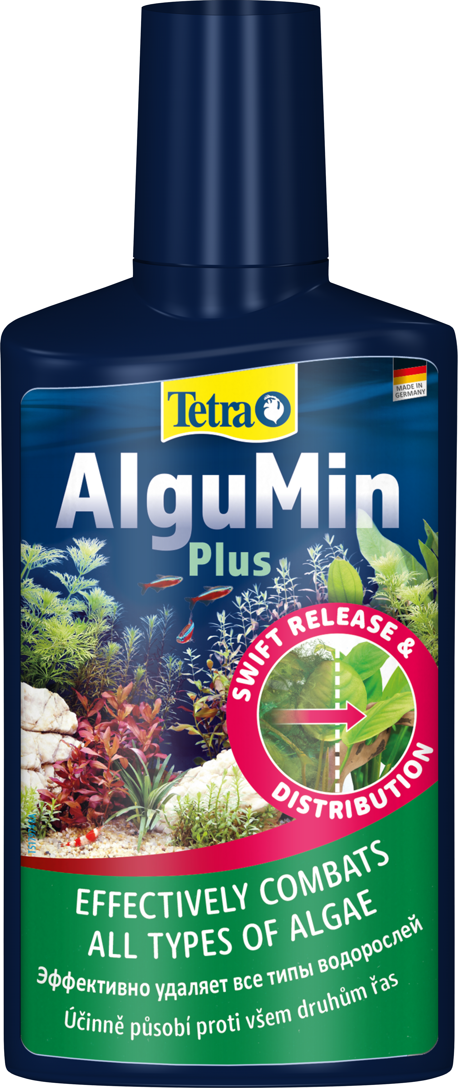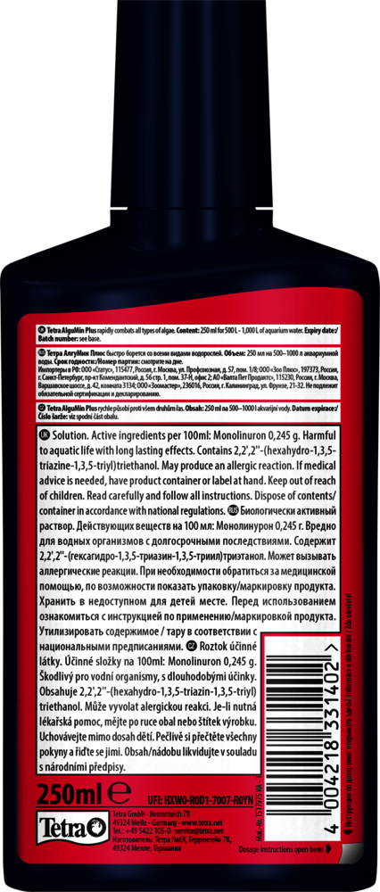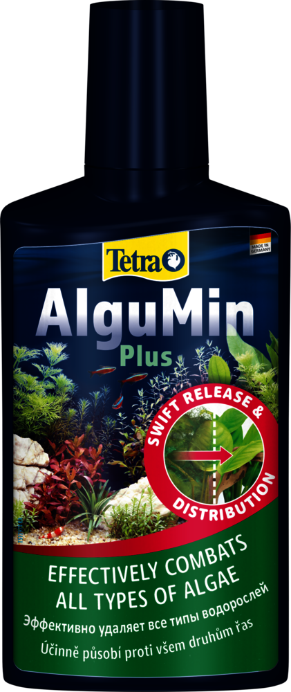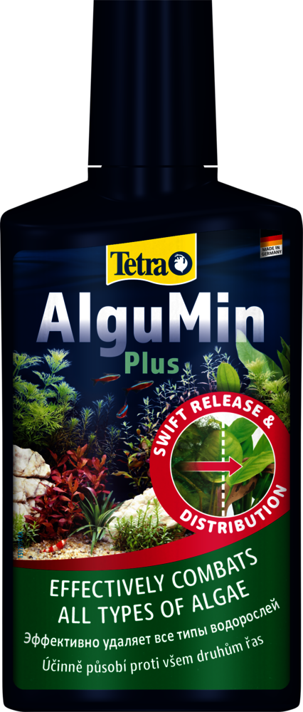 Tetra AlguMin Plus * быстро избавляет от всех типов водорослей в пресноводных аквариумах, немедленно высвобождая высокоактивный ингредиент. Жидкая формула позволяет равномерно распределять средство в воде для воздействия на метаболизм водорослей. Tetra AlguMin Plus* не окрашивает и не замутняет воду.Тщательно встряхните перед использованием и добавьте 5 мл Tetra AlguMin Plus* на 10 л аквариумной воды в зону с хорошей циркуляцией; при серьезных вспышках повторяйте каждые две недели, уменьшив дозу вдвое. Всегда храните продукт вдали от прямых солнечных лучей. Во время обработки отключите УФ-стерилизаторы, избегайте фильтрации с использованием активированного угля и не меняйте воду, обеспечивая при этом достаточную аэрацию (например, с помощью воздушного компрессора Tetra APS) и механически удаляйте мертвые водоросли для сохранения качества воды. Чтобы предотвратить новые вспышки, уменьшите избыток питательных веществ, таких как фосфаты и нитраты, например, с помощью Tetra EasyBalance, и рассмотрите регулярное использование продуктов с медленным высвобождением, таких как Tetra Algetten* для аквариумов до 40 л или Tetra AlgoStop depot* для более крупных аквариумов.