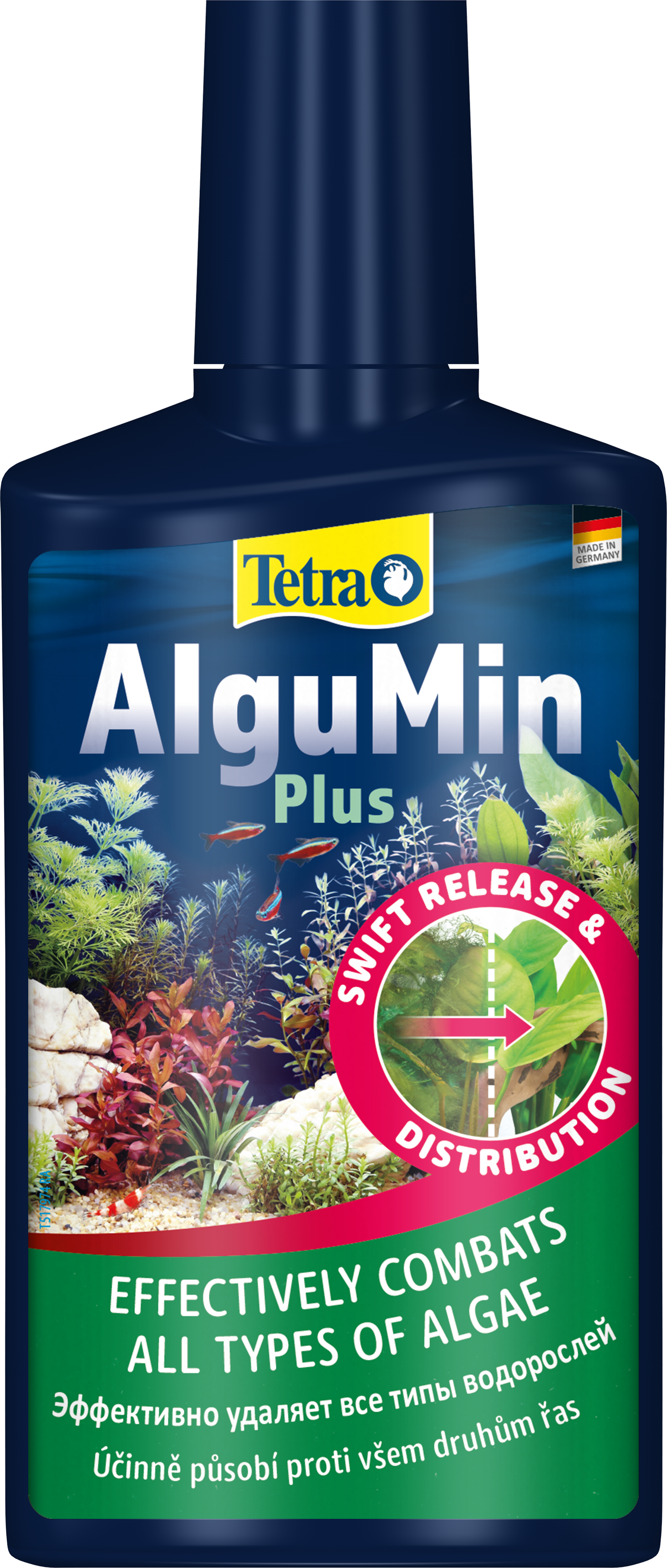 Tetra AlguMin Plus * быстро избавляет от всех типов водорослей в пресноводных аквариумах, немедленно высвобождая высокоактивный ингредиент. Жидкая формула позволяет равномерно распределять средство в воде для воздействия на метаболизм водорослей. Tetra AlguMin Plus* не окрашивает и не замутняет воду.