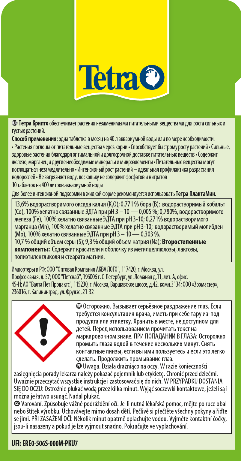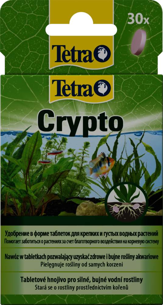 Аквариумные растения — это зеленые «электростанции» аквариума. Они выполняют несколько важных функций одновременно, вырабатывая кислород и повышая качество воды. В результате аквариумные растения позволяют создать оптимальную среду обитания для рыб. Тетра Крипто обогащает водные растения всеми необходимыми питательными веществами непосредственно через корни. Удобрение в форме таблеток ускоряет рост. Железо, марганец, а также другие важные минералы и микроэлементы придают водным растениям великолепный здоровый внешний вид. Питательные вещества, которые входят в состав удобрения, поглощаются корнями незамедлительно. Здоровый рост растений — залог успеха в борьбе с водорослями за счет поглощения растениями в процессе фотосинтеза таких веществ, как аммиак или аммоний. В результате, качество воды также улучшается. При отсутствии растений эти вещества могут скапливаться в аквариуме и увеличивать в итоге концентрацию нитратов - питательного элемента для водорослей. Поскольку Тетра Крипто не содержит нитратов и фосфатов, средство не загрязняет аквариумную воду.