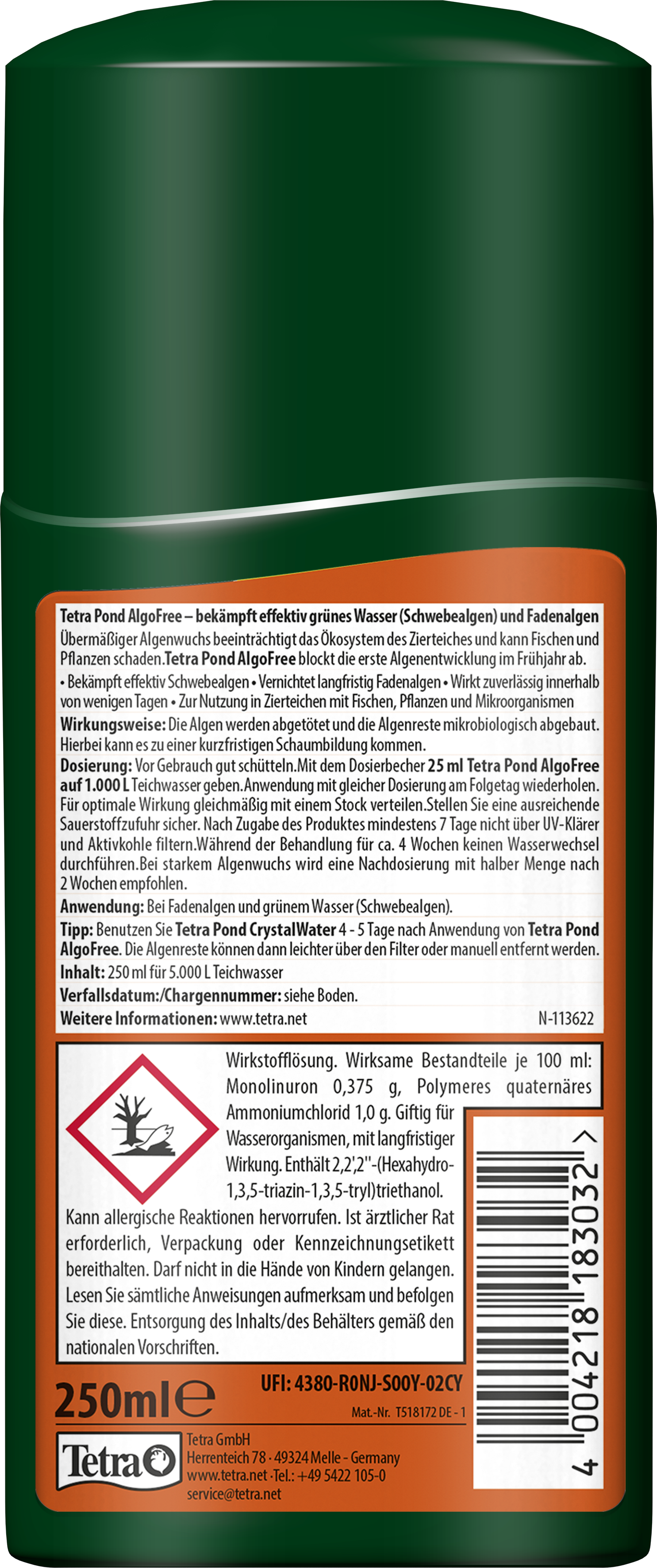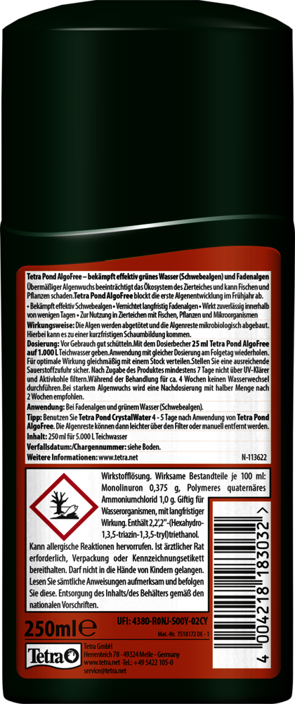 Tetra Pond AlgoFree* эффективно уничтожает нитчатые водоросли в вашем декоративном пруду и борется с плавающими водорослями, которые окрашивают воду в зеленый цвет. Вы гарантированно увидите эффект уже через несколько дней. Ингредиенты, входящие в состав Tetra Pond AlgoFree*, разрушают клеточную стенку водорослей. После этого их остатки быстро расщепляются микробиологически. В результате этого процесса в вашем декоративном пруду может возникнуть кратковременное пенообразование. Помимо быстрого удаления водорослей этот продукт особенно полезен для предотвращения цветения водорослей, особенно весной. Tetra Pond AlgoFree* можно также использовать для борьбы с ростом водорослей в летний период. Этот продукт подходит для декоративных прудов, не причиняя вреда рыбам, растениям и микроорганизмам. Для достижения наилучшего результата хорошо встряхните Tetra Pond AlgoFree* перед использованием и следуйте подробным инструкциям. Благодаря входящему в комплект колпачку-дозатору Tetra Pond AlgoFree* можно дозировать очень точно. Используя дозирующий колпачок, добавьте 25 мл средства на 1 000 л воды в пруд, равномерно распределяя его, например, с помощью палочки. Обеспечьте достаточное поступление кислорода во время обработки и не используйте УФ-стерилизатор и активированный уголь в течение как минимум семи дней. Кроме того, не меняйте воду в течение четырех недель. При сильном росте водорослей рекомендуется повторное использование половины дозировки средства через две недели. Чтобы быстрее восстановить прозрачность воды после применения Tetra Pond AlgoFree*, Tetra рекомендует использовать Tetra Pond CrystalWater примерно через четыре-пять дней после применения Tetra Pond AlgoFree*. После этого остатки водорослей можно будет легче удалить через фильтр или вручную, например, с помощью сачка для водорослей Tetra Algae Net.