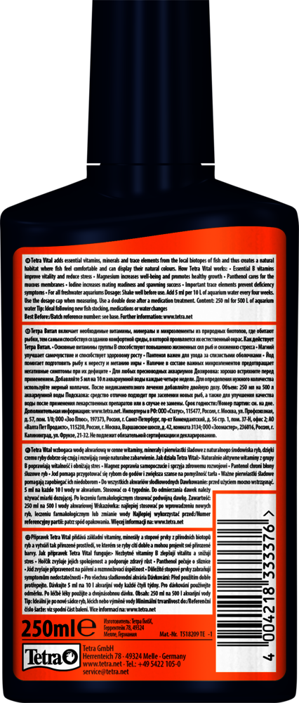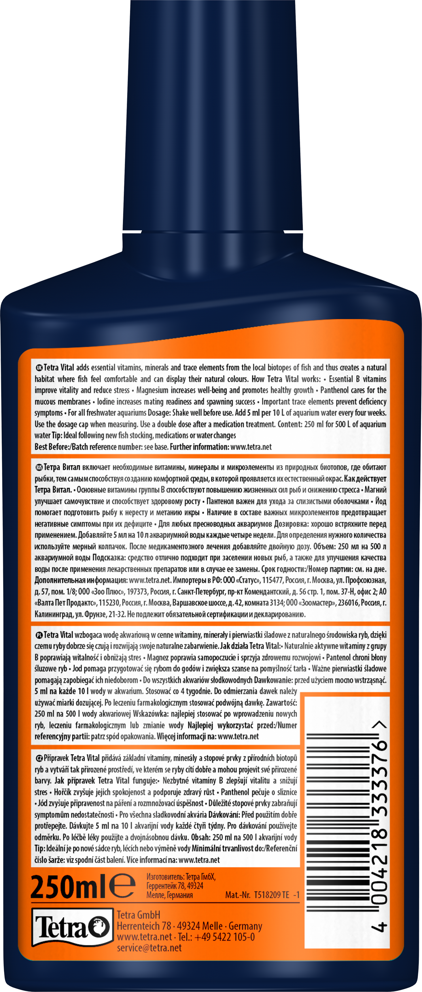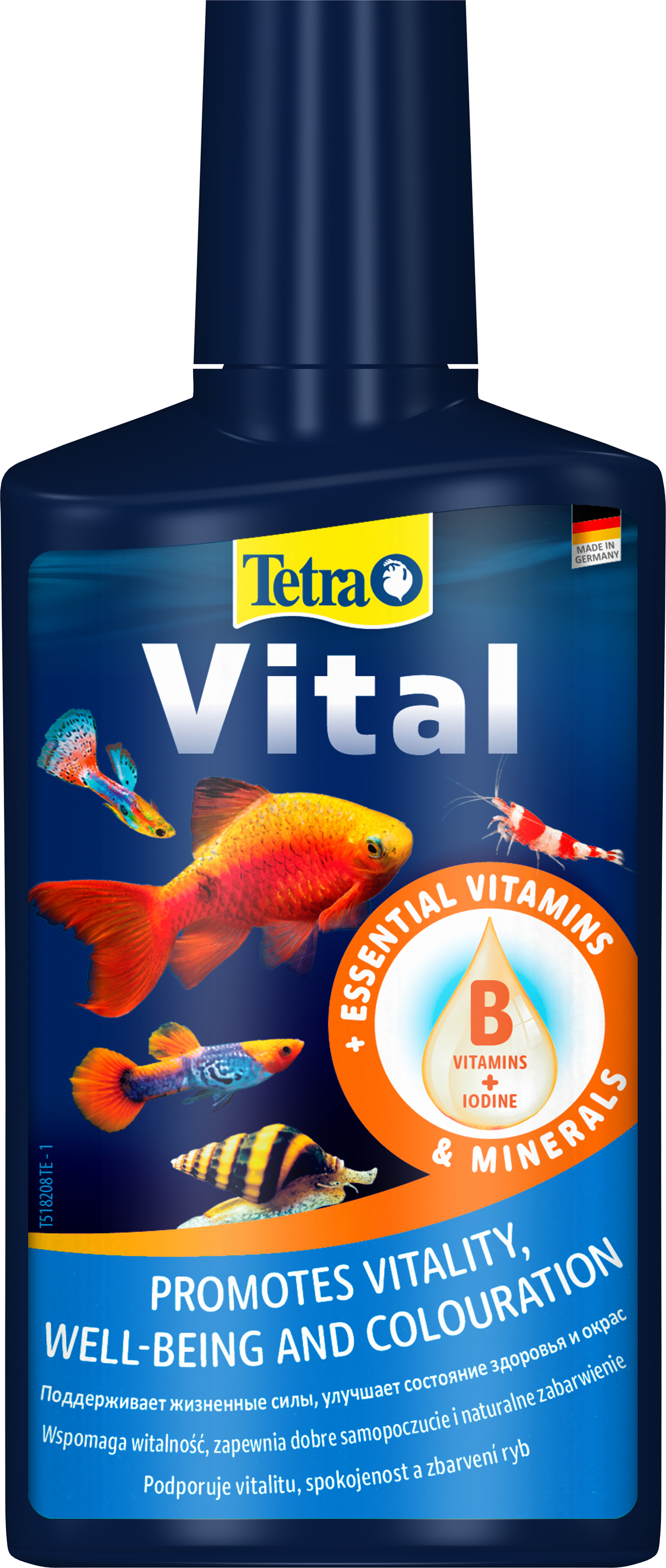 Tetra Vital обеспечивает пресноводных рыб всеми необходимыми витаминами и микроэлементами, которые нужны им для жизненной силы, роста и здоровья. Природные активные витамины группы B снижают стресс и укрепляют жизненные силы рыб, помогая им оставаться активными, здоровыми и выносливыми. Содержащийся магний способствует сильному, здоровому росту, а пантенол защищает нежные слизистые оболочки рыб, укрепляя их естественную защиту. Тщательно сбалансированная формула Tetra Vital также включает йод, который помогает подготовить рыб к спариванию и повышает успешность нереста, что делает его особенно ценным для аквариумистов, содержащих селекционные породы. Кроме того, важнейшие микроэлементы предотвращают симптомы дефицита, гарантируя, что рыбы остаются энергичными и здоровыми в течение длительного времени. Обогащая воду этими важными питательными веществами, Tetra Vital также способствует росту растений и микроорганизмов, поддерживая общий биологический баланс в аквариуме. Простой в использовании, Tetra Vital подходит для всех пресноводных аквариумов. Просто хорошо взболтайте перед использованием и добавляйте по 5 мл на 10 л аквариумной воды каждые четыре недели. После медикаментозного лечения компания Tetra рекомендует использовать двойную дозу. Этот продукт особенно полезен после добавления новых рыб, после подмены воды или когда аквариум подвергался стрессовым факторам. Благодаря уникальной смеси натуральных витаминов, минералов и защитных веществ Tetra Vital помогает обеспечить, чтобы рыбы чувствовали себя комфортно, демонстрировали весь спектр естественного поведения и наслаждались долгой, здоровой жизнью в хорошо сбалансированной аквариумной среде.