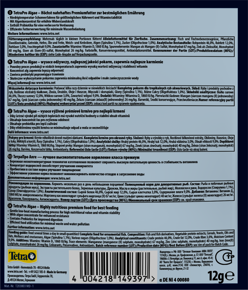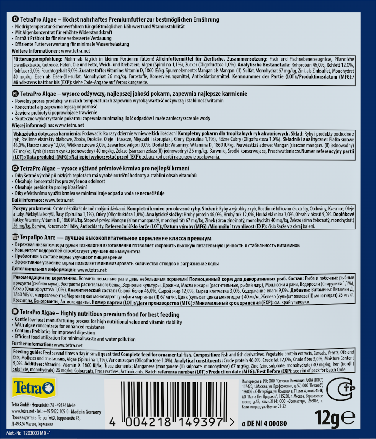 Высококачественный полноценный корм изготавливается по бережной низкотемпературной технологии, что позволяет сохранить его высокую питательную ценность. Концентрат на основе водорослей укрепляет иммунитет.