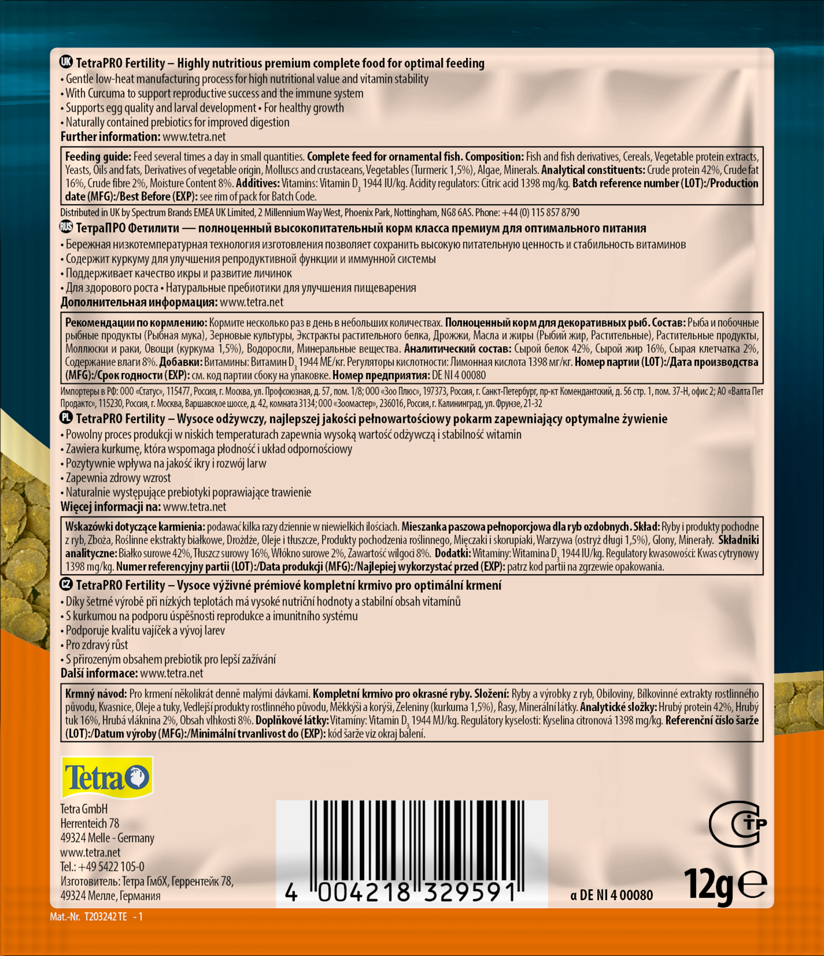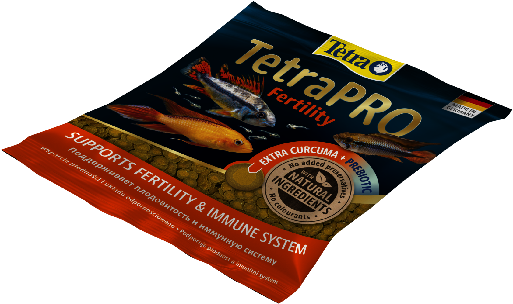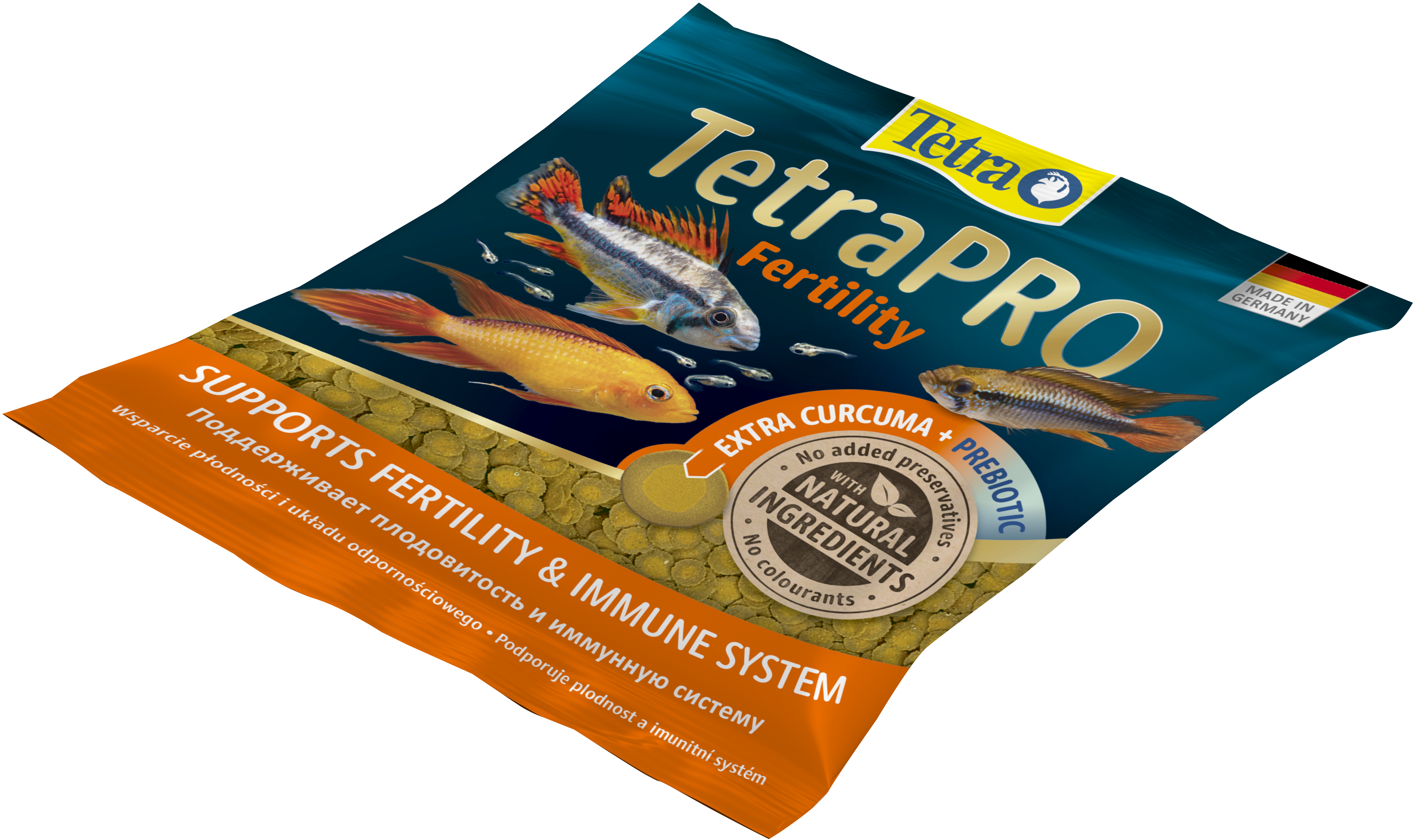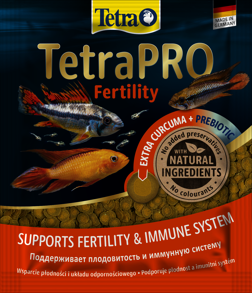 TetraPRO Fertility — это бережно изготовленный и высокопитательный полноценный премиальный корм с куркумой для поддержания репродуктивных функций рыбок, качества икры и развития личинок.
