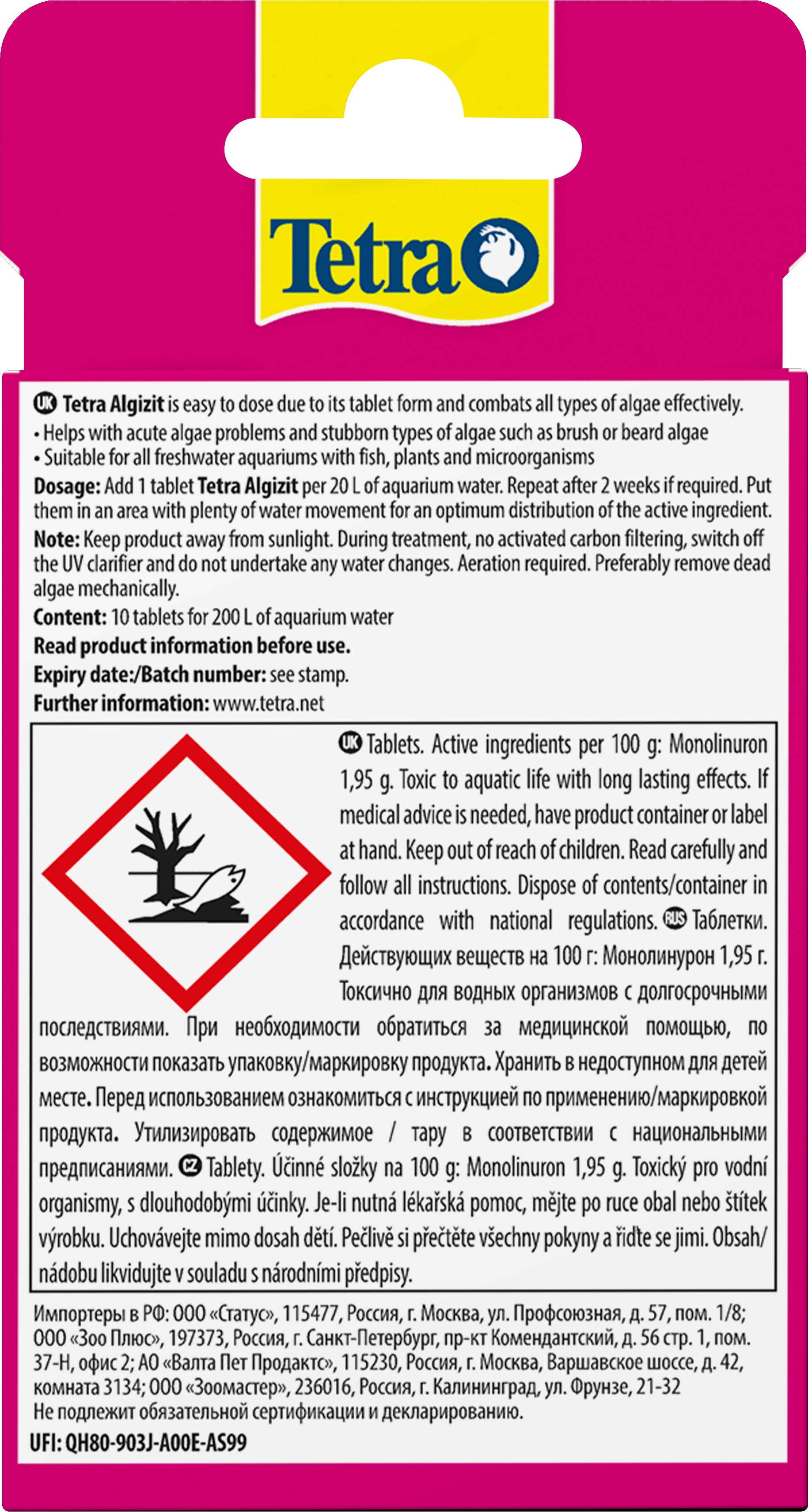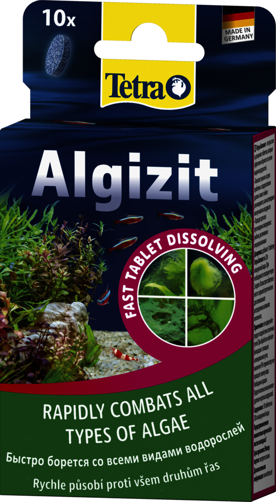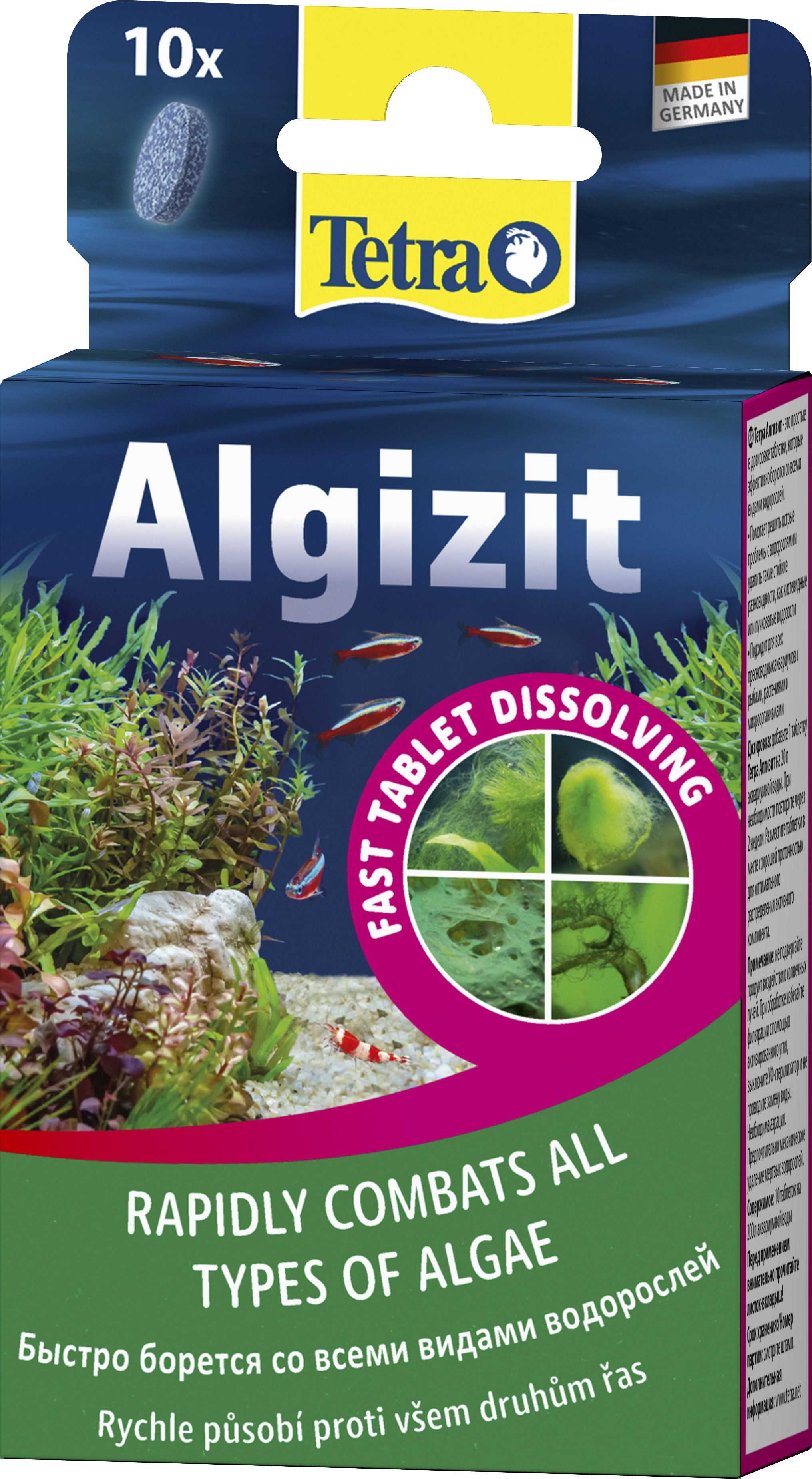 Tetra Algizit* provides rapid relief from even the most stubborn algae outbreaks in freshwater aquariums, tackling green, brown and red algae as well as challenging brush and beard varieties. Gentle on fish, plants and beneficial microorganisms when used as directed.