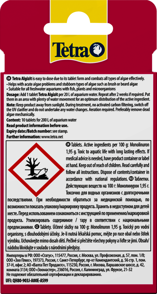 Tetra Algizit* provides rapid relief from even the most stubborn algae outbreaks in freshwater aquariums, tackling green, brown and red algae as well as challenging brush and beard varieties. The fast‑dissolving tablets release a highly active ingredient immediately upon contact with water, disrupting the metabolism of the algae, while remaining gentle on fish, plants and beneficial microorganisms when used as directed. Tetra Algizit* does not cloud or colour the water. Simply add one tablet per 20 L of aquarium water and place it in an area with good water movement to ensure optimum distribution. Repeat after two weeks if needed, and maintain aeration (for example with a Tetra APS air pump) while suspending activated carbon filtration, UV clarification and water changes during treatment. Remove dead algae mechanically to preserve water quality, and follow up with nutrient control - reducing phosphate and nitrate values with Tetra EasyBalance - to prevent future outbreaks. For ongoing prevention in small aquariums, consider Tetra Algetten*, or for larger setups, Tetra AlgoStop depot*. Always keep the product away from direct sunlight.