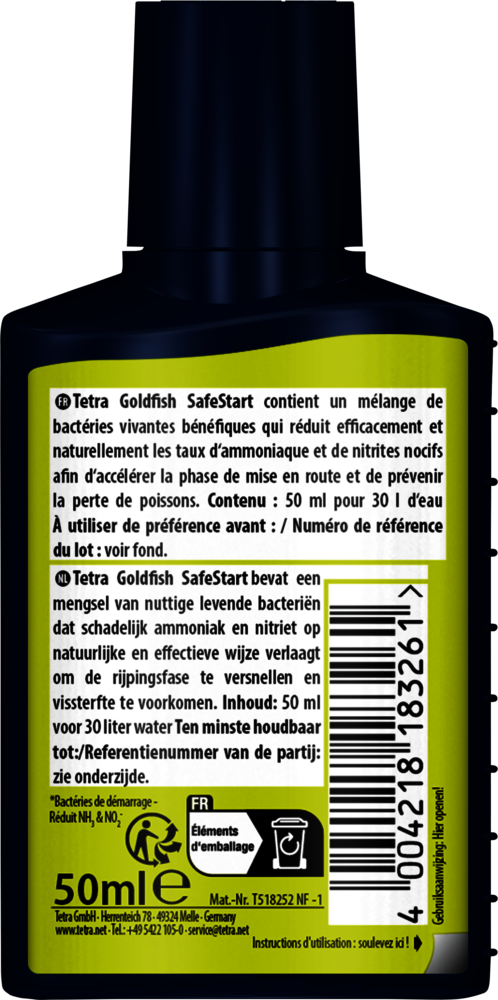 Tetra Goldfish SafeStart allows goldfish keepers to introduce their fish safely into a new aquarium without the running-in phase usually needed to establish a stable biological balance. The product contains living nitrifying bacteria that reduce harmful ammonia and nitrite levels in the water.