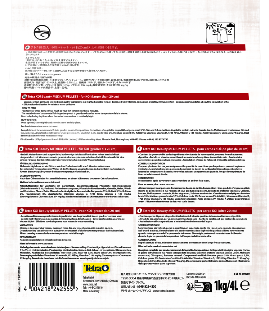 KOI sazanlarınızın günlük beslenmesi için özel olarak formüle edilmiş, yüksek kaliteli temel yem; uzun ve sağlıklı bir yaşam sürdürebilmeleri için ihtiyaç duydukları tüm temel besinleri sağlar. 20 cm ve üzeri KOI balıkları için uygundur.Temel besinler, vitaminler ve buğday özü açısından zengin olan bu peletler, sağlıklı büyüme için gerekli enerjiyi sağlarken, erken yaştan itibaren güçlü bir bağışıklık sisteminin gelişimini destekler. Karbonhidrat ilavesi, KOI sazanlarının özel ihtiyaçlarına uygun ek bir enerji kaynağı işlevi görür. Ayrıca, karotenoidler balıklarınızın göz alıcı renklerini daha da belirginleştirir.Optimal sindirilebilirlik için tasarlanan Tetra KOI Beauty Medium peletleri, verimli yem dönüşümüne katkı sağlar; böylece gölet suyunun temiz kalmasına ve mükemmel su kalitesinin korunmasına yardımcı olur. Peletler hızla yumuşar, bu da 20 cm ve üzeri KOI balıklarının onları kolayca tüketmesini sağlar.Balıklarınıza, renklendirici veya ilave koruyucu içermeyen yüksek kaliteli içeriklerle hazırlanmış benzersiz bir formül sunduğunuzu bilmenin verdiği iç huzurunun keyfini çıkarın – optimum büyüme için!