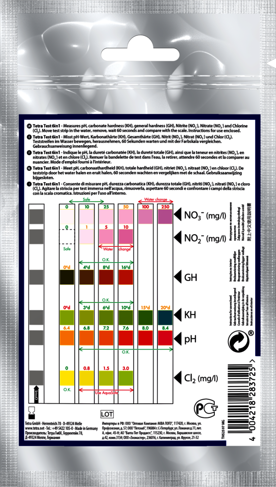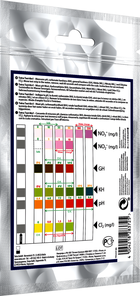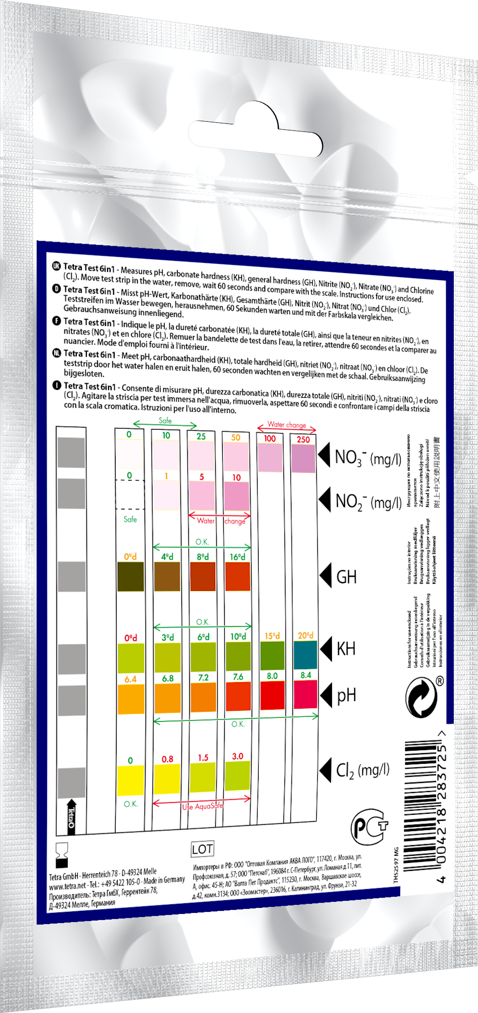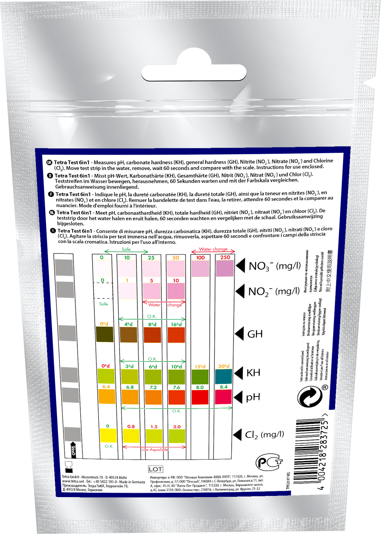Şeritlerin kullanımı son derece basittir: bir veya iki saniye suda döndürün, çıkarın ve fazla suyu sallayın. Sonra klor değerini okumak için kaptaki (25'li paket) veya ambalajdaki (10'lu paket) renk şemasını kullanın. 60 saniye sonra diğer beş değeri okuyabilirsiniz. Hepsi kabul edilebilir aralık dahilindeyse, her şey harika! Değerlerden herhangi biri bu aralığın dışında kalırsa, talimat broşürü ve Tetra web sitesi https://www.tetra.net/en/en/discover/tools/practical-tools/care-system size ne yapmanız gerektiğini söyleyecektir. Değerleri hesaplamak için Tetra Aquatics uygulamasını kullanırsanız, uygulama otomatik olarak size uygun çözümler önerecektir.