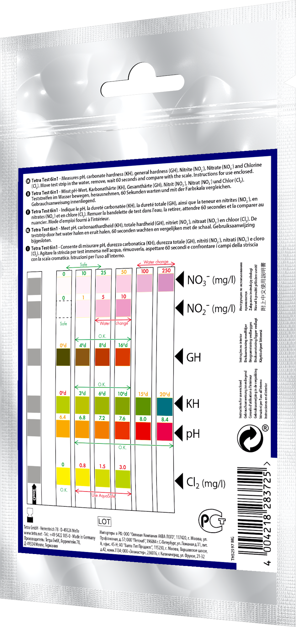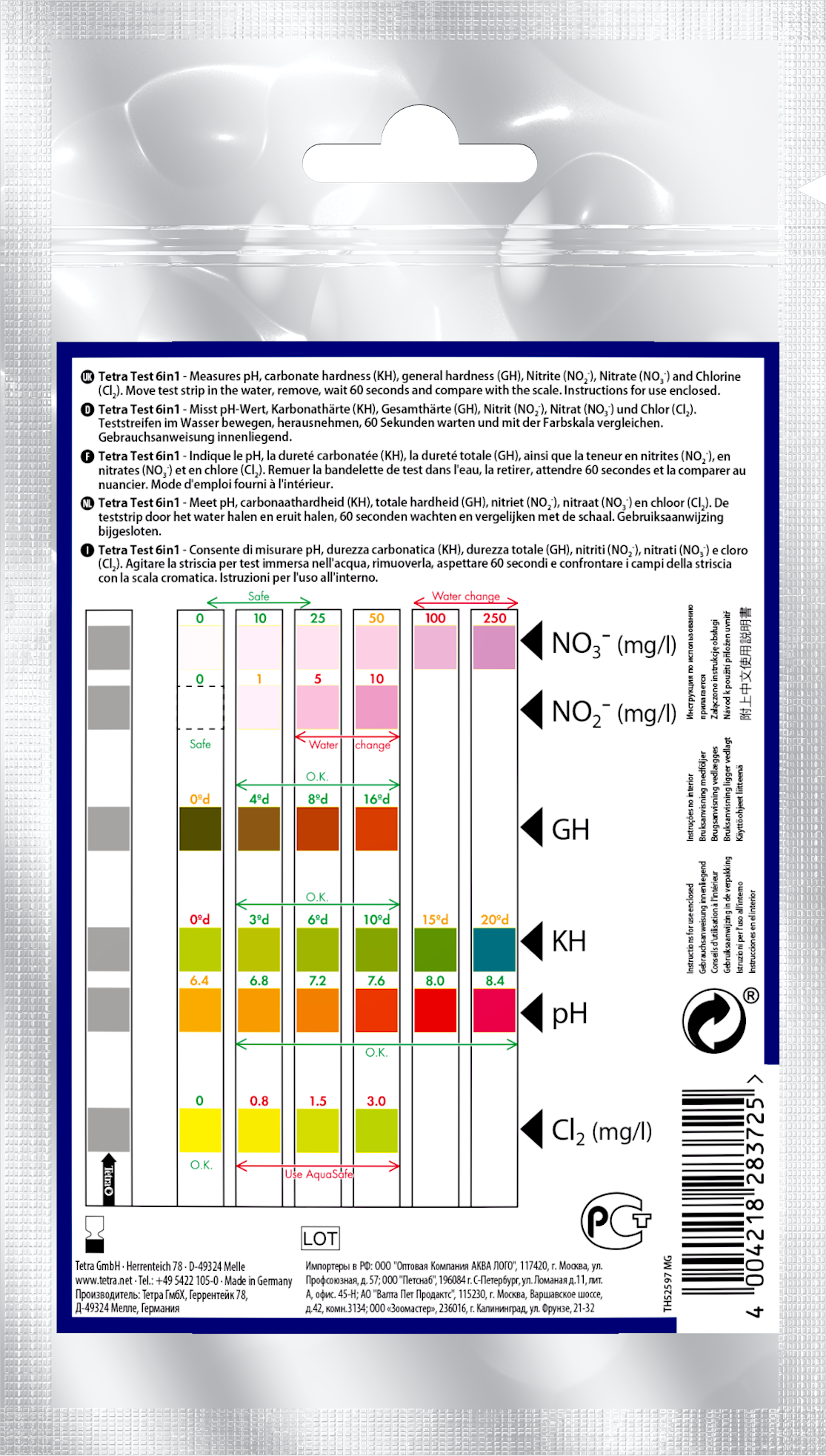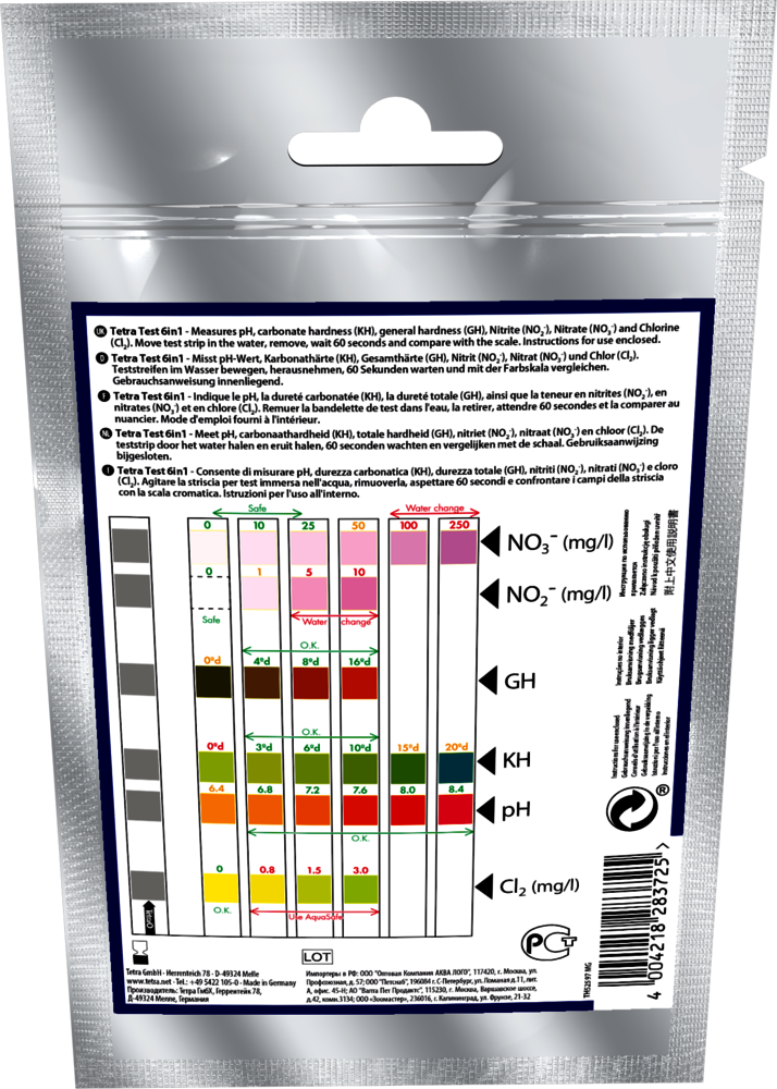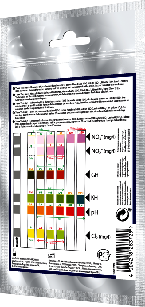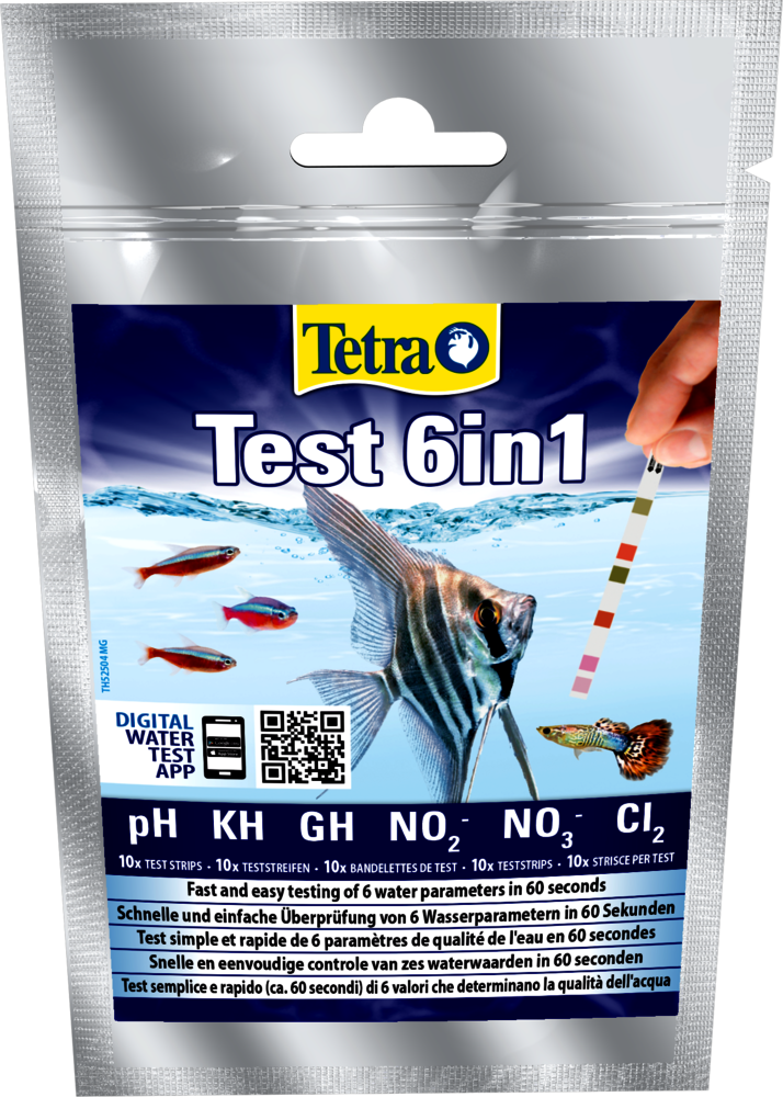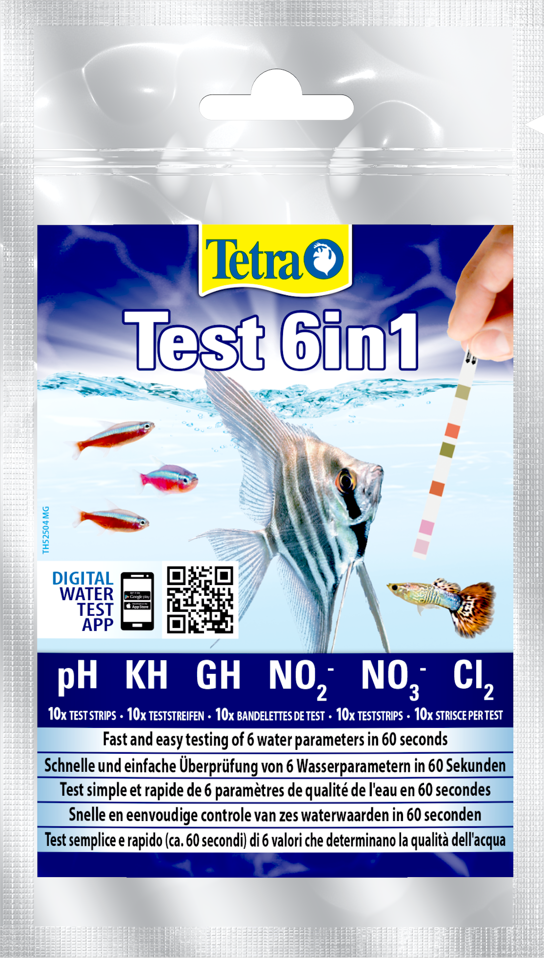Akvaryum suyu kalitesini 60 saniyede hızlı ve kolay bir şekilde kontrol etmek için su testi: test şeritleri pH'ı, karbonat sertliğini (KH), genel sertliği (GH), nitriti (NO2-), nitratı (NO3-) ve klorini (Cl2) ölçer,