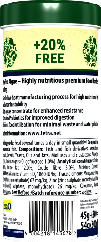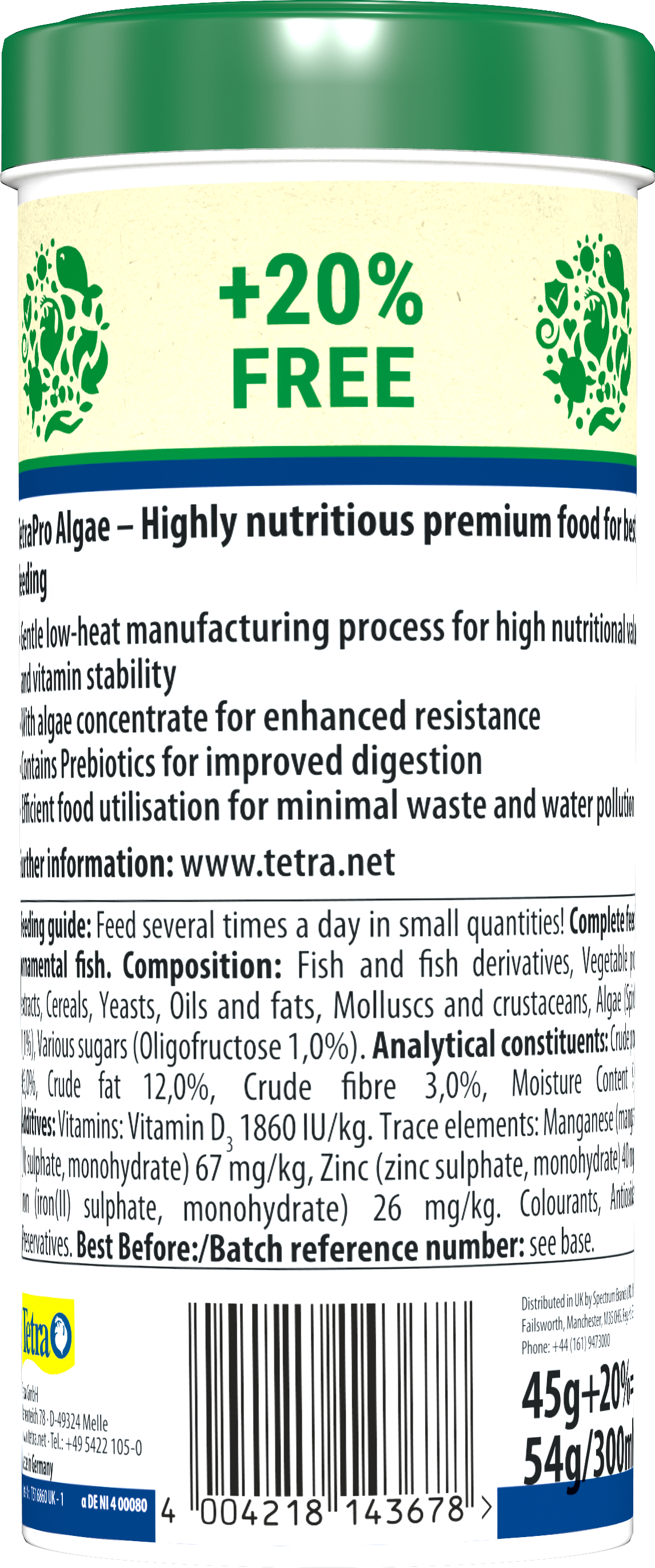 Balık ve balık yan ürünleri, Bitkisel albümin ekstraktı, Tahıl, Mayalar, Sıvı ve katı yağlar, Yumuşakçalar ve kabuklu hayvanlar, Yosunlar (Spirulina 1,1%), Şeker (Oligofruktoz 1,0%).