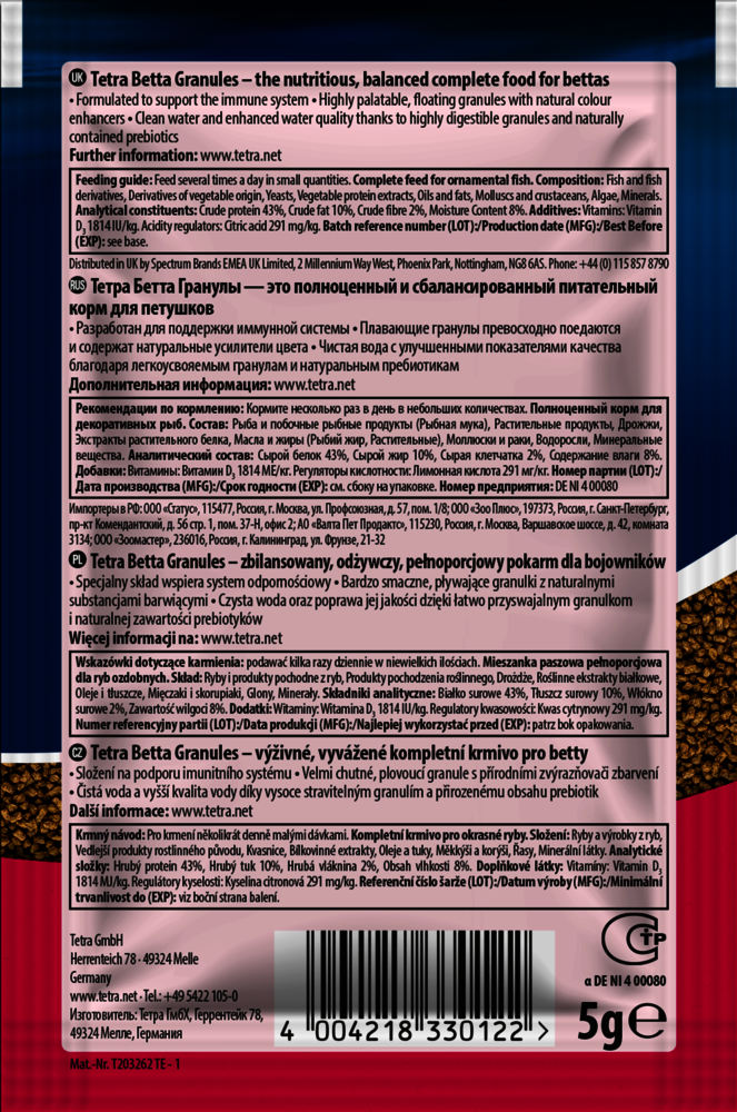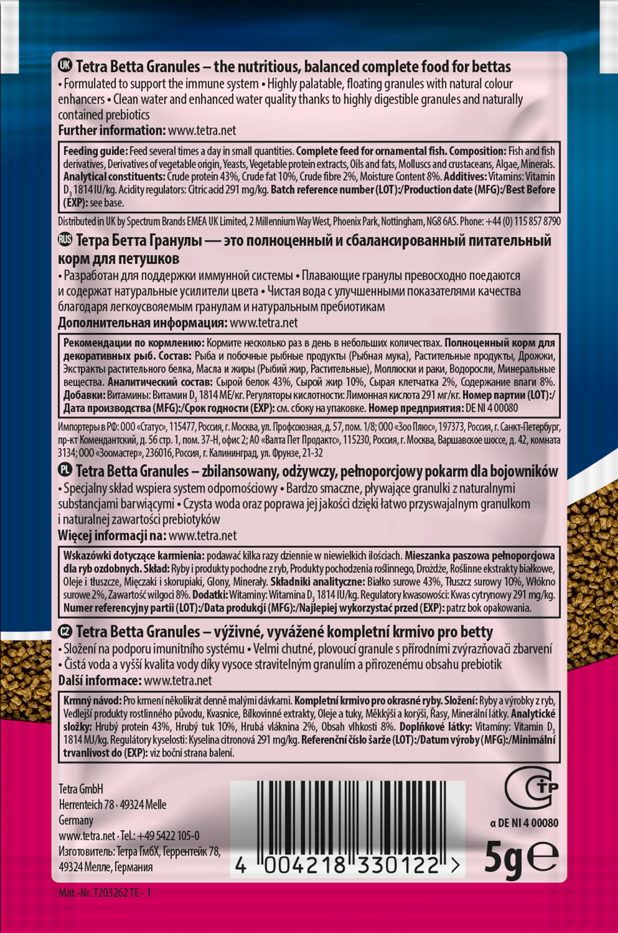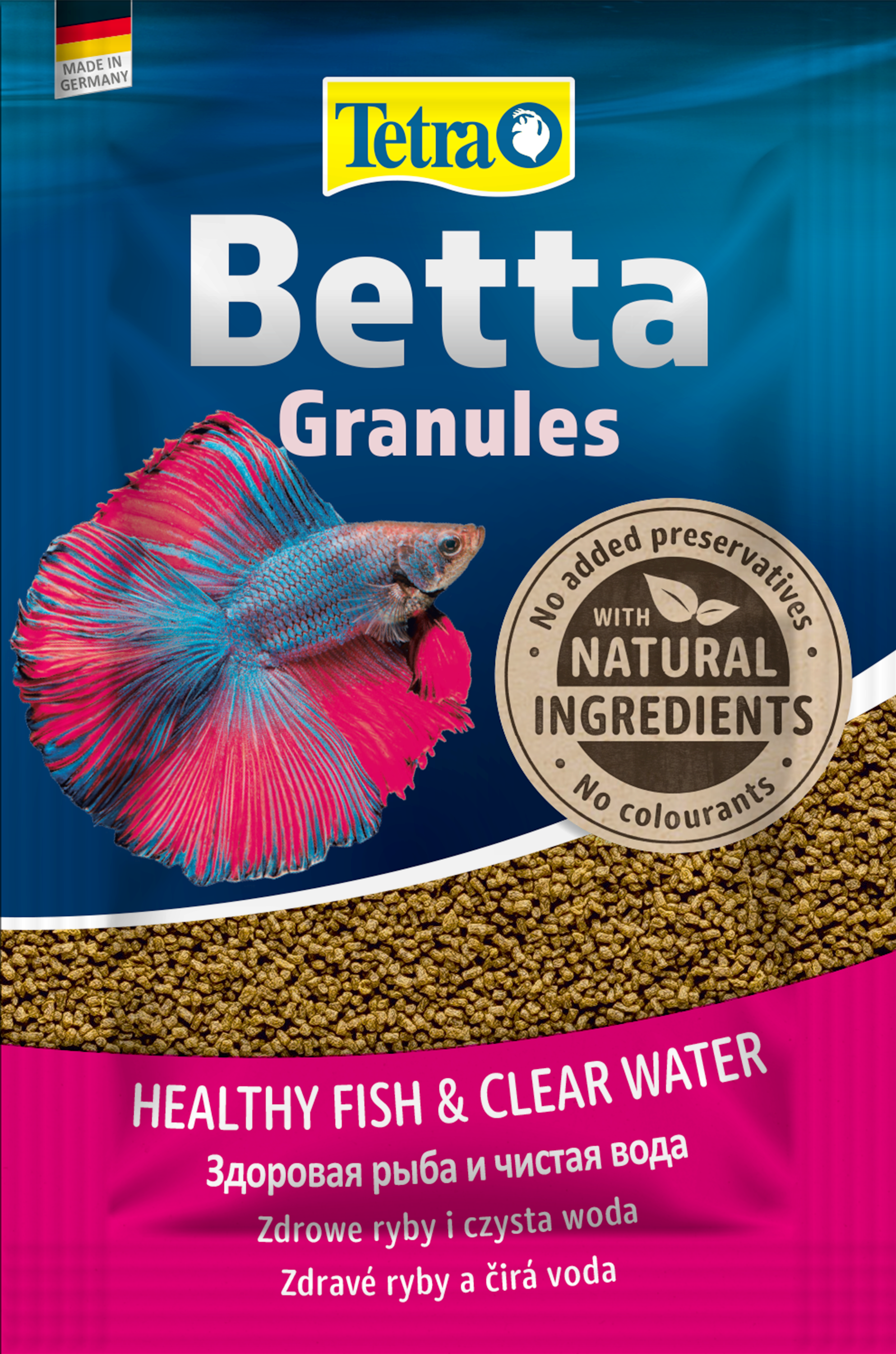 Tetra Betta Granules - це поживний збалансований гранульований корм, що забезпечує повноцінний раціон для щоденного годування всіх видів півників. Надзвичайно смачні плаваючі гранули містять натуральні підсилювачі кольору та розроблені для підтримки імунної системи півників. Корм містить пребіотики, які підтримують функції організму риб та перетравлювання їжі. Це забезпечує здоровий ріст, життєздатність і яскравість забарвлення риб, а також сприяє покращенню якості води. Унікальна рецептура з високоякісних натуральних інгредієнтів, без барвників та консервантів сприяє оптимальному росту та підвищенню життєздатності риб. З гранулами Tetra Betta ваші петушки будуть чудово зростати, а вода у вашому акваріумі залишатиметься чистою та прозорою.