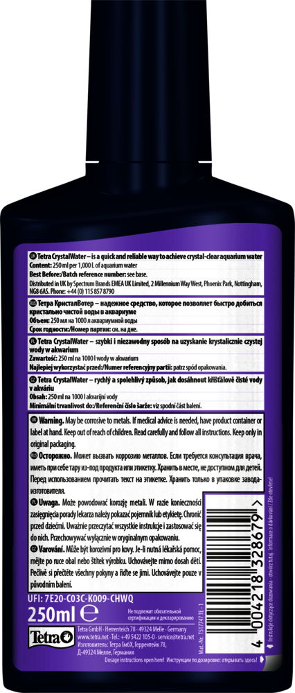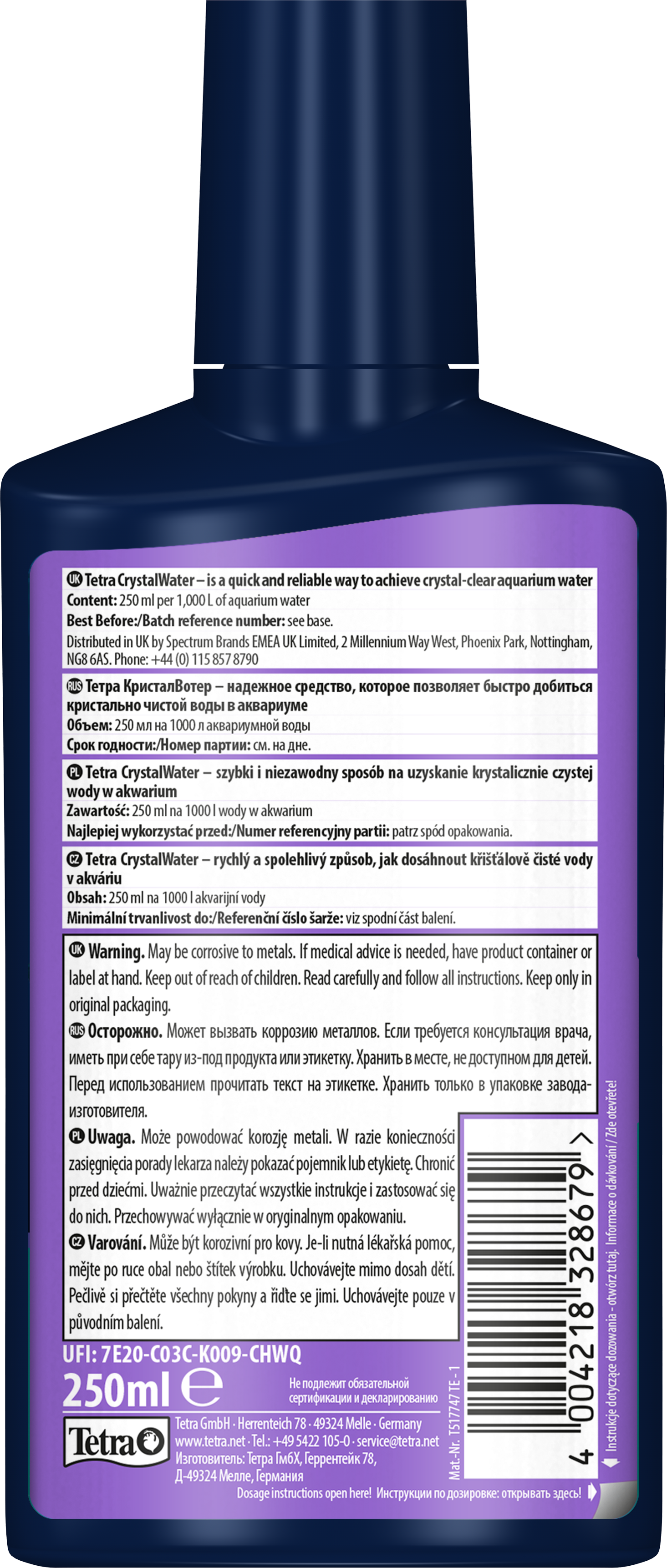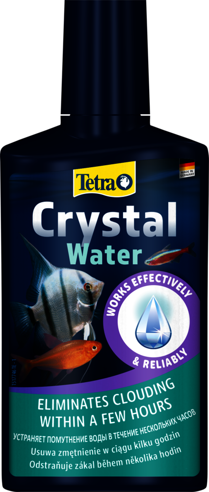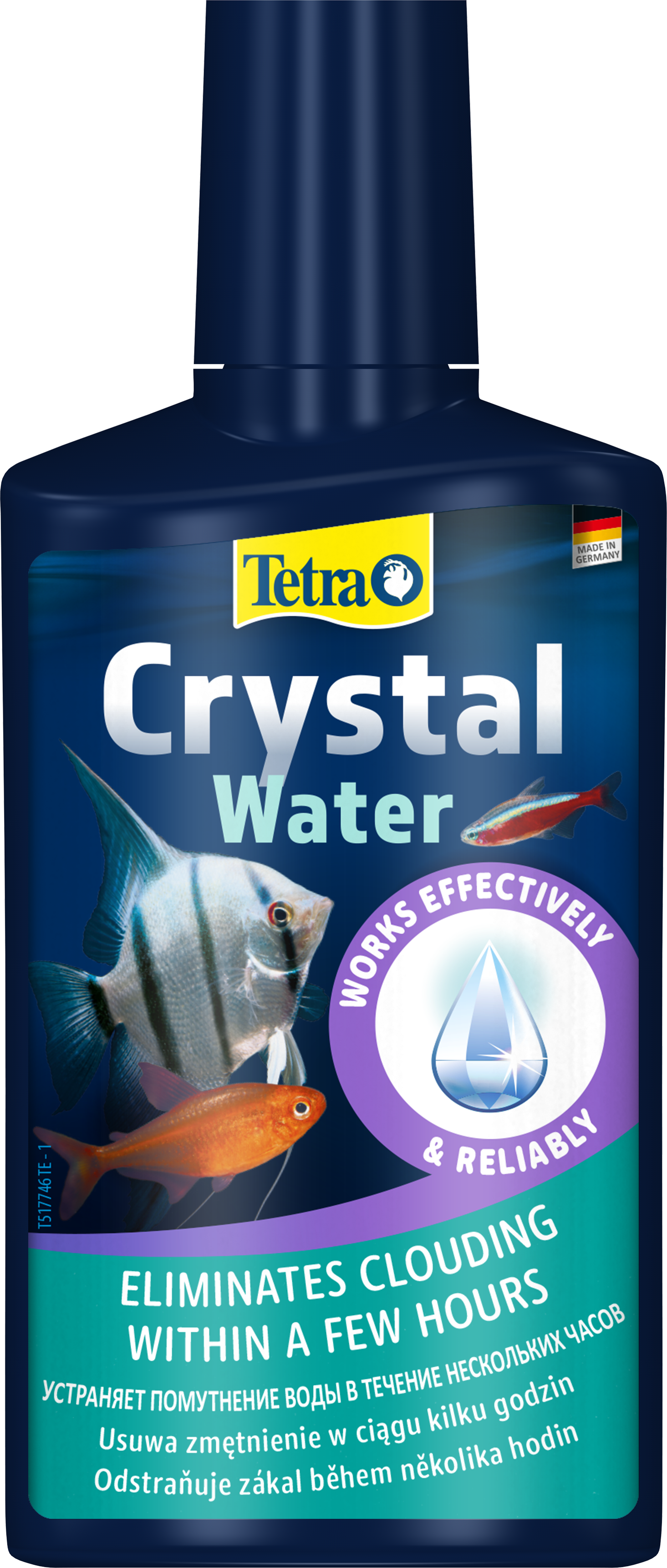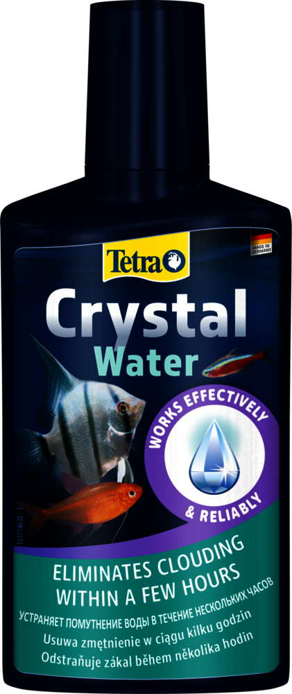 Відчуйте вражаючий ефект Tetra CrystalWater, який ефективно та надійно усуває помутніння акваріумної води. Спеціально активні інгредієнти Tetra зв'язують дрібні частинки бруду у воді, які потім можуть бути відфільтровані вашим акваріумним фільтром. Початковий ефект помітний вже через кілька годин, а кришталево чиста вода досягається протягом 6-12 годин.⏎Каламутна вода може бути спричинена різними факторами, включаючи мінеральне помутніння від зв'язаних глинистих частинок або органічне помутніння від відходів життєдіяльності риб, залишків їжі та рослинних решток, що гниють. Tetra CrystalWater бореться з усіма цими причинами за допомогою одного продукту. Для зменшення бактеріального помутніння Tetra рекомендує застосовувати Tetra FilterActive Bacteria. Крім того, забезпечте належну аерацію акваріума, наприклад, за допомогою повітряного насоса Tetra APS. ⏎Tetra CrystalWater підходить для всіх прісноводних акваріумів. Не використовуйте цей продукт в акваріумах з безхребетними (наприклад, равликами, креветками та іншими ракоподібними). Зберігайте Tetra CrystalWater у недоступному для дітей місці.⏎Для досягнення оптимальних результатів добре збовтайте Tetra CrystalWater перед використанням і дотримуйтесь детальних інструкцій. Для усунення помутніння додайте 5 мл на 10 л акваріумної води. Якщо значення KH дорівнює або нижче 3 °dH, використовуйте 2,5 мл на 10 л. Tetra рекомендує використовувати Tetra Test 7in1 для перевірки параметрів води у вашому акваріумі. Зачекайте щонайменше 48 годин між застосуваннями та регулярно чистіть фільтр для досягнення оптимальних результатів. Під час дії Tetra CrystalWater може утворювати нешкідливе помутніння, яке розсіюється протягом кількох годин.