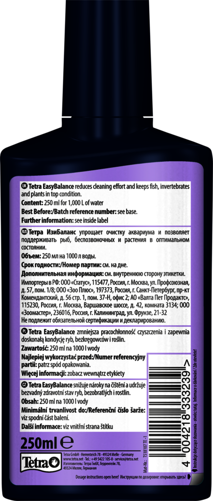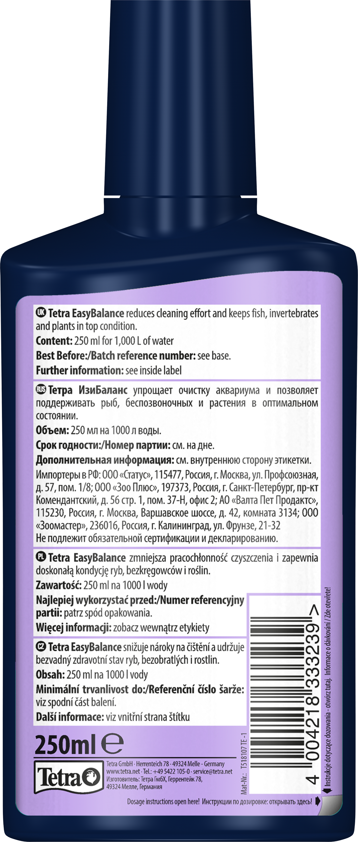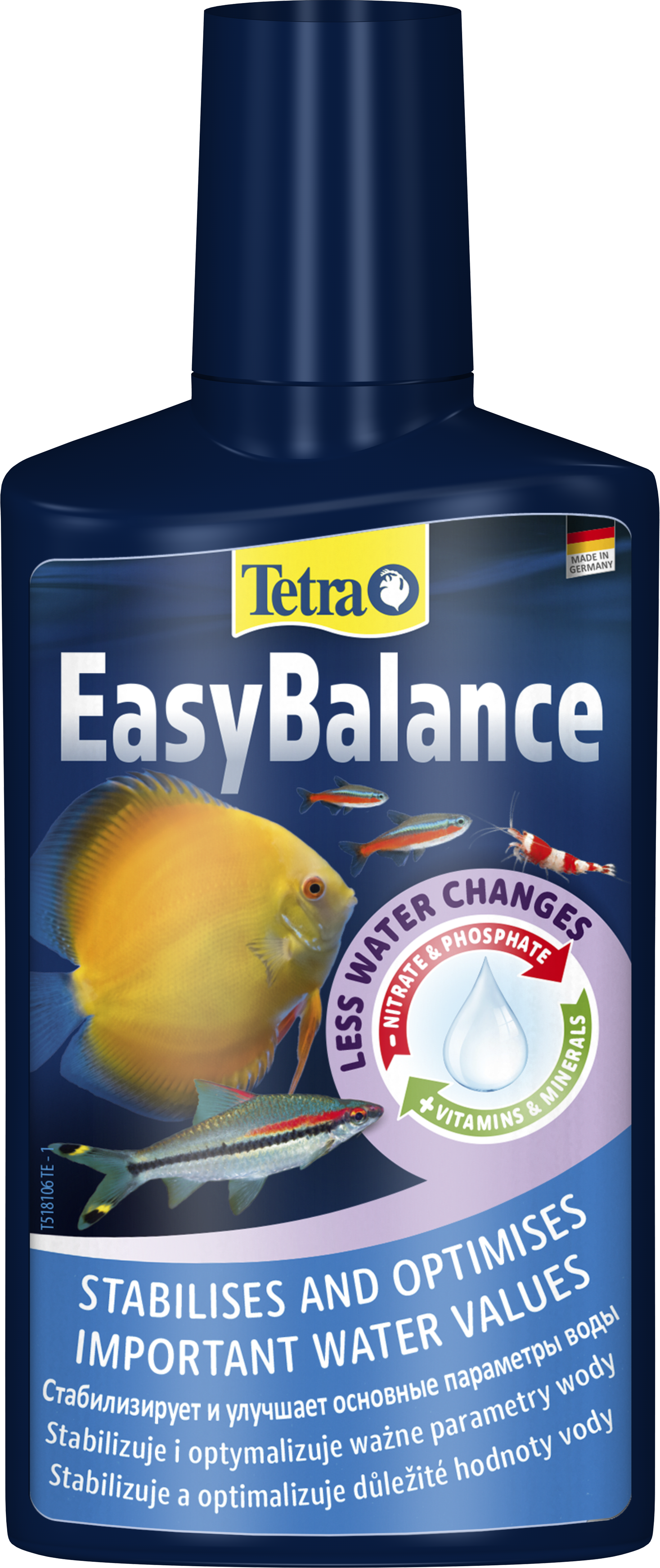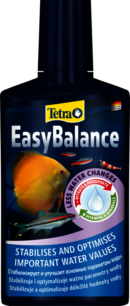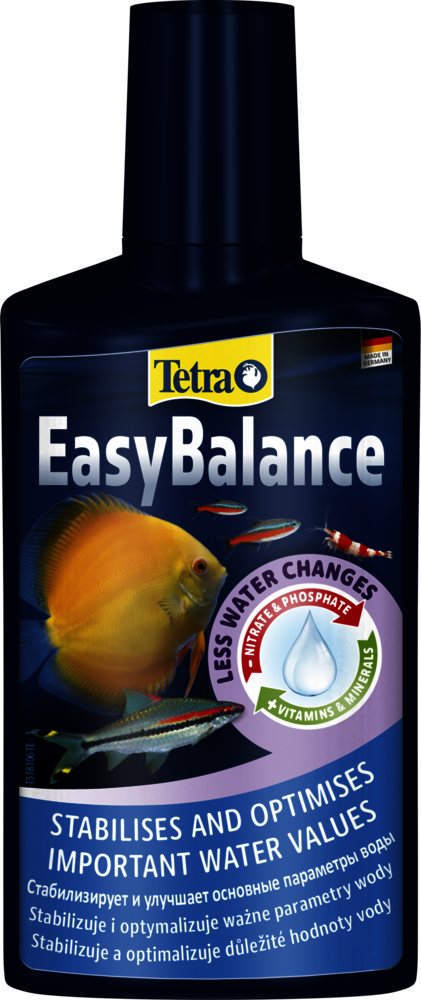 Tetra EasyBalance is a unique water care solution that keeps your aquarium healthy and in balance with minimal effort. No matter if you are a beginner or an advanced aquarist: By reliably stabilising important water values such as carbonate hardness (KH) and pH, Tetra EasyBalance makes caring for your aquarium much easier. Aquariums with soft water, such as those housing sensitive species like discus fish, particularly benefit from the KH-stabilising effect, as it ensures stable and safe conditions over time. Reducing substances like nitrate and phosphate not only prevents algae growth but also protects fish and plants from stress, ensuring they can thrive in a stable, natural environment. Weekly use of Tetra EasyBalance reduces the number of partial water changes needed. This way, Tetra EasyBalance makes your hobby less time-consuming and helps to save tap water, contributing to more environmentally friendly fishkeeping. Additionally, the product enriches the aquarium water with essential vitamins, trace elements and minerals that fish, invertebrates and plants need for a healthy life. For best results, Tetra EasyBalance should be shaken well before use and added once a week at a dosage of 2.5 ml per 10 L of aquarium water. A sufficient oxygen supply should be ensured, for example by using the Tetra APS air pumps. Within the liquid, pale granules may be visible; they sink to the bottom of the aquarium and are completely harmless to fish and invertebrates, even if ingested. It is important to note that Tetra EasyBalance is not a tap water conditioner and therefore should always be used alongside Tetra AquaSafe whenever new tap water is added. Check the water values in your aquarium regularly with the Tetra Test 7in1.