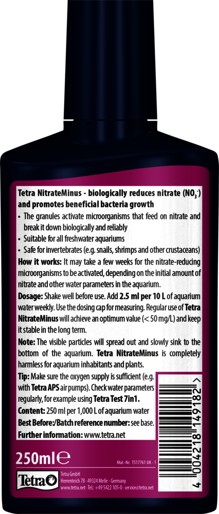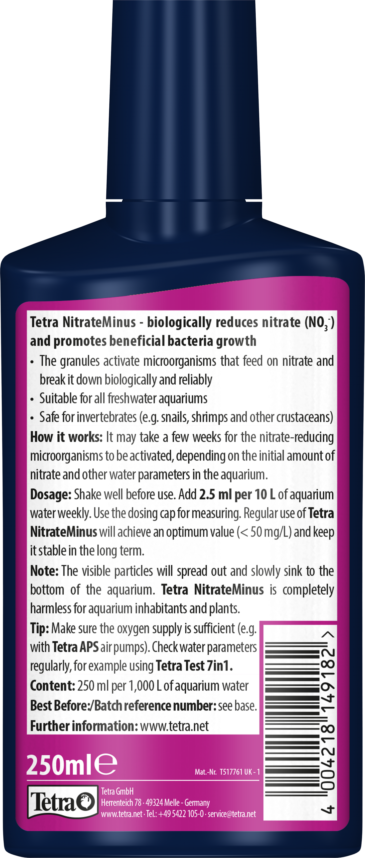 Tetra NitrateMinus розроблений для природного та надійного зменшення вмісту поживних нітратів для водоростей (NO3-). Таким чином, він покращує якість води у вашому прісноводному акваріумі та бореться з ростом водоростей. Вміщені частинки активують корисні мікроорганізми, які харчуються нітратами, розкладаючи їх біологічним шляхом. Залежно від початкової концентрації нітратів та інших параметрів води, цей процес може зайняти кілька тижнів. Видимі частинки розсіюватимуться і поступово опускатимуться на дно акваріума. Tetra NitrateMinus безпечний для всіх риб і безхребетних. Він навіть сприяє росту природних корисних бактерій, які використовуються безхребетними як джерело їжі.⏎Щоб забезпечити оптимальну продуктивність, підтримуйте достатній рівень кисню у вашому акваріумі - розгляньте можливість використання повітряних насосів Tetra APS. Регулярно контролюйте параметри води за допомогою Tetra Test 7in1, щоб відстежувати рівень нітратів та загальну якість води.⏎Перед застосуванням добре збовтати. Додавайте 2,5 мл на 10 л акваріумної води щотижня, використовуючи дозуючий ковпачок з комплекту для точного вимірювання. Постійне використання Tetra NitrateMinus допоможе вам досягти і підтримувати оптимальний рівень нітратів менше 50 мг/л протягом тривалого часу..⏎Обирайте Tetra NitrateMinus для ефективного контролю нітратів у вашому прісноводному акваріумі.