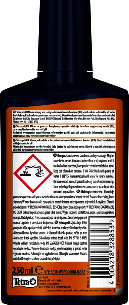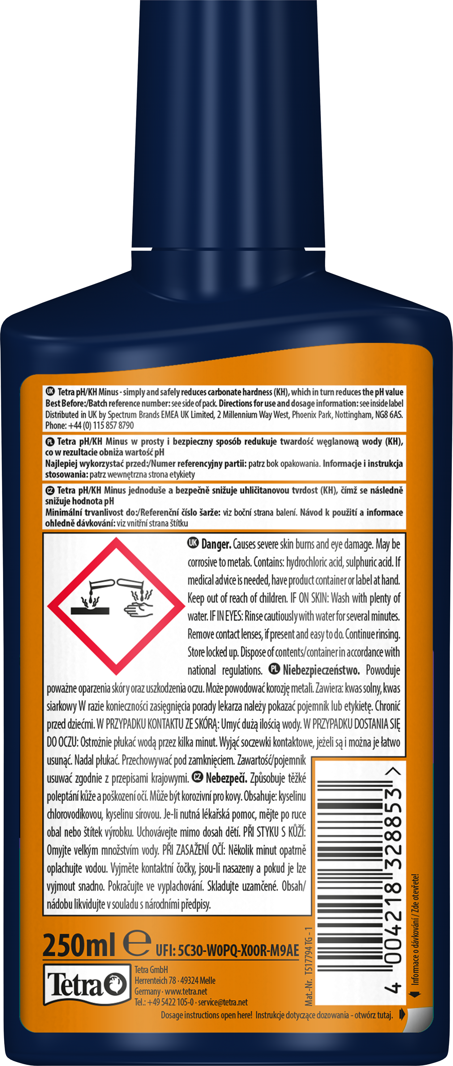 Tetra pH/KH Minus - це надійне рішення для безпечного зниження карбонатної жорсткості (KH) у вашому акваріумі. Знижуючи KH, значення pH також автоматично знижується, створюючи оптимальні параметри води для певних видів риб. Багато прісноводних декоративних риб процвітають у середовищі з KH 4° dH та pH нижче 7,5, що робить цей продукт необхідним для підтримання відповідних умов життя.⏎Щоб використовувати Tetra pH/KH Minus, додайте до 25 мл на 100 л акваріумної води, використовуючи дозуючий ковпачок для точного вимірювання. Повторюйте це кожні 2-3 дні, поки не буде досягнуто бажаного рівня KH, оскільки кожне дозування знижує KH приблизно на 2 °dH. Під час лікування забезпечте належну аерацію, використовуючи лінійку Tetra APS, та уникайте додавання CO2. Для визначення параметрів води у вашому акваріумі використовуйте, наприклад, Tetra Test 7в1. Регулярне тестування параметрів води важливе для підтримання рівня KH в межах 2 - 4 °dH, щоб запобігти значному падінню pH.⏎Для довготривалого контролю KH та pH додавайте по 5 мл на 100 л кожні 2-3 дні, що поступово знизить KH приблизно на 0,4 °dH за одне дозування. Послідовне застосування допоможе досягти стабільних водних умов для ваших риб.•⏎Будь ласка, поводьтеся з Tetra pH/KH Minus з обережністю, оскільки він може спричинити серйозні опіки шкіри та пошкодження очей. Зберігайте в недоступному для дітей місці, а якщо необхідна медична консультація, тримайте під рукою контейнер або етикетку з продуктом. У разі потрапляння на шкіру або в очі ретельно промийте їх водою.⏎Tetra pH/KH Minus - це ефективний спосіб контролювати якість води у вашому акваріумі, забезпечуючи належне середовище для ваших водних мешканців.