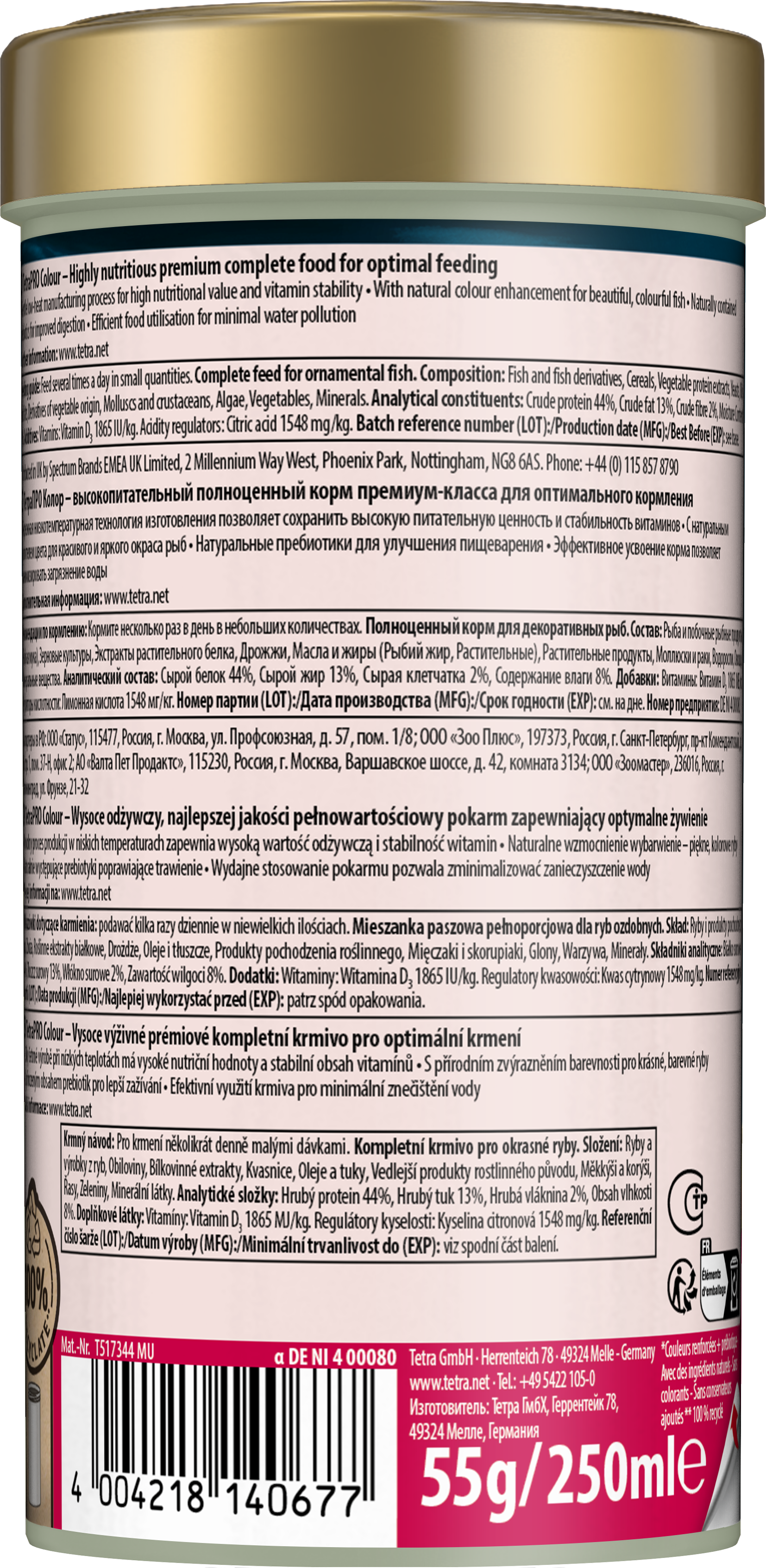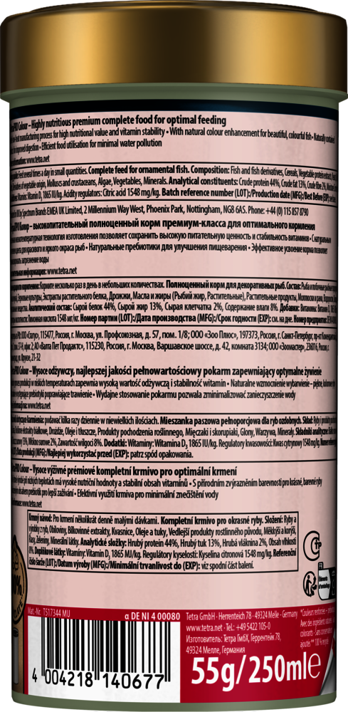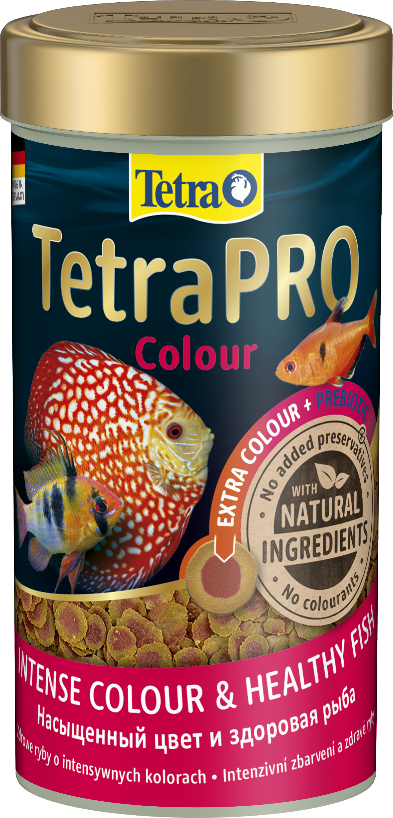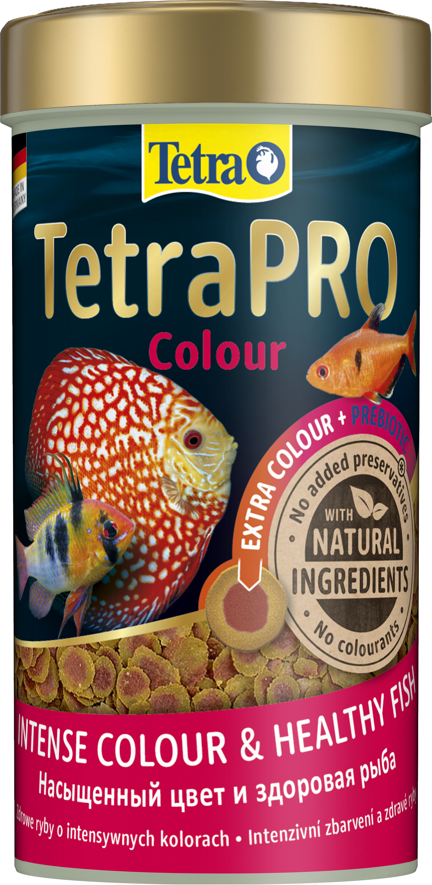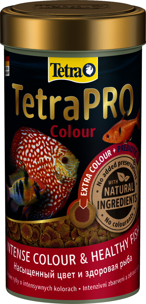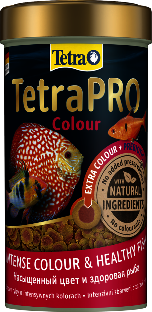 Асортимент TetraPRO встановив новий стандарт у харчуванні риб. Повнораціонний корм преміум-класу виготовляється з використанням делікатного низькотемпературного процесу. Цей особливий метод надає TetraPRO Colour дуже високу поживну цінність і стабільність вітамінів. Концентрат кольору містить каротиноїди та підтримує природне яскраве забарвлення для красивих риб. Двоколірні мульти-чіпси також поглинають менше води, ніж звичайний пластівчастий корм, що збільшує вміст поживних речовин на одиницю об'єму. TetraPRO Colour пропонує оптимізоване співвідношення білків і жирів. Це гарантує, що риба може використовувати білок саме для нарощування м'язів, забезпечуючи достатню кількість незамінних жирних кислот для вироблення енергії. Мульти-чіпси Tetra також кришаться набагато менше, ніж звичайні пластівці, що значно зменшує кількість харчового пилу в банках. Крім того, пребіотики, що містяться в кормі, спеціально підтримують ріст і метаболізм корисних для здоров'я бактерій у кишковому тракті риб. Завдяки своїм смаковим якостям і високій засвоюваності мульти-чіпси підтримують чистоту води в акваріумі. TetraPRO Colour виготовлений з високоякісних інгредієнтів, не містить барвників та консервантів.